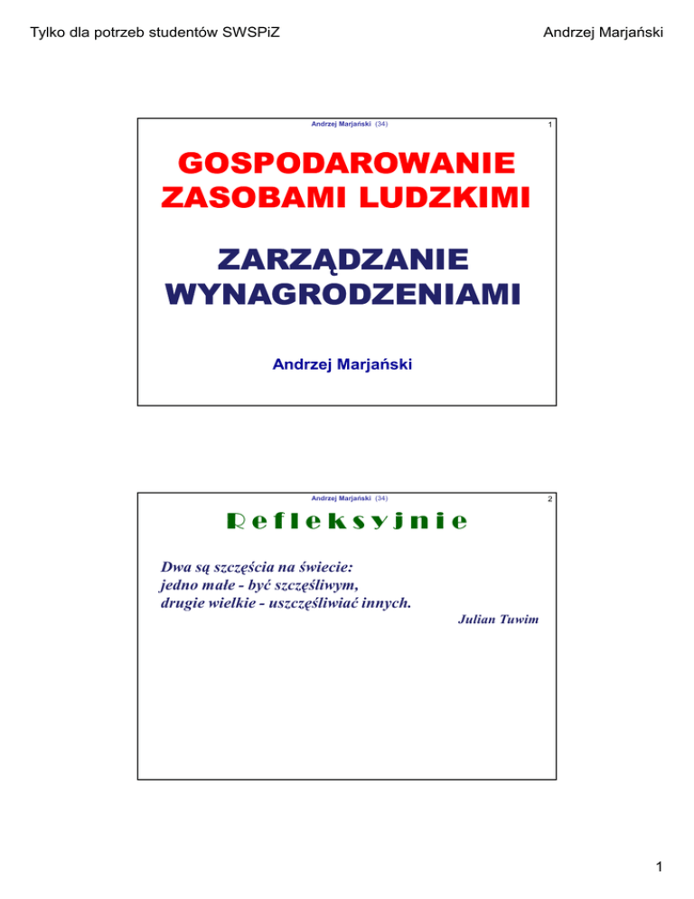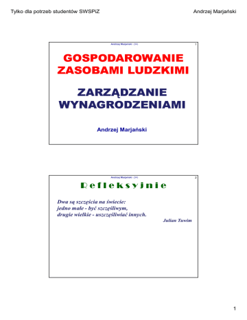 Tylko dla potrzeb studentów SWSPiZ Andrzej Marjański Andrzej Marjański (34) 1 GOSPODAROWANIE ZASOBAMI LUDZKIMI ZARZĄDZANIE WYNAGRODZENIAMI Andrzej Marjański Andrzej Marjański (34) 2 Refleksyjnie Dwa są szczęścia na świecie: jedno małe - być szczęśliwym, drugie wielkie - uszczęśliwiać innych. Julian Tuwim 1 Tylko dla potrzeb studentów SWSPiZ Andrzej Marjański Andrzej Marjański (34) 3 Agenda Pojęcie i rodzaje wynagrodzeń Kryteria podziału wynagrodzeń Funkcje wynagrodzeń Systemy płac Czynniki wpływające na poziom wynagrodzeń Andrzej Marjański (34) 4 Pojęcie i rodzaje wynagrodzeń Pojęcie wynagrodzenia Wąskie Szerokie 2 Tylko dla potrzeb studentów SWSPiZ Andrzej Marjański Andrzej Marjański (34) 5 Wąskie pojęcie wynagrodzenia Wynagrodzenie za wykonywaną pracę Pojęcie stosowane w prawie pracy Wg Kodeksu pracy wynagrodzenie powinno odpowiadać: Rodzajowi wykonywanej pracy Kwalifikacjom wymaganym przy jej wykonywaniu Uwzględniać ilość i jakość wykonywanej pracy Jest należne tylko za pracę wykonaną Wynagrodzenie za pracę jest obowiązkowe, wypłacane okresowo świadczenie za stosunku pracy Ma charakter przysparzająco-majątkowy Jest należne pracownikowi od pracodawcy * Andrzej Marjański (34) 6 Wynagrodzenie – szerokie ujęcie Wszelkie formy świadczeń firmy na rzecz pracownika Stosunki łączące pracownika z pracodawcą są szerokie i nie ograniczają się tylko do stosunku pracy Związane z ogółem zależności łączących pracownika i przedsiębiorstwo Kierownictwo może gratyfikować kierownictwo za pracę, gotowość do pracy, uzyskiwane wyniki, zachęcać do jeszcze lepszej i wydajniejszej pracy. Charakter gratyfikacji Majątkowy i niemajątkowy Nie muszą mieć stałej częstotliwości 3 Tylko dla potrzeb studentów SWSPiZ Andrzej Marjański Andrzej Marjański (34) 7 Kryteria podziału wynagrodzeń Indywidualne kierowane do konkretnego pracownika, Wynikają z osobistych kwalifikacji i efektów pracy zatrudnionego Grupowe Ogół świadczeń skierowanych do grupy ludzi Pracownicy sami dzielą muszą podzielić między siebie wynagrodzenie przypadające na grupę * Andrzej Marjański (34) 8 Postać wynagrodzeń Finansowe – świadczenia w gotówce Pensja Premia Nagroda pieniężna Ekwiwalenty pieniężne za świadczenia niepieniężne Pozafinansowe – świadczenia w naturze Rozmaite dobra Zakupione usługi Wyróżnienia * 4 Tylko dla potrzeb studentów SWSPiZ Andrzej Marjański Andrzej Marjański (34) 9 Tytuł z jakiego przysługuje wynagrodzenie Za pracę – decyduje ilość i jakość wykonanej pracy Nie związane bezpośrednio z wkładem pracy – nagrody jubileuszowe, dodatki stażowe, itp. * Andrzej Marjański (34) 10 Termin świadczenia Wynagrodzenia bieżące – świadczenia stałe, powtarzane z określoną częstotliwością (dniówka, tygodniówka, miesięcznie) Pensja Premia regulaminowa Wynagrodzenia odroczone – nie maja stałego charakteru, mogą być jednorazowe, lub przekazywane w długich okresach (roczne, kilkuletnie) Udział w zysku Polisa ubezpieczeniowa papiery wartościowe (akcje, obligacje) * 5 Tylko dla potrzeb studentów SWSPiZ Andrzej Marjański Andrzej Marjański (34) 11 Możliwość lub brak możliwości wyboru Bez możliwości wyboru – większość wynagrodzeń Z możliwością wyboru – tzw. kafeteryjne systemy wynagradzania Do wyboru pracownik ma listę świadczeń Wybiera dowolne świadczenia pokrywane do określonej kwoty * Andrzej Marjański (34) 12 Warunki otrzymania wynagrodzenia Wynagrodzenia warunkowe- spełnienie z góry określonych warunków Wynagrodzenia uznaniowe – świadczenia, których ilość i rodzaj nie są określone z góry, a zależą od uznania przełożonego Nie ma pewności uzyskania Nie wie jak może być wielkość świadczenia Nie wie kiedy je otrzyma • Ważny instrument motywacyjnego oddziaływania kierowników na podwładnych * 6 Tylko dla potrzeb studentów SWSPiZ Andrzej Marjański Andrzej Marjański (34) 13 Jawność czy tajność wynagrodzeń Jawne – wiedzą o nich wszyscy współpracownicy otrzymującego świadczenie Utajnione – pracownicy znają dobrze zasady wynagradzania w przedsiębiorstwie, ale nie wiedzą jakie pensje otrzymują koledzy i przełożeni Cel utajnienia wynagrodzeń: skoncentrowanie uwagi ludzi na ich własnej pracy odejście od analizowania wkładu innych ludzi ułatwienie kierownikom podejmowania decyzji o podziale funduszy na nagrody. Andrzej Marjański (34) 14 Wpływ różnych czynników na wynagrodzenia O poziomie, rodzaju i strukturze decyduje kilka czynników: Poziom rozwoju gospodarczego kraju Koniunktura gospodarcza Możliwości finansowe przedsiębiorstwa oczekiwania i potrzeby pracowników Naciski związków zawodowych Przepisy podatkowe Poziom ubezpieczeń społecznych Poziom płacy minimalnej Narzuty na wynagrodzenia ( fundusz pracy, fundusz gwarantowanych świadczeń pracowniczych, PFRON, Rynek pracy - konkurencyjność płacowa firmy * 7 Tylko dla potrzeb studentów SWSPiZ Andrzej Marjański Andrzej Marjański (34) 15 Funkcje wynagradzania Cztery podstawowe funkcje wynagradzania : Motywacyjna Dochodowa Kosztowa Społeczna * Andrzej Marjański (34) 16 Funkcja motywacyjna Instrument kształtowania zachowań i postaw pracowników zgodnie z oczekiwaniami pracodawcy Skuteczność i siła motywacji zależy od istnienia związku pomiędzy wynikami pracy a wynagrodzeniem. Dzięki wynagrodzeniom przedsiębiorstwo ma możliwość wewnętrznego oddziaływania na własnych pracowników i menedżerów Przedsiębiorstwo ma również możliwość kształtowania własnego wizerunku na lokalnym rynku pracy * 8 Tylko dla potrzeb studentów SWSPiZ Andrzej Marjański Andrzej Marjański (34) 17 Funkcja dochodowa Wynagrodzenia stanowi podstawowe, często jedyne źródło utrzymania pracowników Dochody otrzymywane z pracy umożliwiają zaspokajanie różnorodnych potrzeb pracowników Andrzej Marjański (34) 18 Funkcja kosztowa Wynagrodzenia dla 