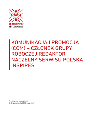 KOMUNIKACJA I PROMOCJA (COM) – CZŁONEK GRUPY ROBOCZEJ REDAKTOR NACZELNY SERWISU POLSKA INSPIRES Termin przesyłania aplikacji: do 31 października 2016, godz. 23.59 OPIS STANOWISKA Nazwa stanowiska: Redaktor/Redaktorka Naczelny Serwisu Polska Inspires Przełożony: Szef grupy roboczej COM Zespół Komunikacji i Promocji Projektu Jamboree 2023 poszukuje do współpracy osoby energetycznej o szerokich horyzontach i pełnej pomysłów. Osoby, która poprowadzi nową stronę promującą Polskę: jej naturę, kulturę, walory turystyczne, sukcesy naukowe, technologiczne i sportowe Polaków. Jak również zainspiruje do odwiedzenia Polski. Dla pełnej realizacji celów projektu wolontariusze będą wspoółpracowali z agendami Głównej Kwatery ZHP, które odpowiadają za poszczególne obszary działania, m.in.: Wydział Komunikacji i Promocji, Wydział Zagraniczny, Wydział Wsparcia Metodycznego, Wydział Inspiracji i Poradnictwa oraz Wydział Finansowo-Ekonomiczny. WYMAGANIA KWALIFIKACJE I DOŚWIADCZENIE Osoby aplikujące do tej roli powinny spełniać następujące wymagania: członkostwo w Związku Harcerstwa Polskiego; zaliczona służba instruktorska za poprzedni rok i pozytywna opinia bezpośredniego przełożonego; pozytywne doświadczenie w realizacji projektów na szczeblu co najmniej hufca; wiedza o harcerstwie i funkcjonowaniu ZHP oraz skautingu na świecie, także znajomość Statutu ZHP i Konstytucji WOSM; znajomość języka angielskiego w mowie i piśmie na poziomie min. B2 (znajomość języka francuskiego, arabskiego, hiszpańskiego lub rosyjskiego będzie dodatkowym atutem); biegłość w posługiwaniu się komputerem i internetem (aplikacje biurowe, media społecznościowe); doświadczenie w content marketingu (prowadzenie bloga, fanpage, stron www); znajomość Wordpressa; łatwość w pisaniu luźnych tekstów i zdolności copywriterskie; mile widziane doświadczenie z projektowania stron www (UX); WIEDZA I UMIEJĘTNOŚCI prezentowanie wysokiego poziomu kompetencji i kultury osobistej; zdolność do współpracy i regionalnych struktur ZHP; umiejętność współpracy oraz budowania pozytywnej relacji ze współpracownikami z zespołu projektowego i ZHP oraz organizacji pracy w grupie; realizacja zakładanych celów; korzystanie z narzędzi do zbiorowej pracy online; otwartość, pomysłowość, samodzielność, poczucie humoru i łatwość nawiązywania kontaktów; z wolontariuszami oraz pracownikami krajowych WSPARCIE WOLONTARIUSZY W ramach realizacji projektu Związek Harcerstwa Polskiego: zawrze umowę wolontariacką z każdą osobą zaangażowaną w jego realizację, określi i opisze zakres odpowiedzialności z celami i harmonogramem projektu, zgodnie z planem finansowym, będzie dokonywał zwrotów kosztów podróży służbowych oraz kosztów zakwaterowania, systematycznie szkolił będzie wolontariuszy zaangażowanych w realizację projektu, w zakresie treści koniecznych dla wysokiej jakości realizowanego zadania, wystawi certyfikat potwierdzający udział wolontariusza gdy zajdzie taka potrzeba, wyda list polecający wolontariusza. każdego wolontariusza w w powiązaniu projekcie oraz WSPÓŁPRACA Z AGENDAMI GŁÓWNEJ KWATERY ZHP Dla pełnej realizacji celów projektu wolontariusze będą współpracowali z agendami Głównej Kwatery ZHP, które odpowiadają za specyficzne obszary działań Związku. Tymi agendami w szczególności będzie: Wydział Komunikacji i Promocji, Wydział Zagraniczny, Wydział Wsparcia Metodycznego, Wydział Inspiracji i Poradnictwa, Wydział Finansowo-Ekonomiczny. PODSUMOWANIE WARUNKÓW WSPÓŁPRACY Główna Kwatera Związku Harcerstwa Polskiego zaprasza i oferuje współpracę na zasadzie wolontariatu: Porozumienie wolontariackie zostanie podpisane na okres do 31.12.2017r. W przypadku przyznania prawa do organizacji przez ZHP Światowego Jamboree Skautowego, porozumienie może zostać rozszerzone do 31.12.2023 r. Porozumienie będzie zawierać klauzule o jego wypowiedzeniu przez każdą ze stron z zachowaniem 30-dniowego okresu wypowiedzenia; Wykonywanie świadczeń wolontariackich wymagać będzie dostępu do poczty elektronicznej oraz internetu; Większość pracy wykonywana będzie zdalnie oraz przy wykorzystaniu nowoczesnych środków komunikacji; Spotkania zespołu projektowego odbywać się będą w weekendy jeden raz w kwartale. Kalendarz spotkań zespołu projektowego ustalany będzie z góry na każdy rok. ZHP pokrywać będzie koszty podróży, zakwaterowania i wyżywienia wolontariusza w trakcie spotkań zespołu projektowego; Jeżeli wykonywanie zadań związanych z pełnioną funkcją wymagać będzie krajowych i zagranicznych podróży służbowych, ZHP pokryje koszty podróży samochodowych, autokarowych, kolejowych lub lotniczych w klasie ekonomicznej, zakwaterowania i wyżywienia - zgodnie z planem wydatków; Specyfika projektu może powodować konieczność uczestniczenia w wyjazdach międzynarodowych, również poza obszar Strefy Schengen i Unii Europejskiej; Przewiduje się, że na wykonywanie zadań wolontariusz powinien przeznaczyć średnio 2 godziny w tygodniu; Zadania, których wolontariusz podejmie się przy bezpośredniej organizacji imprez poprzedzających mogą być przedmiotem uregulowania oddzielną umową wolontariacką. JAK APLIKOWAĆ? Aplikacja powinna zostać przesłana nie później niż do godz. 23.59 dnia 31-10-2016 r. i powinna zawierać: 1. Curriculum Vitae w standardzie Europass (https://europass.cedefop.europa.eu/editors/pl), z podaną datą urodzenia kandydata, przydziałem służbowym do jednostki ZHP, stopniem instruktorskim i informacją nt. znajomości języków (prosimy podać nazwę języka oraz określić poziom jego znajomości wg skali Rady Europy, tj. od A1 do C2); 2. List motywacyjny, nie dłuższy niż 4 akapity, opisujący doświadczenie, umiejętności oraz przesłanki, dla których składana jest aplikacja; Aplikacja powinna zostać przesłana pocztą elektroniczną na ad