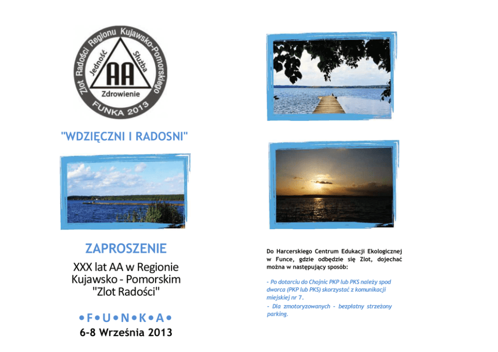 "WDZIĘCZNI I RADOŚNI" ZAPROSZENIE XXX lat AA w Regionie Kujawsko - Pomorskim "Zlot Radości" •F•U•N•K•A• 6-8 Września 2013 Do Harcerskiego Centrum Edukacji Ekologicznej w Funce, gdzie odbędzie się Zlot, dojechać można w następujący sposób: - Po dotarciu do Chojnic PKP lub PKS należy spod dworca (PKP lub PKS) skorzystać z komunikacji miejskiej nr 7. - Dla zmotoryzowanych - bezpłatny strzeżony parking. Drodzy Przyjaciele! W tym roku mija 30 lat gdy w naszym Regionie powstała pierwsza grupa AA. Z tej okazji serdecznie oraz gorąco zapraszamy Was wraz z rodzinami i przyjaciółmi. Spotkamy się w Funce - dzieląc się doświadczeniem, siłą i nadzieją, pamiętając o tym, iż miejsca tworzą ludzie. Funka - położona nad Jeziorem Charzykowskim, to wspaniałe miejsce do wypoczynku i spotkań. Świętujmy wspólnie dar trzeźwości w tym pięknym miejscu. Zlot to jedna z wielu okazji aby poczuć jedność wspólnoty, docenić korzyści płynące z działania Programu AA i okazać radość płynącą z trzeźwości. Zlot jest okazją do dzielenia się doświadczeniem, ale także do wspólnego świętowania, radości i odpoczynku. Serdecznie zapraszamy, do zobaczenia! Organizatorzy zlotu: Region Kujawsko-Pomorski AA Program Zlotu "Wdzięczni i Radośni" Funka 2013 Piątek, 6 Września 2013 12:00 18:00 19:00 19:30 21:00 - Rejestracja uczestników - Kolacja - Otwarcie Zlotu - Miting Otwarty - Ognisko i śpiewanie Sobota, 7 Września 2013 08:00 - Śniadanie 10:00 - Miting Spikerski 10:00 - Blok rekreacyjno-rozrywkowy od godz.10:00 do wieczora 13:00 - Obiad 15:00 - Miting (AA, Al - Anon, DDA) 18:00 - Kolacja 20:00 - Zabawa taneczna 20:00 - Miting AA Niedziela, 8 Września 2013 08:00 - Śniadanie 10:00 - Miting AA (czym chcę się podzielić) 12:00 - Zakończenie Zlotu 13:00-Obiad Ośrodek dysponuje i oferuje: - wypożyczalnię rowerów i żaglówek - boiska do siatkówki i koszykówki - rejs statkiem Bałtyk po jeziorze Charzykowskim Zakwaterowanie i koszt uczestnictwa DOMEK TYPU "JOLA" - 27 osobowy - Pokoje 2 - 4 - 6 osobowe - Ogrzewanie - Sanitariat i łazienki w domku - Dwie doby z wyżywieniem 104 zł od osoby DOMEK TYPU "BRDA" -10 osobowy - Pokoje 2-4 osobowe - Bez ogrzewania od osoby - Sanitariat i łazienki na zewnątrz domku - Dwie doby z wyżywieniem 86 zł Dzieci do lat 7 - opłata 50% Uwaga: w przypadku wyboru pokoju 2-osobowego należy dokonać rezerwacji telefonicznej tel.: 504 166 488 codziennie w godz. 10:00 – 20:00 Wpłaty przyjmowane do końca sierpnia 2013 na numer rachunku bankowego: 15 1500 1777 1217 7009 4700 0000 Fundacja Biuro Służby Krajowej AA w Polsce ul. Chmielna 20 00-020 Warszawa W treści przelewu proszę wpisać "Zlot Funka" Koszty uczestnictwa 20 zł od osoby płatne na miejscu. Telefony informacyjne Zlotu: 504 166 488 788 303 528 Czynne codziennie w godz. 10:00 – 20:00