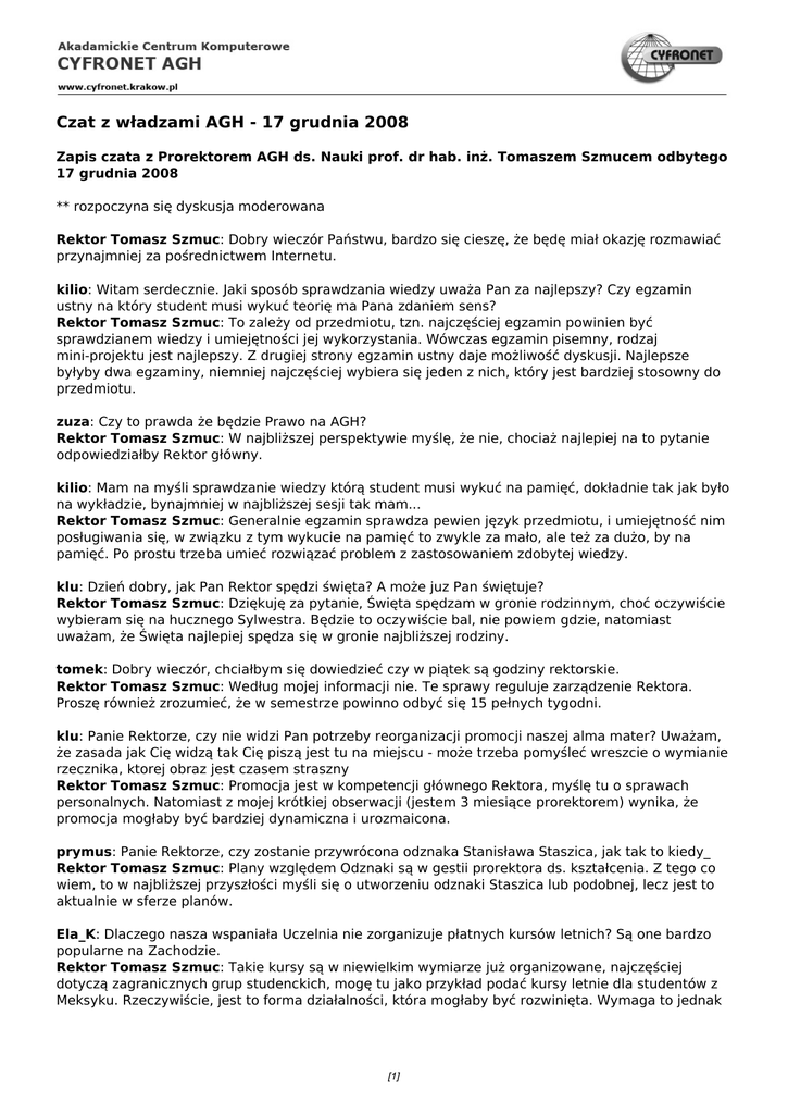 Czat z władzami AGH - 17 grudnia 2008 Zapis czata z Prorektorem AGH ds. Nauki prof. dr hab. inż. Tomaszem Szmucem odbytego 17 grudnia 2008 ** rozpoczyna się dyskusja moderowana Rektor Tomasz Szmuc: Dobry wieczór Państwu, bardzo się cieszę, że będę miał okazję rozmawiać przynajmniej za pośrednictwem Internetu. kilio: Witam serdecznie. Jaki sposób sprawdzania wiedzy uważa Pan za najlepszy? Czy egzamin ustny na który student musi wykuć teorię ma Pana zdaniem sens? Rektor Tomasz Szmuc: To zależy od przedmiotu, tzn. najczęściej egzamin powinien być sprawdzianem wiedzy i umiejętności jej wykorzystania. Wówczas egzamin pisemny, rodzaj mini-projektu jest najlepszy. Z drugiej strony egzamin ustny daje możliwość dyskusji. Najlepsze byłyby dwa egzaminy, niemniej najczęściej wybiera się jeden z nich, który jest bardziej stosowny do przedmiotu. zuza: Czy to prawda że będzie Prawo na AGH? Rektor Tomasz Szmuc: W najbliższej perspektywie myślę, że nie, chociaż najlepiej na to pytanie odpowiedziałby Rektor główny. kilio: Mam na myśli sprawdzanie wiedzy którą student musi wykuć na pamięć, dokładnie tak jak było na wykładzie, bynajmniej w najbliższej sesji tak mam... Rektor Tomasz Szmuc: Generalnie egzamin sprawdza pewien język przedmiotu, i umiejętność nim posługiwania się, w związku z tym wykucie na pamięć to zwykle za mało, ale też za dużo, by na pamięć. Po prostu trzeba umieć rozwiązać problem z zastosowaniem zdobytej wiedzy. klu: Dzień dobry, jak Pan Rektor spędzi święta? A może juz Pan świętuje? Rektor Tomasz Szmuc: Dziękuję za pytanie, Święta spędzam w gronie rodzinnym, choć oczywiście wybieram się na hucznego Sylwestra. Będzie to oczywiście bal, nie powiem gdzie, natomiast uważam, że Święta najlepiej spędza się w gronie najbliższej rodziny. tomek: Dobry wieczór, chciałbym się dowiedzieć czy w piątek są godziny rektorskie. Rektor Tomasz Szmuc: Według mojej informacji nie. Te sprawy reguluje zarządzenie Rektora. Proszę również zrozumieć, że w semestrze powinno odbyć się 15 pełnych tygodni. klu: Panie Rektorze, czy nie widzi Pan potrzeby reorganizacji promocji naszej alma mater? Uważam, że zasada jak Cię widzą tak Cię piszą jest tu na miejscu - może trzeba pomyśleć wreszcie o wymianie rzecznika, ktorej obraz jest czasem straszny Rektor Tomasz Szmuc: Promocja jest w kompetencji głównego Rektora, myślę tu o sprawach personalnych. Natomiast z mojej krótkiej obserwacji (jestem 3 miesiące prorektorem) wynika, że promocja mogłaby być bardziej dynamiczna i urozmaicona. prymus: Panie Rektorze, czy zostanie przywrócona odznaka Stanisława Staszica, jak tak to kiedy_ Rektor Tomasz Szmuc: Plany względem Odznaki są w gestii prorektora ds. kształcenia. Z tego co wiem, to w najbliższej przyszłości myśli się o utworzeniu odznaki Staszica lub podobnej, lecz jest to aktualnie w sferze planów. Ela_K: Dlaczego nasza wspaniała Uczelnia nie zorganizuje płatnych kursów letnich? Są one bardzo popularne na Zachodzie. Rektor Tomasz Szmuc: Takie kursy są w niewielkim wymiarze już organizowane, najczęściej dotyczą zagranicznych grup studenckich, mogę tu jako przykład podać kursy letnie dla studentów z Meksyku. Rzeczywiście, jest to forma działalności, która mogłaby być rozwinięta. Wymaga to jednak [1] aktywności szczególnie ze strony wydziałów. zambi: Czy będzie zmieniony system rekrutacji na Uczelnie? A jeśli tak to jakie istotne zmiany zostaną wprowadzone? Rektor Tomasz Szmuc: W najbliższym czasie nie będzie, obowiązują zasady przyjmowania na podstawie ocen z matury. Dotyczy to 1 stopnia studiów. Rekrutacja na 2 stopień jest już w gestii wydziałów, w szczególności w kwestii przyjmowania studentów, którzy ukończyli inny kierunek na pierwsyzm stopniu. tomek1: Panie Rektorze, chciałbym zapytać kiedy AGH będzie uniwersytetem Rektor Tomasz Szmuc: Z przyjemnością odpowiadam na to pytanie: z punktu widzenia wymagań AGH jest już uniwersytetem tzw. przymiotnikowym, np. uniwersytetem technicznym. W tym względzie wymagania spełniamy z nadmiarem. Aby stać się uniwersytetem bezprzymiotnikowym, czyli po prostu uniwersytetem, brakuje nam bardzo niewiele, choćby 1 dyscypliny natury "czystej nauki". Jesteśmy bardzo blisko również spełnienia tego wymagania. Pozostaje natomiast kwestia, czy zmieniać nazwę AGH, która ma ogromną tradycję i co tu ukrywać jest rozpoznawalną w świecie marką. Czyli w zasadzie wkrótce spełnimy warunki, jednak poważnie zastanawiamy się, czy mimo to nie zachować tradycyjnej nazwy. kali: Panie Rektorze, mam pytanie odnośnie bazy mieszkaniowej dla młodych pracowników naukowych. Jak wygląda ta kwestia na AGH? Rektor Tomasz Szmuc: Generalnie są w miejscach tzw. hotelach asystenckich, jednak należy je traktować jako lokum przejściowe, natomiast uczelnia jest raczej zainteresowana wspomaganiem, nawet kredytowaniem, przyszłych mieszkań własnościowych dla pracowników AGH. aga: A ja mam nietypowe pytanie. Czy jeśli mam zaciągnięty kredyt czy dostane stypendium socjalne? Rektor Tomasz Szmuc: Stypendium socjalne jest związane z dochodami na członka rodziny, i fakt wzięcia kredytu nie gra tu roli. kilio: Nie uważa Pan, że mamy za dużo wykładów, a zbyt mało laboratoriów i ćwiczeń? Rynek pracy ciągle ulega zmianom, więc może my będziemy mogli chociaż w połowie wybierać czego chcemy się uczyć? Rektor Tomasz Szmuc: Układanie programów studiów jest podporządkowane spełnieniu pewnych wymogów, ogólnie tzw. standardów. Stosunek wykładów do ćwiczeń jest tam oczywiście odpowiednio okreslony, i wszystkie programy, według mojej wiedzy, spełniają te warunki. Czy zbyt mało ćwiczeń laboratoryjnych - może to byc odczucie w stosunku do przedmiotów, dla których rozwija się laboratoria, szczególnie w nowych dyscyplinach. To zazwyczaj kosztuje, i staramy się pozyskiwac pieniądze nie 