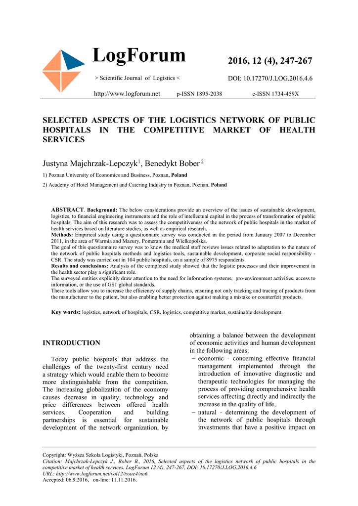 competitive market of health services. LogForum 12 (4), 247-267, DOI: 10.17270/J.LOG.2016.4.6