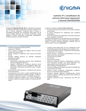 Szyfrator IP z certyfikatem do ochrony informacji niejawnych o klauzuli ZASTRZEŻONE Urządzenie CompCrypt ETA-MIL 10Z jest szyfratorem IP służącym do utajniania informacji przesyłanych w sieciach rozległych IP (w tym w sieciach radiowych). Urządzenie działa w oparciu o technologię wirtualnych sieci prywatnych (IPsec-VPN). Przy jej pomocy odległe lokalizacje lub terminale użytkownika zostają połączone tunelami szyfrowymi umożliwiając współdzielenie zasobów sieciowych i wymianę informacji. Urządzenie występuje w trzech wersjach wykonania: • Int (wersja wewnętrzna) przeznaczona do montażu wewnątrz stacji roboczej, • Ex (wersja zewnętrzna) do użytkowania jako urządzenie wolnostojące, • N7 (wersja wojskowa) do użytkowania w warunkach polowych (patrz „zgodność z normami”). Rozwiązanie dedykowane jest dla podmiotów przetwarzających i przesyłających między swoimi lokalizacjami informacje zgodnie z ustawą o ochronie informacji niejawnych. Szyfrator służy do ochrony danych o klauzuli „zastrzeżone”. CECHY FUNKCJONALNE: • • • • • • • • • możliwość zestawienia do 250 tuneli VPN wydajność do 50Mbit/s praca w oparciu o protokół IPsec zgodny z RFC-2411 (wykorzystuje tryb tunelowy, ESP) lokalne zarządzanie urządzeniem przez terminal konsolowy RS-232 dostępna aplikacja graficzna do zdalnego zarządzania grupą/siecią urządzeń role użytkowników: ◦ administrator: konfiguracja adresacji tuneli, konfiguracja zdarzeń podlegających logowaniu ◦ inspektor: odblokowanie urządzenia, generacja nowej konfiguracji, generacja kluczy, przeglądanie logów bezpieczeństwa, definiowanie parametrów tuneli, zarządzanie firewall uwierzytelnianie administratorów i inspektorów przy pomocy kart procesorowych uwierzytelnienie stron tunelu w trybie współdzielonego klucza PSK (pre-shared key) lub certyfikatu (rsasign) - w oparciu o certyfikaty urządzeń lub w oparciu o certyfikaty operatorów możliwość wykonania backupu oraz importu konfiguracji sieciowej urządzenia lub grupy urządzeń na kartę(y) operatora(ów) • • • • • • • • • • • • • centralny serwer logów (maks. do 5-ciu niezależnych serwerów) kolekcjonujący zdarzenia logowane od urządzeń w sieci wirusowa dystrybucja listy CRL - automatyczne przekazywanie nowych CRLi w sieci urządzeń firewall stanowy z możliwością priorytetowania ruchu oraz ograniczania liczby sesji zdalnych routing dynamiczny (OSPF) NAT Traversal Quality of Service (QoS) możliwość budowania klastrów zwiększających przepustowość krytycznych punktów sieci (Load Balancing) oraz zapewniających wysoką dostępność (High Availability) zdalna aktualizacja oprogramowania możliwość konfiguracji interfejsów wirtualnych VLAN (802.1Q) synchronizacja czasu (NTP) ułatwiony proces zastąpienia uszkodzonego urządzenia, łącznie z przeniesieniem jego konfiguracji możliwość zdalnego zgłoszenia certyfikacyjnego (online) nowego urządzenia i szybkiego wznowienia pracy systemu po wymianie urządzenia możliwość zestawienia tuneli z szyfratorami Cisco ASA serii 5000 PARAMETRY TECHNICZNE WERSJI INT I EX: ZASILANIE: +12VDC (z tolerancją -18%, +30%) POBÓR PRĄDU: <20W WYMIARY (szer. x wys. x gł.): -Int 150 x 41,5 x 197 mm -Ex 141,1 x 41,5 x 227,6 mm MASA: -Int 1,45kg (+/-100g) -Ex <2kg INTERFEJSY KOMUNIKACYJNE: 2x Ethernet 10/100/1000 Base-T (złącze RJ45) INTERFEJSY ZARZĄDZANIA: 2x RS-232 (złącze DB9 dla wersji -Ex, złącze RJ45 dla wersji -Int) TEMP. PRACY: od +10 do +35°C TEMP. TRANSPORTU/ PRZECHOWYWANIA: od -20 do +65°C PODTRZYMYWANIE BEZPIECZEŃSTWA BEZ ZASILANIA ZEWN.: 36 miesięcy ŚRODOWISKO PRACY: Do prawidłowego funkcjonowania urządzenia wymagają infrastruktury klucza publicznego (PKI). Jako system PKI oferowane jest oprogramowanie Centaur CCK wraz z modułem HSM zapewniającym bezpieczeństwo klucza prywatnego urzędu PKI. Urządzenie nadaje się do wykorzystania w sieciach radiowych o bardzo małej przepustowości – poniżej 1 kbit/s. Urządzenie poprawnie pracuje w sieciach radiowych z wysokim współczynnikiem BER (Bit Error Rate) – nawet dla BER = 10 (-4). PARAMETRY TECHNICZNE WERSJI N7: ZASILANIE: +27VDC (z tolerancją -18%, +10%) POBÓR PRĄDU: <75W WYMIARY (szer. x wys. x gł.): 483 x 89 x 300 mm MASA: 13,5 kg (+/-100g) INTERFEJSY KOMUNIKACYJNE: 2x światłowody 100Base-FX, złącze ST, światłowód MMF 50/125, 62,5/125 INTERFEJSY ZARZĄDZANIA: 2x RS-232 (złącze DB9) TEMP. PRACY: od -30 do +50°C TEMP. TRANSPORTU/PRZECHOWYWANIA: od -40 do +65°C PODTRZYMANIE BEZPIECZEŃSTWA BEZ ZASILANIA ZEWN.: 36 miesięcy ZGODNOŚĆ Z NORMAMI (wersja N7): NO-06-A101 jako urządzenie grupy N.7-UZ-II-A z poniższymi odstępstwami: • obniżona temperatura pracy: -30°C • podwyższona temperatura pracy: +50°C • dolna temperatura graniczna: -40°C • górna temperatura graniczna: +65°C • maksymalna wilgotność względna w temp. +25°C: 98% • odporność na narażenia elektromagnetyczne promieniowane zgodne z wymaganiami KRS-02 jak dla Wojsk Lądowych, max. natężenie pola 50 V/m, częstotliwość 2 MHz – 1 GHz. ENIGMA Systemy Ochrony Informacji Sp. z o.o., ul. Jutrzenki 116, 02-230 Warszawa, tel. 22 570 57 10, www.enigma.com.pl