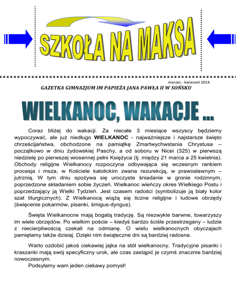 marzec - kwiecień 2014 GAZETKA GIMNAZJUM IM PAPIEŻA JANA PAWŁA II W SOŃSKU Coraz bliżej do wakacji. Za niecałe 3 miesiące wszyscy będziemy wypoczywać, ale już niedługo WIELKANOC - najważniejsze i najstarsze święto chrześcijaństwa, obchodzone na pamiątkę Zmartwychwstania Chrystusa – początkowo w dniu żydowskiej Paschy, a od soboru w Nicei (325) w pierwszą niedzielę po pierwszej wiosennej pełni Księżyca (tj. między 21 marca a 25 kwietnia). Obchody religijne Wielkanocy rozpoczyna odbywająca się wczesnym rankiem procesja i msza, w Kościele katolickim zwana rezurekcją, w prawosławnym – jutrznią. W tym dniu spożywa się uroczyste śniadanie w gronie rodzinnym, poprzedzone składaniem sobie życzeń. Wielkanoc wieńczy okres Wielkiego Postu i poprzedzający ją Wielki Tydzień. Jest czasem radości (symbolizuje ją biały kolor szat liturgicznych). Z Wielkanocą wiążą się liczne religijne i ludowe obrzędy (święcenie pokarmów, pisanki, śmigus-dyngus). Święta Wielkanocne mają bogatą tradycję. Są niezwykle barwne, towarzyszy im wiele obrzędów. Po wielkim poście – kiedyś bardzo ściśle przestrzegany – ludzie z niecierpliwością czekali na odmianę. O wielu wielkanocnych obyczajach pamiętamy także dzisiaj. Dzięki nim świąteczne dni są bardziej radosne. Warto ozdobić jakoś ciekawiej jajka na stół wielkanocny. Tradycyjne pisanki i kraszanki mają swój specyficzny urok, ale czas zastąpić je czymś znacznie bardziej nowoczesnym. Podsyłamy wam jeden ciekawy pomysł! Marmurkowe pisanki za pomocą lakierów do paznokci Ptaki ćwierkają w radosnym rytmie, zimowe kurtki leżą gdzieś pod łóżkiem, a na naszych twarzach promienieją szerokie uśmiechy! W końcu wiosna! W naszej szkole, jak co roku, 21 marca jest dniem luźniejszym od zajęć lekcyjnych, bo słynny „dzień wagarowicza” można też spędzić miło w szkole. Z tej okazji samorząd szkolny przygotował dla Was projekcję filmu "Nietykalni", który sądząc po oklaskach przypadł Wam do gustu. Nasi chłopcy dzielnie walczyli, w międzyklasowym turnieju piłki nożnej. (I miejsce - IIa - FC Sudety (Jakub Daniszewski, Mateusz Komorowski, Sebastian Chrostowski, Mateusz Dzierżanowski, Adrian Dyląg, Jakub Wróblewski) II miejsce - III b - MKS Sońsk United (Szymon Felczyński, Patryk Krzemiński, Kamil Danowski, Jakub Komorowski, Kamil Śmigielski, Jakub Bąk, Adrian Podsiedlik). III miejsce - III a - FC Majdan (Paweł Czapka, Kamil Wiktorski, Konrad Andrzejak, Arek Falba, Maciej Szot, Szymon Koźniewski, Bartosz Brzeziński). Na koniec dnia pan Kondracki razem z dziewczynami z klas III rozpoczął karaoke! Nie obyło się bez bisu! "Babę zesłał Bóg" nuciła cała szkoła, aż do prima aprilis! Poza tym okazało się, że w naszej szkole jest kilku niezłych wokalistów i wokalistek. Między innymi Klaudia Kucińska, która dostała owacje na stojąco po odśpiewaniu słynnej piosenki Kayah "Testosteron". Miejmy nadzieję, że te ostatnie ciepłe już miesiące szkoły będą jak najbardziej owocne. 2 kwietnia przypadała 9 rocznica śmierci Papieża Jana Pawła II – naszego patrona. Jego pontyfikat wywarł ogromny wpływ na losy Kościoła i świata, a postawa Papieża w obliczu cierpienia i choroby stała się źródłem nadziei dla milionów ludzi. 1 maja 2011 roku w Rzymie odbyła się uroczystość beatyfikacji papieża Polaka. Natomiast 27 kwietnia 2014r. w Niedzielę Miłosierdzia Bożego odbędzie się kanonizacja bł. Jana XXIII i bł. Jana Pawła II. A oto krótka biografia naszego patrona: Jan Paweł II (Karol Wojtyła) urodził się 18 maja 1920r. w Wadowicach. Jego ojciec był zawodowym wojskowym. Matka - Emilia z Kaczorowskich - zajmowała się domem. Starszy o 12 lat od Karola brat Edward uczył się w wadowickim gimnazjum, a później studiował medycynę w Krakowie. 13 kwietnia 1929 r. zmarła matka Karola. Dziewięcioletnim chłopcem zajął się ojciec. We wrześniu 1930r. Karol zdał egzamin do męskiego Państwowego Gimnazjum Śląskiego im. Marcina Wadowity. W 1938r. rozpoczął studia polonistyczne na Uniwersytecie Jagiellońskim, przerwane wybuchem wojny. W czasie okupacji pracował jako robotnik w kamieniołomach w Zakrzówku i w fabryce "Solvay" w Krakowie. W 1941r. zmarł mu ojciec. Do połowy 1943 roku Karol był związany z konspiracyjnym Teatrem Rapsodycznym. W 1942r. rozpoczął studia na tajnym Wydziale Teologicznym Uniwersytetu Jagiellońskiego, ukończył je po wojnie w 1946 roku i z rąk Kardynała Adama Sapiehy otrzymał święcenia kapłańskie. Do 1948 roku odbywał studia na Papieskim Uniwersytecie Dominikańskim w Rzymie. Pierwszą duszpasterską placówką księdza Karola była mała wiejska parafia Niegowić niedaleko Bochni. W 1949 roku arcybiskup Sapieha przydzielił Karolowi Wojtyle parafię św. Floriana na Kleparzu w Krakowie. Młody wikary nawiązał szybki kontakt z młodzieżą akademicką. Chodził z młodymi na wycieczki, do teatru, dyskutował i umiał ich słuchać. W 1953 roku obronił rozprawę habilitacyjną na Uniwersytecie Jagiellońskim, po czym podjął wykłady z katolickiej etyki społecznej i filozoficznej w krakowskim Seminarium Duchownym oraz na Katolickim Uniwersytecie Lubelskim. Sakrę biskupią otrzymał w 1958 roku. W 1964 roku został arcybiskupem krakowskim, a w 1967 kardynałem. Brał aktywny udział w Soborze Watykańskim II. Po śmierci Jana Pawła I, 16 października 1978 roku został wybrany na papieża i przyjął imiona Jan Paweł II. Był pierwszym od 455 lat papieżem nieWłochem i pierwszym Polakiem na Stolicy Piotrowej. Pontyfikat Jana Pawła II upływał pod znakiem posługi na rzecz ekumenizmu, cywilizacji miłości, wolności wzorowanej na Eucharystii. Odwiedził większość krajów świata - z tej racji zwany jest "papieżem pielgrzymem" - odbył ponad 100 zagranicznych podróży duszpasterskich.. Papież jest autorem wierszy ogłaszanych głównie pod pseudonimem - Andrzej J