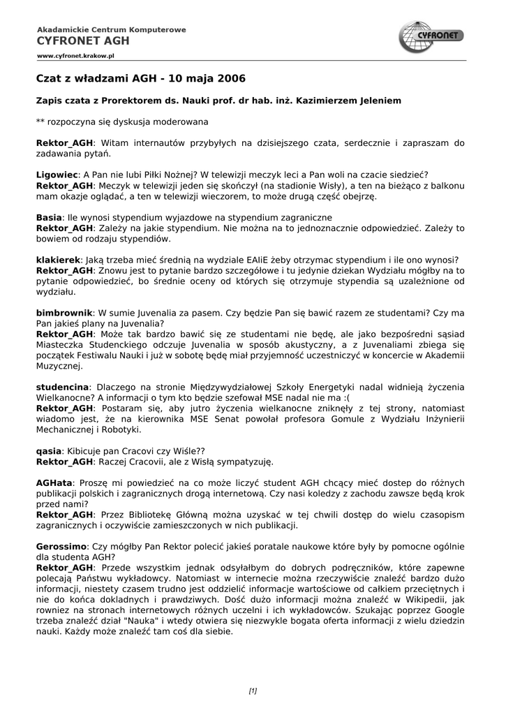 Czat z władzami AGH - 10 maja 2006 Zapis czata z Prorektorem ds. Nauki prof. dr hab. inż. Kazimierzem Jeleniem ** rozpoczyna się dyskusja moderowana Rektor_AGH: Witam internautów przybyłych na dzisiejszego czata, serdecznie i zapraszam do zadawania pytań. Ligowiec: A Pan nie lubi Piłki Nożnej? W telewizji meczyk leci a Pan woli na czacie siedzieć? Rektor_AGH: Meczyk w telewizji jeden się skończył (na stadionie Wisły), a ten na bieżąco z balkonu mam okazje oglądać, a ten w telewizji wieczorem, to może drugą część obejrzę. Basia: Ile wynosi stypendium wyjazdowe na stypendium zagraniczne Rektor_AGH: Zależy na jakie stypendium. Nie można na to jednoznacznie odpowiedzieć. Zależy to bowiem od rodzaju stypendiów. klakierek: Jaką trzeba mieć średnią na wydziale EAIiE żeby otrzymac stypendium i ile ono wynosi? Rektor_AGH: Znowu jest to pytanie bardzo szczegółowe i tu jedynie dziekan Wydziału mógłby na to pytanie odpowiedzieć, bo średnie oceny od których się otrzymuje stypendia są uzależnione od wydziału. bimbrownik: W sumie Juvenalia za pasem. Czy będzie Pan się bawić razem ze studentami? Czy ma Pan jakieś plany na Juvenalia? Rektor_AGH: Może tak bardzo bawić się ze studentami nie będę, ale jako bezpośredni sąsiad Miasteczka Studenckiego odczuje Juvenalia w sposób akustyczny, a z Juvenaliami zbiega się początek Festiwalu Nauki i już w sobotę będę miał przyjemność uczestniczyć w koncercie w Akademii Muzycznej. studencina: Dlaczego na stronie Międzywydziałowej Szkoły Energetyki nadal widnieją życzenia Wielkanocne? A informacji o tym kto będzie szefował MSE nadal nie ma :( Rektor_AGH: Postaram się, aby jutro życzenia wielkanocne zniknęły z tej strony, natomiast wiadomo jest, że na kierownika MSE Senat powołał profesora Gomule z Wydziału Inżynierii Mechanicznej i Robotyki. qasia: Kibicuje pan Cracovi czy Wiśle?? Rektor_AGH: Raczej Cracovii, ale z Wisłą sympatyzuję. AGHata: Proszę mi powiedzieć na co może liczyć student AGH chcący mieć dostep do różnych publikacji polskich i zagranicznych drogą internetową. Czy nasi koledzy z zachodu zawsze będą krok przed nami? Rektor_AGH: Przez Bibliotekę Główną można uzyskać w tej chwili dostęp do wielu czasopism zagranicznych i oczywiście zamieszczonych w nich publikacji. Gerossimo: Czy mógłby Pan Rektor polecić jakieś poratale naukowe które były by pomocne ogólnie dla studenta AGH? Rektor_AGH: Przede wszystkim jednak odsyłałbym do dobrych podręczników, które zapewne polecają Państwu wykładowcy. Natomiast w internecie można rzeczywiście znaleźć bardzo dużo informacji, niestety czasem trudno jest oddzielić informacje wartościowe od całkiem przeciętnych i nie do końca dokladnych i prawdziwych. Dość dużo informacji można znaleźć w Wikipedii, jak rowniez na stronach internetowych różnych uczelni i ich wykładowców. Szukając poprzez Google trzeba znaleźć dział "Nauka" i wtedy otwiera się niezwykle bogata oferta informacji z wielu dziedzin nauki. Każdy może znaleźć tam coś dla siebie. [1] qasia: Jakie ma Pan zdanie na temat wczorajszych protestów studentów w Warszawie? Rektor_AGH: Chętnie bym się do nich przyłączył... Kuba: Jakie predyspozycje powinien mieć dobry fizyk Rektor_AGH: Niewątpliwie uzdolnienia do przedmiotów ścisłych, dociekliwość i pracowitość, bo to pozwala opanować podstawowe zagadnienia z fizyki. Natomiast do tego, by zostać prawdziwym naukowcem-fizykiem trzeba mieć tak zwaną iskrę bożą i niezwykle elastyczny, otwarty na wszelką informację sposób rozumowania. Fizyka z jednej strony jest nauka przyrodnicza, ale również nauką ścisłą. I połączenie tych dwóch obszarów wielu ludziom sprawia trudności i często fizyka postrzegana jest jako nauka trudniejsza na przykład od matematyki. qasia: Czy uważa Pan, że obecna koalicja pis i samoobrony będzie miała jakiekolwiek dobre skutki? Rektor_AGH: Wątpie w to, no ale zobaczymy myślę już w najbliższym czasie, jak ta koalicja będzie funckjonowała. tadeus: Proszę mi powiedzieć kto wspiera finasowo AGH oprócz pieniędzy państwowych. Czy "umiemy" sobie znaleźć sponsorów? Mam tu na myśli przykład AE i ich wysokich stypendiów naukowych. Rektor_AGH: Uczelnia oczywiście uzyskuje dotacje z pieniędzy państwowych, ale pozyskuje także fundusze unijne, jak również ze zleceń gospodarki krajowej. Nie zawsze przenosi się to bezpośrednio na stypendia naukowe, które w naszych warunkach wynikają właściwie z dotacji ministerstwa. Osobna sprawa jest pozyskiwanie stypendiów zagranicznych. Nie umiem ustosunkować się do informacji o wysokich stypendiach naukowych w AE. W naszych warunkach możemy dawac większą liczbę stypendiów za wyniki w nauce, ale niższych, lub tez mniej wyższych. Zależy to od decyzji władz Uczelni i wydziałow. Kuba: Ilu miał Pan wybitnych studentów i co oni teraz robią jeśli oczywiście Pan wie. Rektor_AGH: O niektórych na pewno wiem i naprawde zrobili bardzo błyskotliwe kariery. Z ostatniego okresu jeden z moich studentów, a później doktorantów, zajął wysokie stanowisko w Motoroli. Następnie miałem studentów, ktorzy uzyskali stypendia doktorskie w uczelniach i jednostkach zagranicznych. AGHata: Proszę wymienić trzech absolwentów AGH z których uczelnie jest najdumniejsza? Rektor_AGH: Nie chciałbym wymieniać nazwiska tych osób, ale mamy absolwenta, który pracuje w dziedzinie ewolucji gwiazd i galaktyk, jest liczącym się specjalistą. Niewątpliwie Pańswtwo słyszeli o najmłodszym profesorze w Polsce, który jest pracownikiem naszej Uczelni. A dumny jestem z kilku absolwentów, o których otrzymałem informację zarówno z Japonii, jak i z Danii, gdzie wykonali bardzo dobre prace doktorskie i włączyli się intensywnie w prace naukowe. Jako, że jestem fizykiem no może nie znam dokładnie absolwentów innych wydziałów Uczelni, ale postaram się tą moją wiedz