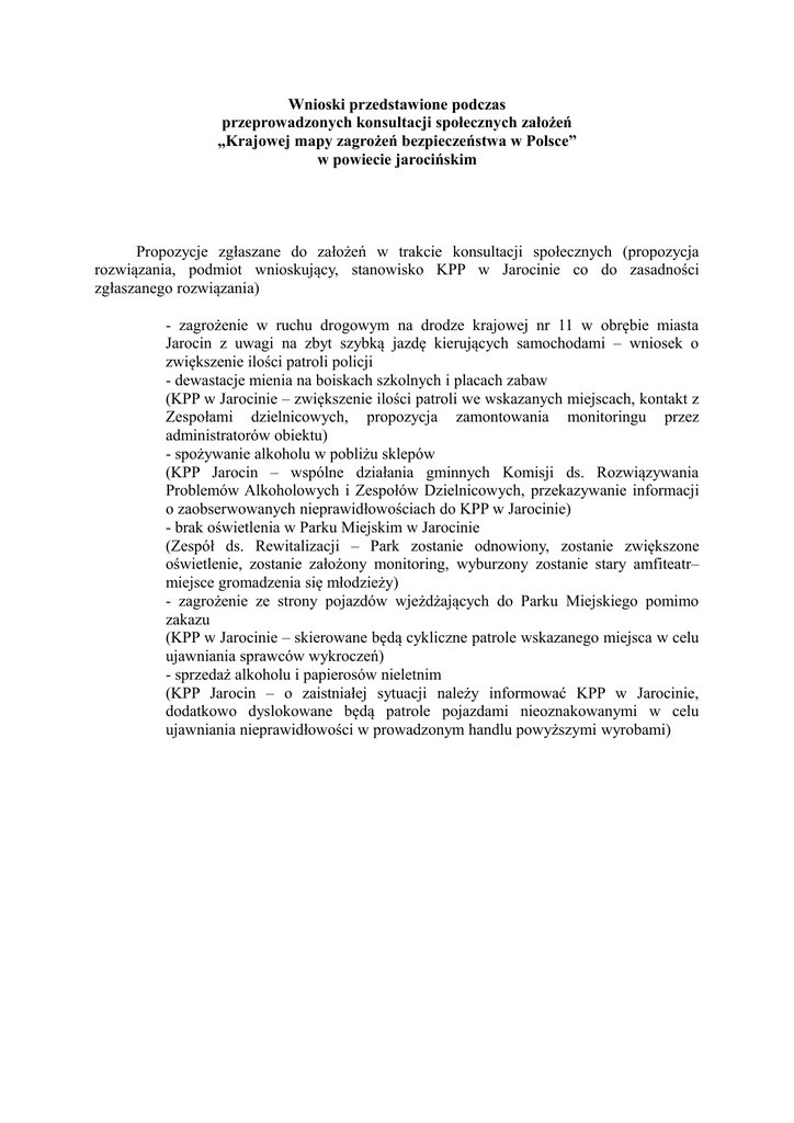Wnioski przedstawione podczas przeprowadzonych konsultacji społecznych założeń „Krajowej mapy zagrożeń bezpieczeństwa w Polsce” w powiecie jarocińskim Propozycje zgłaszane do założeń w trakcie konsultacji społecznych (propozycja rozwiązania, podmiot wnioskujący, stanowisko KPP w Jarocinie co do zasadności zgłaszanego rozwiązania) - zagrożenie w ruchu drogowym na drodze krajowej nr 11 w obrębie miasta Jarocin z uwagi na zbyt szybką jazdę kierujących samochodami – wniosek o zwiększenie ilości patroli policji - dewastacje mienia na boiskach szkolnych i placach zabaw (KPP w Jarocinie – zwiększenie ilości patroli we wskazanych miejscach, kontakt z Zespołami dzielnicowych, propozycja zamontowania monitoringu przez administratorów obiektu) - spożywanie alkoholu w pobliżu sklepów (KPP Jarocin – wspólne działania gminnych Komisji ds. Rozwiązywania Problemów Alkoholowych i Zespołów Dzielnicowych, przekazywanie informacji o zaobserwowanych nieprawidłowościach do KPP w Jarocinie) - brak oświetlenia w Parku Miejskim w Jarocinie (Zespół ds. Rewitalizacji – Park zostanie odnowiony, zostanie zwiększone oświetlenie, zostanie założony monitoring, wyburzony zostanie stary amfiteatr– miejsce gromadzenia się młodzieży) - zagrożenie ze strony pojazdów wjeżdżających do Parku Miejskiego pomimo zakazu (KPP w Jarocinie – skierowane będą cykliczne patrole wskazanego miejsca w celu ujawniania sprawców wykroczeń) - sprzedaż alkoholu i papierosów nieletnim (KPP Jarocin – o zaistniałej sytuacji należy informować KPP w Jarocinie, dodatkowo dyslokowane będą patrole pojazdami nieoznakowanymi w celu ujawniania nieprawidłowości w prowadzonym handlu powyższymi wyrobami)