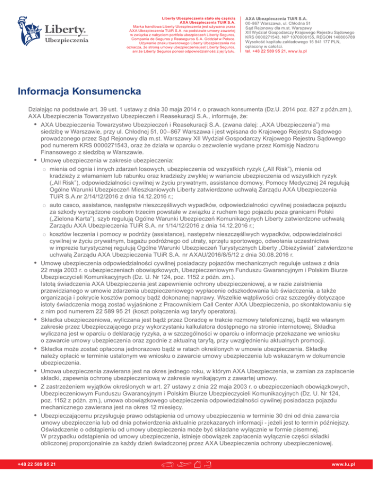 Liberty Ubezpieczenia stało się częścią AXA Ubezpieczenia TUiR S.A. Marka handlowa Liberty Ubezpieczenia jest używana przez AXA Ubezpieczenia TUiR S.A. na podstawie umowy zawartej w związku z nabyciem portfela ubezpieczeń Liberty Seguros, Compania de Seguros y Reaseguros S.A. Oddział w Polsce. Używanie znaku towarowego Liberty Ubezpieczenia nie oznacza, że stroną umowy ubezpieczenia jest Liberty Seguros, ani że Liberty Seguros ponosi odpowiedzialność z jej tytułu. AXA Ubezpieczenia TUiR S.A. 00-867 Warszawa, ul. Chłodna 51 Sąd Rejonowy dla m.st. Warszawy XII Wydział Gospodarczy Krajowego Rejestru Sądowego KRS 0000271543, NIP 1070006155, REGON 140806789 Wysokość kapitału zakładowego 15 941 177 PLN, opłacony w całości. tel. +48 22 589 95 21, www.lu.pl Informacja Konsumencka Działając na podstawie art. 39 ust. 1 ustawy z dnia 30 maja 2014 r. o prawach konsumenta (Dz.U. 2014 poz. 827 z późn.zm.), AXA Ubezpieczenia Towarzystwo Ubezpieczeń i Reasekuracji S.A., informuje, że: yy AXA Ubezpieczenia Towarzystwo Ubezpieczeń i Reasekuracji S.A. (zwana dalej: „AXA Ubezpieczenia”) ma siedzibę w Warszawie, przy ul. Chłodnej 51, 00–867 Warszawa i jest wpisana do Krajowego Rejestru Sądowego prowadzonego przez Sąd Rejonowy dla m.st. Warszawy XII Wydział Gospodarczy Krajowego Rejestru Sądowego pod numerem KRS 0000271543, oraz że działa w oparciu o zezwolenie wydane przez Komisję Nadzoru Finansowego z siedzibą w Warszawie. yy Umowę ubezpieczenia w zakresie ubezpieczenia: ○○ mienia od ognia i innych zdarzeń losowych, ubezpieczenia od wszystkich ryzyk („All Risk”), mienia od kradzieży z włamaniem lub rabunku oraz kradzieży zwykłej w wariancie ubezpieczenia od wszystkich ryzyk („All Risk”), odpowiedzialności cywilnej w życiu prywatnym, assistance domowy, Pomocy Medycznej 24 regulują Ogólne Warunki Ubezpieczeń Mieszkaniowych Liberty zatwierdzone uchwałą Zarządu AXA Ubezpieczenia TUiR S.A.nr 2/14/12/2016 z dnia 14.12.2016 r.; ○○ auto casco, assistance, następstw nieszczęśliwych wypadków, odpowiedzialności cywilnej posiadacza pojazdu za szkody wyrządzone osobom trzecim powstałe w związku z ruchem tego pojazdu poza granicami Polski („Zielona Karta”), szyb regulują Ogólne Warunki Ubezpieczeń Komunikacyjnych Liberty zatwierdzone uchwałą Zarządu AXA Ubezpieczenia TUiR S.A. nr 1/14/12/2016 z dnia 14.12.2016 r.; ○○ kosztów leczenia i pomocy w podróży (assistance), następstw nieszczęśliwych wypadków, odpowiedzialności cywilnej w życiu prywatnym, bagażu podróżnego od utraty, sprzętu sportowego, odwołania uczestnictwa w imprezie turystycznej regulują Ogólne Warunki Ubezpieczeń Turystycznych Liberty „Obieżyświat” zatwierdzone uchwałą Zarządu AXA Ubezpieczenia TUiR S.A. nr AXAU/2016/8/5/12 z dnia 30.08.2016 r. yy Umowę ubezpieczenia odpowiedzialności cywilnej posiadaczy pojazdów mechanicznych reguluje ustawa z dnia 22 maja 2003 r. o ubezpieczeniach obowiązkowych, Ubezpieczeniowym Funduszu Gwarancyjnym i Polskim Biurze Ubezpieczycieli Komunikacyjnych (Dz. U. Nr 124, poz. 1152 z późn. zm.). Istotą świadczenia AXA Ubezpieczenia jest zapewnienie ochrony ubezpieczeniowej, a w razie zaistnienia przewidzianego w umowie zdarzenia ubezpieczeniowego wypłacenie odszkodowania lub świadczenia, a także organizacja i pokrycie kosztów pomocy bądź dokonanej naprawy. Wszelkie wątpliwości oraz szczegóły dotyczące istoty świadczenia mogą zostać wyjaśnione z Pracownikiem Call Center AXA Ubezpieczenia, po skontaktowaniu się z nim pod numerem 22 589 95 21 (koszt połączenia wg taryfy operatora). yy Składka ubezpieczeniowa, wyliczana jest bądź przez Doradcę w trakcie rozmowy telefonicznej, bądź we własnym zakresie przez Ubezpieczającego przy wykorzystaniu kalkulatora dostępnego na stronie internetowej. Składka wyliczana jest w oparciu o deklarację ryzyka, a w szczególności w oparciu o informacje przekazane we wniosku o zawarcie umowy ubezpieczenia oraz zgodnie z aktualną taryfą, przy uwzględnieniu aktualnych promocji. yy Składka może zostać opłacona jednorazowo bądź w ratach określonych w umowie ubezpieczenia. Składkę należy opłacić w terminie ustalonym we wniosku o zawarcie umowy ubezpieczenia lub wskazanym w dokumencie ubezpieczenia. yy Umowa ubezpieczenia zawierana jest na okres jednego roku, w którym AXA Ubezpieczenia, w zamian za zapłacenie składki, zapewnia ochronę ubezpieczeniową w zakresie wynikającym z zawartej umowy. yy Z zastrzeżeniem wyjątków określonych w art. 27 ustawy z dnia 22 maja 2003 r. o ubezpieczeniach obowiązkowych, Ubezpieczeniowym Funduszu Gwarancyjnym i Polskim Biurze Ubezpieczycieli Komunikacyjnych (Dz. U. Nr 124, poz. 1152 z póżn. zm.), umowa obowiązkowego ubezpieczenia odpowiedzialności cywilnej posiadacza pojazdu mechanicznego zawierana jest na okres 12 miesięcy. yy Ubezpieczającemu przysługuje prawo odstąpienia od umowy ubezpieczenia w terminie 30 dni od dnia zawarcia umowy ubezpieczenia lub od dnia potwierdzenia aktualnie przekazanych informacji - jeżeli jest to termin późniejszy. Oświadczenie o odstąpieniu od umowy ubezpieczenia może być składane wyłącznie w formie pisemnej. W przypadku odstąpienia od umowy ubezpieczenia, istnieje obowiązek zapłacenia wyłącznie części składki obliczonej proporcjonalnie za każdy dzień świadczonej przez AXA Ubezpieczenia ochrony ubezpieczeniowej. +48 22 589 95 21 www.lu.pl yy Koszt połączenia z numerem infolinii AXA Ubezpieczenia (+48 22 589 95 21) jest ponoszony przez dzwoniącego, zgodnie z taryfą operatora. yy AXA Ubezpieczenia informuje, że Ubezpieczeniowy Fundusz Gwarancyjny działa na zasadach określonych w ustawie z dnia 22 maja 2003 r. o ubezpieczeniach obowiązkowych, Ubezpieczeniowym Funduszu Gwarancyjnym i Polskim Biurze Ubezpieczycieli Komunikacyjnych (Dz. U. Nr 124, poz. 1152 z późń. zm.). yy Językiem stosowanym w relacjach z konsumentem jest ję