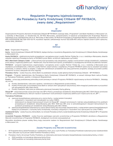 Regulamin Programu lojalnościowego dla Posiadaczy Karty Kredytowej Citibank–BP PAYBACK, zwany dalej „Regulaminem” §1 Organizator Organizatorem Programu dla Karty Kredytowej Citibank–BP PAYBACK zwanego dalej „Programem” jest Bank Handlowy w Warszawie S.A. z siedzibą w Warszawie, ul. Senatorska 16, 00–923 Warszawa, zarejestrowany w rejestrze przedsiębiorców Krajowego Rejestru Sądowego przez Sąd Rejonowy dla m.st. Warszawy w Warszawie, XII Wydział Gospodarczy Krajowego Rejestru Sądowego, pod numerem KRS 0000001538; NIP 526–030–02–91; wysokość kapitału zakładowego wynosi 522.638.400 złotych; kapitał został w pełni opłacony; zwany dalej „Bankiem”. §2 Definicje Bank – Organizator Programu, Karta – Karta Kredytowa Citibank–BP PAYBACK, będąca Kartą w rozumieniu Regulaminu Kart Kredytowych Citibank Banku Handlowego w Warszawie S.A., Konto PAYBACK – elektroniczne konto prowadzone i zarządzane przez Loyalty Partner Polska Sp. z o.o. z siedzibą w Warszawie, otwarte wskutek rejestracji Posiadacza Karty w PAYBACK przez Bank, na którym zapisywane są Punkty. MCC (Merchant Category Code) – czterocyfrowy kod sprzedawcy lub usługodawcy, będący oznaczeniem rodzaju działalności, nadawany przez jedną z organizacji płatniczych – Mastercard, Visa lub American Express, przedsiębiorcy używającemu terminalu do płatności kartami. PAYBACK – program lojalnościowy organizowany i zarządzany przez Loyalty Partner Polska Sp. z o.o. z siedzibą w Warszawie przy współpracy przedsiębiorców, z którymi Loyalty Partner zawarł umowy o współpracy. Program PAYBACK opiera się na zasadach sprzedaży premiowej, w ramach, której w związku z nabyciem określonych produktów lub usług partnerów programu zostają przyznane punkty wymienne na bony zakupowe lub inne nagrody. Posiadacz Karty – osoba fizyczna, której Bank na podstawie Umowy wydał główną Kartę Kredytową Citibank – BP PAYBACK. Program – Program lojalnościowy dla Posiadaczy Karty Kredytowej Citibank–BP PAYBACK, w ramach którego Bank nalicza Punkty za Transakcje Punktowe, zgodnie z niniejszym Regulaminem. Punkty – oznaczają podstawową jednostkę przeliczeniową w ramach Programu PAYBACK rejestrowaną na Koncie PAYBACK , Składają się na nie: a) Punkty Standardowe, naliczane zgodnie z określonym w Regulaminie przelicznikiem, b) Punkty Promocyjne, przyznawane przez Bank w ramach ofert specjalnych lub promocji, które mogą być powtarzane w przyszłości lub wprowadzone jako stała oferta, c) Punkty Powitalne, naliczane po dokonaniu pierwszej transakcji Kartą główną. Stacje BP – stacje benzynowe oznaczone logo sieci BP w Polsce, prowadzące działalność sklasyfikowaną jako MCC 5541 (Stacje serwisowe z lub bez usług dodatkowych), których nazwa w systemach rozliczeniowych organizacji płatniczych rozpoczyna się od „BP–”, Transakcja Punktowa: a) operacja bezgotówkowa wykonana przy użyciu Karty, z wyłączaniem transakcji: – związanych z hazardem lub transakcjami na rynku FOREX, –dokonanych na stacjach benzynowych innych niż Stacje BP – stacjach serwisowych z lub bez usług dodatkowych (tj. punktach prowadzących działalność sklasyfikowaną jako MCC 5541 bez BP) oraz w samoobsługowych stacjach benzynowych (tj. punktach prowadzących działalność sklasyfikowaną jako MCC 5542), b) operacja bezgotówkowa wykonana przy użyciu danych Karty, bez fizycznego okazania Karty, z wyłączeniem operacji bezgotówkowych będących przelewami z rachunku karty kredytowej, transakcji związanych z hazardem oraz operacjami na rynku FOREX. Użytkownik Karty – osoba fizyczna, której Bank, na wniosek Posiadacza Karty wydał dodatkową Kartę Kredytową Citibank BP w Programie PAYBACK, Uczestnik Programu PAYBACK – osoba fizyczna spełniająca warunki uczestnictwa w Programie PAYBACK określone w Regulaminie Warunki Uczestnictwa w Programie PAYBACK, dostępnym na stronie www.payback.pl Wszystkie określenia pisane wielką literą mają znaczenie nadane im Regulaminem Kart Kredytowych Citibank Banku Handlowego w Warszawie S.A. §3 Zasady Programu oraz Warunki Uczestnictwa 1. W Programie biorą udział Posiadacze i Użytkownicy Kart, przy czym Punkty za Transakcje Punktowe wykonane przez Użytkowników Kart zaliczane są na poczet salda Punktów Posiadaczy Karty. 2. Posiadacz Karty otrzymuje Punkty Powitalne, po dokonaniu pierwszej transakcji bezgotówkowej nowowydaną Kartą, w ilości: a. 1500 punktów za transakcję dokonaną Kartą Silver, b. 3000 punktów za transakcję dokonaną Kartą Gold. 3. Punkty Powitalne, o których mowa w ust. 2 powyżej naliczane są jednorazowo, przy czym nie są naliczane klientom, którzy dokonali zamiany innej karty kredytowej wydawanej przez Bank na Kartę Kredytową Citibank BP w Programie PAYBACK. 4. Punkty Standardowe przyznawane są za każdą autoryzowaną w rozumieniu Regulaminu Kart Kredytowych Citibank Banku Handlowego w Warszawie S.A., Transakcję Punktową wykonaną Kartą, zgodnie z następująca zasadą: – 1 Punkt za każde 2 zł wydane Kartą na Stacjach BP – 1 Punkt za każde 5 zł wydane Kartą poza Stacjami BP. 5. Suma Punktów Standardowych i Promocyjnych możliwych do zebrania Kartą w ciągu miesiąca to 1000 Punktów, z wyjątkiem sytuacji, kiedy regulamin promocji przewiduje naliczenie dodatkowych punktów, ponad miesięczny limit. Wartość ta jest sumą Punktów zebranych na Karcie głównej i wydanej/ych do niej Karcie/ach dodatkowych. 6. Bank, za pośrednictwem Stacji BP, przekazuje zebrane przez Posiadaczy Karty Punkty na ich Konto PAYBACK. 7. W przypadku Zwrotu Transakcji Punktowej Bank odejmuje Posiadaczowi Karty liczbę Punktów naliczonych odpowiednio za tę transakcję, co może skutkować powstaniem ujemnego salda Punktów. 8. Zasady określone powyżej podlegają weryfikacji co 6 miesięcy. Zmiany będące skutkiem weryfikacji mogą być wprowadzone w styczniu lub lipcu każdego rok