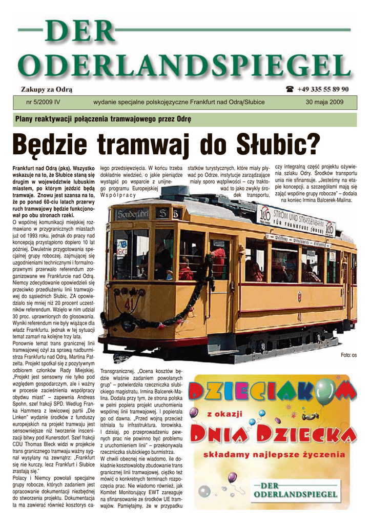 nr 5/2009 IV wydanie specjalne polskojęzyczne Frankfurt nad Odrą/Słubice 30 maja 2009 Plany reaktywacji połączenia tramwajowego przez Odrę Będzie tramwaj do Słubic? Frankfurt nad Odrą (pks). Wszystko wskazuje na to, że Słubice staną się drugim w województwie lubuskim miastem, po którym jeździć będą tramwaje. Znowu jest szansa na to, że po ponad 60-ciu latach przerwy ruch tramwajowy będzie funkcjonował po obu stronach rzeki. O wspólnej komunikacji miejskiej rozmawiano w przygranicznych miastach już od 1993 roku, jednak do pracy nad koncepcją przystąpiono dopiero 10 lat później. Dwuletnie przygotowania specjalnej grupy roboczej, zajmującej się uzgodnieniami technicznymi i formalnoprawnymi przerwało referendum zorganizowane we Frankfurcie nad Odrą. Niemcy zdecydowanie opowiedzieli się przeciwko przedłużeniu linii tramwajowej do sąsiednich Słubic. ZA opowiedziało się mniej niż 20 procent uczestników referendum. Wzięło w nim udział 30 proc. uprawnionych do głosowania. Wyniki referendum nie były wiążące dla władz Frankfurtu. jednak w tej sytuacji temat zamarł na kolejne trzy lata. Ponownie temat trans granicznej linii tramwajowej ożył za sprawą nadburmistrza Frankfurtu nad Odrą, Martina Patzelta. Projekt spotkał się z pozytywnym odbiorem członków Rady Miejskiej. „Projekt jest sensowny nie tylko pod względem gospodarczym, ale i ważny w procesie zacieśnienia współpracy obydwu miast” – zapewnia Andreas Spohn, szef frakcji SPD. Według Franka Hammera z lewicowej partii „Die Linken” wydanie środków z funduszy europejskich na projekt tramwaju jest sensowniejsze niż tworzenie inscenizacji bitwy pod Kunersdorf. Szef frakcji CDU Thomas Bleck widzi w projekcie trans granicznego tramwaju ważny sygnał wysyłany na zewnątrz: „Frankfurt się nie kurczy, lecz Frankfurt i Słubice zrastają się.” Polacy i Niemcy powołali specjalne grupy robocze, których zadaniem jest opracowanie dokumentacji niezbędnej do stworzenia projektu. Dokumentacja ta ma zawierać również kosztorys ca- łego przedsięwzięcia. W końcu trzeba statków turystycznych, które miały płydokładnie wiedzieć, o jakie pieniądze wać po Odrze, instytucje zarządzające wystąpić po wsparcie z unijnemiały sporo wątpliwości – czy traktogo programu Europejskiej wać to jako zwykły śroWspółpracy dek transportu, czy integralną część projektu ożywienia szlaku Odry. Środków transportu unia nie sfinansuje. „Jesteśmy na etapie koncepcji, a szczegółami mają się zająć wspólne grupy robocze” – dodała na koniec Irmina Balcerek-Malina. Foto: os Transgranicznej. „Ocena kosztów będzie właśnie zadaniem powołanych grup” – potwierdziła rzeczniczka słubickiego magistratu, Irmina Balcerek-Malina. Dodała przy tym, że strona polska w pełni popiera projekt uruchomienia wspólnej linii tramwajowej. I popierała go od dawna. „Przed wojną przecież istniała tu infrastruktura, torowiska. I dzisiaj, po przeprowadzeniu pewnych prac nie powinno być problemu z uruchomieniem linii” – przekonywała rzeczniczka słubickiego burmistrza. W chwili obecnej nie wiadomo, ile dokładnie kosztowałoby zbudowanie trans granicznej linii tramwajowej, ciężko też mówić o konkretnych terminach rozpoczęcia prac. Nie wiadomo również, jak Komitet Monitorujący EWT zareaguje na sfinansowanie ze środków UE tramwajów. Pamiętajmy, że w przypadku 30 maja 2009 strona 2 GDZIE WARTO BYĆ · GDZIE WARTO BYĆ · GDZIE WARTO BYĆ Muzyczne Ośno Ośno Lubuskie (ak). 10. maja w Ośnie Lubuskim zainaugurowany został Festiwal Muzyki Kameralnej i Organowej. Festiwal potrwa do 13 września. Najbliższe koncerty zaprezentowane zostaną 14 czerwca o godz. 19.00 w Sali Rajców Ratusza w Ośnie Lubuskim. Muzykę starych mistrzów Telemana, Stamiza i Vivaldiego zagrają na klarnecie i flecie Susanne Erhard z Berlina oraz Kwartet Smyczkowy Delos. Kolejny koncert „Muzyka i humor żydowski” już w lipcu. W sierpniu odbędzie się koncert muzyki sakralnej. Festiwal zakończony zostanie we wrześniu koncertem galowym w programie którego znajdziemy m.in. polsko-niemiecką muzykę filmową. Festiwal otrzymał dotację finansową z Fundacji Współpracy Polsko-Niemieckiej Najazd gwiazd Lubuskie (ak). Od 30 do 31 maja obchodzimy Dni Województwa Lubuskiego 2009. Z tej okazji zorganizowano szereg ciekawych imprez z gwiazdami. Na uwagę zasługuje kalejdoskop gwiazd, jaki zaprezentuje się w naszym województwie podczas dwóch ostatnich dni maja. 30 maja w sobotę o godz. 20.00 przy zielonogórskim ratuszu zagrają Skaldowie, a w Amfiteatrze Zielonogórskim wystąpi Monika Brodka. W tym samym dniu w amfiteatrze sulechowskim zagrają o godz. 19.30 Odział Zamknięty i o godz. 21.30 zespół Łzy. W niedzielę 31 maja przy zielonogórskim ratuszu o godz. 18.30 z Big Bandem uniwersyteckim zaśpiewa Urszula Dudziak, a o godz. 20.30 usłyszymy na tej samej scenie Małgorzatę Ostrowską. W Krośnie Odrzańskim w sobotę o godz. 20.00 zobaczyć będzie można nasz rodzimy musikal Studenty. Po lokalnych atrakcjach na krośnieńskiej scenie zagrają Leszcze. W niedzielę na Zamku Piastowskim można pogotować z Pascalem Brodnickim. Inicjacje sztuki Rzepin (ak). Już po raz drugi w Rzepinie odbył się Plener Malarski, tym razem pod hasłem „Inicjacje sztuki w Rzepinie 2009”. Do wzięcia udziału w plenerze zaproszeni zostali artyści z całej Polski. Technikum Leśne w Starościnie – gdzie zakwaterowani zostali artyści, gościło w tym roku kilkunastu malarzy z całej Polski - od Krakowa po Gdańsk. Nad całością przebiegu pleneru czuwała komisarz - Anna Szymanek z Gorzowa Wlkp., artystka znana w kraju i za granicą, organi- zatorka szeregu plenerów w Polsce. W ciągu dwóch tygodni artyści malowali Rzepin i jego okolice, a ich wrażenia i doznania z pobytu w tej malowniczej okolicy, przeniesione na płótno, można było podziwiać na wystawie poplenerowej