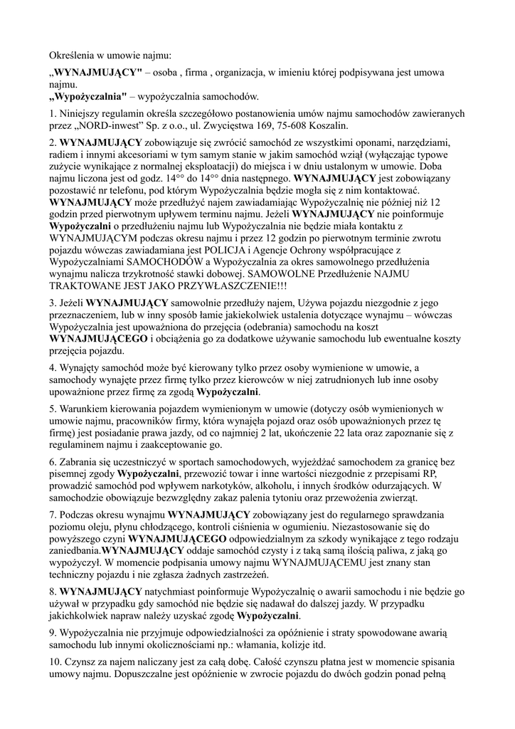 Określenia w umowie najmu: „WYNAJMUJĄCY" – osoba , firma , organizacja, w imieniu której podpisywana jest umowa najmu. ,,Wypożyczalnia" – wypożyczalnia samochodów. 1. Niniejszy regulamin określa szczegółowo postanowienia umów najmu samochodów zawieranych przez „NORD-inwest” Sp. z o.o., ul. Zwycięstwa 169, 75-608 Koszalin. 2. WYNAJMUJĄCY zobowiązuje się zwrócić samochód ze wszystkimi oponami, narzędziami, radiem i innymi akcesoriami w tym samym stanie w jakim samochód wziął (wyłączając typowe zużycie wynikające z normalnej eksploatacji) do miejsca i w dniu ustalonym w umowie. Doba najmu liczona jest od godz. 14°° do 14°° dnia następnego. WYNAJMUJĄCY jest zobowiązany pozostawić nr telefonu, pod którym Wypożyczalnia będzie mogła się z nim kontaktować. WYNAJMUJĄCY może przedłużyć najem zawiadamiając Wypożyczalnię nie później niż 12 godzin przed pierwotnym upływem terminu najmu. Jeżeli WYNAJMUJĄCY nie poinformuje Wypożyczalni o przedłużeniu najmu lub Wypożyczalnia nie będzie miała kontaktu z WYNAJMUJĄCYM podczas okresu najmu i przez 12 godzin po pierwotnym terminie zwrotu pojazdu wówczas zawiadamiana jest POLICJA i Agencje Ochrony współpracujące z Wypożyczalniami SAMOCHODÓW a Wypożyczalnia za okres samowolnego przedłużenia wynajmu nalicza trzykrotność stawki dobowej. SAMOWOLNE Przedłużenie NAJMU TRAKTOWANE JEST JAKO PRZYWŁASZCZENIE!!! 3. Jeżeli WYNAJMUJĄCY samowolnie przedłuży najem, Używa pojazdu niezgodnie z jego przeznaczeniem, lub w inny sposób łamie jakiekolwiek ustalenia dotyczące wynajmu – wówczas Wypożyczalnia jest upoważniona do przejęcia (odebrania) samochodu na koszt WYNAJMUJĄCEGO i obciążenia go za dodatkowe używanie samochodu lub ewentualne koszty przejęcia pojazdu. 4. Wynajęty samochód może być kierowany tylko przez osoby wymienione w umowie, a samochody wynajęte przez firmę tylko przez kierowców w niej zatrudnionych lub inne osoby upoważnione przez firmę za zgodą Wypożyczalni. 5. Warunkiem kierowania pojazdem wymienionym w umowie (dotyczy osób wymienionych w umowie najmu, pracowników firmy, która wynajęła pojazd oraz osób upoważnionych przez tę firmę) jest posiadanie prawa jazdy, od co najmniej 2 lat, ukończenie 22 lata oraz zapoznanie się z regulaminem najmu i zaakceptowanie go. 6. Zabrania się uczestniczyć w sportach samochodowych, wyjeżdżać samochodem za granicę bez pisemnej zgody Wypożyczalni, przewozić towar i inne wartości niezgodnie z przepisami RP, prowadzić samochód pod wpływem narkotyków, alkoholu, i innych środków odurzających. W samochodzie obowiązuje bezwzględny zakaz palenia tytoniu oraz przewożenia zwierząt. 7. Podczas okresu wynajmu WYNAJMUJĄCY zobowiązany jest do regularnego sprawdzania poziomu oleju, płynu chłodzącego, kontroli ciśnienia w ogumieniu. Niezastosowanie się do powyższego czyni WYNAJMUJĄCEGO odpowiedzialnym za szkody wynikające z tego rodzaju zaniedbania.WYNAJMUJĄCY oddaje samochód czysty i z taką samą ilością paliwa, z jaką go wypożyczył. W momencie podpisania umowy najmu WYNAJMUJĄCEMU jest znany stan techniczny pojazdu i nie zgłasza żadnych zastrzeżeń. 8. WYNAJMUJĄCY natychmiast poinformuje Wypożyczalnię o awarii samochodu i nie będzie go używał w przypadku gdy samochód nie będzie się nadawał do dalszej jazdy. W przypadku jakichkolwiek napraw należy uzyskać zgodę Wypożyczalni. 9. Wypożyczalnia nie przyjmuje odpowiedzialności za opóźnienie i straty spowodowane awarią samochodu lub innymi okolicznościami np.: włamania, kolizje itd. 10. Czynsz za najem naliczany jest za całą dobę. Całość czynszu płatna jest w momencie spisania umowy najmu. Dopuszczalne jest opóźnienie w zwrocie pojazdu do dwóch godzin ponad pełną dobę po wcześniejszym powiadomieniu Wypożyczalni. Kaucja - depozyt w okresie wynajmu wynosi od 1000 do 2500 PLN w zależności od klasy auta. Kaucji nie zatrzymuje się, jeśli sprawcą uszkodzenia pojazdu jest osoba trzecia i likwidacja szkody odbywa się z jego polisy ubezpieczeniowej. 11. W razie wypadku WYNAJMUJĄCY zobowiązany jest natychmiast powiadomić Policję i nalegać aby całe zdarzenie było przez Policję zarejestrowane. Należy natychmiast poinformować Wypożyczalnię o wypadku . Dowody (świadkowie, ślady) powinny być zabezpieczone, a nazwiska i adresy osób uczestniczących w wypadku powinny być spisane. Należy zrobić wszystko co pomogłoby w ustaleniu przyczyn wypadku i jego chronologii. WYNAJMUJACY nie powinien wykonywać żadnych czynności na własną rękę (nie powinien ustalać sam odpowiedzialności za wypadek). Jeżeli wypadek powstał z winy innego pojazdu – w oświadczeniu sprawcy muszą być następujące dane: dane osobowe kierowcy, nr prawa jazdy, nr dowodu osobistego, dane samochodu, nr polisy OC, dane firmy ubezpieczeniowej, w której ubezpieczony jest samochód i jeżeli jest to możliwe to ksero polisy OC i prawa jazdy. Wszelkie kradzieże, włamania, kolizje powinny być zawsze zgłaszane Policji i Wypożyczalni. 12. Jeżeli WYNAJMUJĄCY spowoduje uszkodzenie samochodu z własnej winy, wpłacona kaucja nie zostanie zwrócona - pozostaje na pokrycie kosztów naprawy. W przypadku konieczności ustalenia sprawcy wypadku kaucja zostaje w depozycie Wypożyczalni do jednoznacznego ustalenia sprawcy przez Policję lub upoważniony organ. Jeżeli samochód zostanie uszkodzony mechanicznie (porysowany lakier, zbite lusterko, urwana antena, wycieraczki itp.) klient zostanie obciążony rachunkiem zakupu części i ewentualną naprawą. Koszt lakierowania obejmuje pełne elementy oblachowania. Zabrania się jakichkolwiek modyfikacji w pojeździe bez zgody Wypożyczalni. 13. Jeżeli WYNAJMUJĄCY spowoduje uszkodzenie samochodu z własnej winy jest on zobowiązany do uiszczenia Wypożyczalni spłaty za wynajem pojazdu do czasu zakończenia jego naprawy. 14. WYNAJMUJĄCY jest odpowiedzialny za postój poja