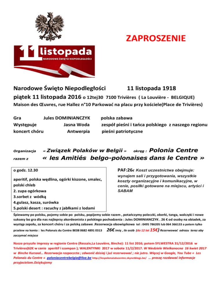 ZAPROSZENIE Narodowe Święto Niepodległości 11 listopada 1918 piątek 11 listopada 2016 o 12tej30à7100 Trivières ( La Louvière - BELGIQUE) Maison des Œuvres, rue Hallez n°10 Parkować na placu przy kościele(Place de Trivières) 12h30£ Gra Jules DOMINIANCZYK polska zabawa Występuje Jasna Woda zespół pieśni i tańca polskiego z naszego regionu koncert chóru Antwerpia pieśni patriotyczne Organizacja razem z Polonia Centre « les Amitiés belgo-polonaises dans le Centre » « Związek Polaków w Belgii » o godz. 12.30 aperitif, polska wędlina, ogórki kiszone, smalec, polski chleb 2. zupa ogórkowa 3.sorbet z wódką 4.gulasz, kasza, surówka 5.polski desert : racuchy z jabłkami z lodami okręg : PAF:26€ Koszt uczestnictwa obejmuje: wynajem sali i przygotowania, wszystkie koszty organizacyjne i komunikacyjne, w cenie, posiłki gotowane na miejscu, artyści i SABAM Śpiewamy po polsku, pojemy sobie po polsku, popijemy sobie razem , potańczymy poleczki, oberki, tanga, walczyki i nowe suksesy bo gra dla nas najleprzy akordeonista z polskiego pochodzenia : Jules DOMINIANCZYK . 26 € od osoby na obiadek, za występ zepołu, za koncert chóru i za polską zabawe .Rezerwacja obowiązkowa tel : 0495 786205 lub 064 366133 a potem tylko przelew na konto : les Polonais du Centre BE08 0682 4891 0313 26€ imię , ile osób (do 12 lat 15€) Rezerwować odrazu teraz aby zaczymać miejsca Nasze przyszłe imprezy w regionie Centre (Ressaix,La Louvière, Binche): 11 list 2016; potem SYLWESTRA 31/12/2016 w Trivières(62€ w cenie aperitif i szampan ); WALENTYNKI 2017 w sobote 11/2/2017. W Niedziele Wielkanocna 16 kwiet 2017 w Binche Kursaal… Rezerwacja rozpoczcta ; zdwonić dzisiaj i już rezerwować ; nie jutro. Więcej w Google, You Tube « Les Polonais du Centre » [email protected] http://lespolonaisducentre.skynetblogs.be/ … proszę rozdawać informacje przyjacielom.Dziękujemy