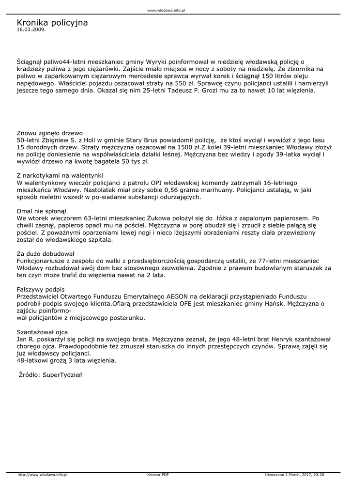 www.wlodawa.info.pl Kronika policyjna 16.03.2009. Ściągnął paliwo44-letni mieszkaniec gminy Wyryki poinformował w niedzielę włodawską policję o kradzieży paliwa z jego ciężarówki. Zajście miało miejsce w nocy z soboty na niedzielę. Ze zbiornika na paliwo w zaparkowanym ciężarowym mercedesie sprawca wyrwał korek i ściągnął 150 litrów oleju napędowego. Właściciel pojazdu oszacował straty na 550 zł. Sprawcę czynu policjanci ustalili i namierzyli jeszcze tego samego dnia. Okazał się nim 25-letni Tadeusz P. Grozi mu za to nawet 10 lat więzienia. Znowu zginęło drzewo 50-letni Zbigniew S. z Holi w gminie Stary Brus powiadomił policję, że ktoś wyciął i wywiózł z jego lasu 15 dorodnych drzew. Straty mężczyzna oszacował na 1500 zł.Z kolei 39-letni mieszkaniec Włodawy złożył na policję doniesienie na współwłaściciela działki leśnej. Mężczyzna bez wiedzy i zgody 39-latka wyciął i wywiózł drzewo na kwotę bagatela 50 tys zł. Z narkotykami na walentynki W walentynkowy wieczór policjanci z patrolu OPI włodawskiej komendy zatrzymali 16-letniego mieszkańca Włodawy. Nastolatek miał przy sobie 0,56 grama marihuany. Policjanci ustalają, w jaki sposób nieletni wszedł w po-siadanie substancji odurzających. Omal nie spłonął We wtorek wieczorem 63-letni mieszkaniec Żukowa położył się do łóżka z zapalonym papierosem. Po chwili zasnął, papieros opadł mu na pościel. Mężczyzna w porę obudził się i zrzucił z siebie palącą się pościel. Z poważnymi oparzeniami lewej nogi i nieco lżejszymi obrażeniami reszty ciała przewieziony został do włodawskiego szpitala. Za dużo dobudował Funkcjonariusze z zespołu do walki z przedsiębiorczością gospodarczą ustalili, że 77-letni mieszkaniec Włodawy rozbudował swój dom bez stosownego zezwolenia. Zgodnie z prawem budowlanym staruszek za ten czyn może trafić do więzienia nawet na 2 lata. Fałszywy podpis Przedstawiciel Otwartego Funduszu Emerytalnego AEGON na deklaracji przystąpieniado Funduszu podrobił podpis swojego klienta.Ofiarą przedstawiciela OFE jest mieszkaniec gminy Hańsk. Mężczyzna o zajściu poinformował policjantów z miejscowego posterunku. Szantażował ojca Jan R. poskarżył się policji na swojego brata. Mężczyzna zeznał, że jego 48-letni brat Henryk szantażował chorego ojca. Prawdopodobnie też zmuszał staruszka do innych przestępczych czynów. Sprawą zajęli się już włodawscy policjanci. 48-latkowi grożą 3 lata więzienia. Źródło: SuperTydzień http://www.wlodawa.info.pl Kreator PDF Utworzono 2 March, 2017, 23:26