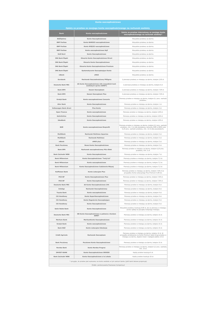 Konta oszczędnościowe Opłaty za przelew ze swojego konta oszczędnościowego na rachunek osobisty Bank Konto oszczędnościowe Opłata za przelew internetowy ze swojego konta oszczędnościowego na rachunek osobisty* BGŻOptima Konto Oszczędnościowe Wszystkie przelewy za darmo. BNP Paribas Konto BARDZO oszczędnościowe Wszystkie przelewy za darmo. BNP Paribas Konto WIĘCEJ oszczędnościowe Wszystkie przelewy za darmo. BNP Paribas Konto oszczędnościowe Sejf Wszystkie przelewy za darmo. DnB Nord Konto Oszczędnościowe Wszystkie przelewy za darmo. ING Bank Śląski Otwarte Konto Oszczędnościowe Direct Wszystkie przelewy za darmo. ING Bank Śląski Otwarte Konto Oszczędnościowe Wszystkie przelewy za darmo. ING Bank Śląski Otwarte Konto Oszczędnościowe Premium Wszystkie przelewy za darmo. ING Bank Śląski Systematycznie Oszczędzające Konto Wszystkie przelewy za darmo. mBank eMAX Wszystkie przelewy za darmo. 2 pierwsze przelewy w miesiącu za darmo, kolejne 2,95 zł. Eurobank Rachunek Oszczednościowy PROgres Deutsche Bank PBC db Konto Oszczędnościowe (dla wszystkich kont osobistych oprócz dbNET) 2 pierwsze przelewy w miesiącu za darmo, kolejne 6 zł. Bank BPH Sezam Oszczędzam 2 pierwsze przelewy w miesiącu za darmo, kolejne 7,99 zł. Bank BPH Sezam Oszczędzam Plus 2 pierwsze przelewy w miesiącu za darmo, kolejne 7,99 zł. Kredyt Bank Konto oszczędnościowe Concerto Pierwszy przelew w miesiącu za darmo, kolejne 0,1 proc. wartości przelewu. Alior Bank Konto Oszczędnościowe Pierwszy przelew w miesiącu za darmo, kolejne 1 zł. Volkswagen Bank direct Plus Konto Pierwszy przelew w miesiącu za darmo, kolejne 2 zł. Open Finance Konto oszczędnościowe Pierwszy przelew w miesiącu za darmo, kolejne 4,99 zł. GetinOnline Konto Oszczędnościowe Pierwszy przelew w miesiącu za darmo, kolejne 4,99 zł. IdeaBank Konto Oszczędnościowe Pierwszy przelew w miesiącu za darmo, kolejne 4,99 zł. BOŚ Konto oszczędnościowe Ekoprofit Pierwszy przelew w miesiącu za darmo, kolejne 0,2 proc. wartości przelewu, min. 5 zł (dla posiadaczy rachunku ROR w BOŚ) oraz 0,25 proc. wartości przelewu, min. 12 zł (dla pozostałych). MultiBank Rachunek Multimax Aquarius Pierwszy przelew w miesiącu za darmo, kolejne 5 zł. MultiBank Rachunek Multimax Pierwszy przelew w miesiącu za darmo, kolejne 5 zł. mBank eMAX plus Pierwszy przelew w miesiącu za darmo, kolejne 5 zł. Bank Pocztowy Nowe Konto Oszczędnościowe Pierwszy przelew w miesiącu za darmo, kolejne 5 zł. Bank BPS Rachunek oszczędnościowy POL-Efekt Pierwszy przelew w miesiącu za darmo, kolejne 0,25 proc. przelewu, min. 5 zł. Bank Zachodni WBK Konto Oszczędnościowe Pierwszy przelew w miesiącu za darmo, kolejne 7 zł. Bank Millennium Konto Oszczędnościowe "Twój Cel" Pierwszy przelew w miesiącu za darmo, kolejne 7,5 zł. Bank Millennium Konto oszczędnościowe Pierwszy przelew w miesiącu za darmo, kolejne 7,5 zł. Bank Millennium Konto Oszczędnościowe Codziennie Więcej Pierwszy przelew w miesiącu za darmo, kolejne 7,5 zł. Raiffeisen Bank Konto Lokacyjne Plus Pierwszy przelew w miesiącu za darmo, kolejne 7,99 zł (w przypadku Konta Lokacyjnego Plus Premium 4,99 zł). PKO BP Konto Oszczędnościowe Plus Pierwszy przelew w miesiącu za darmo, kolejne 7,99 zł. PKO BP Konto Oszczędnościowe Pierwszy przelew w miesiącu za darmo, kolejne 7,99 zł. Deutsche Bank PBC db Konto Oszczędnościowe 24h Pierwszy przelew w miesiącu za darmo, kolejne 8 zł. Inteligo Rachunek Oszczędościowy Pierwszy przelew w miesiącu za darmo, kolejne 8 zł. Toyota Bank Konto oszczędnościowe Pierwszy przelew w miesiącu za darmo, kolejne 9 zł. Citi Handlowy Konto SuperOszczędnościowe Pierwszy przelew w miesiącu za darmo, kolejne 9 zł. Citi Handlowy Konto Regularnie Oszczędzające Pierwszy przelew w miesiącu za darmo, kolejne 9 zł. Citi Handlowy Konto Oszczędnościowe Pierwszy przelew w miesiącu za darmo, kolejne 9 zł. Getin Noble Bank Konto Oszczędnościowe Wszystkie przelewy kosztują 9,99 zł, ale za pierwszy w miesiącu zwróci opłatę na początku kolejnego miesiąca. Deutsche Bank PBC DB Konto Oszczędnościowe w pakiecie z Kontem dbNET Pierwszy przelew w miesiącu za darmo, kolejne 10 zł. Meritum Bank MeritumKonto Oszczędnościowe Pierwszy przelew w miesiącu za darmo, kolejne 10 zł. Kredyt Bank Konto oszczędnościowe Pierwszy przelew w miesiącu za darmo, kolejne 10 zł. Bank BGŻ Konto Lokacyjne Eskalacja Pierwszy przelew w miesiącu za darmo, kolejne 10 zł. Crédit Agricole Rachunek Oszczędzam Pierwszy przelew w miesiącu za darmo, kolejne 10 zł. W przypadku przelewania na Konto Premium także drugi przelew w miesiącu za darmo, dopiero trzeci i następne płatny 10 zł. Bank Pocztowy Pocztowe Konto Oszczędnościowe Pierwszy przelew w miesiącu za darmo, kolejne 10 zł. Nordea Bank Konto Nordea Progres Pierwszy przelew w miesiącu za darmo, kolejne 0,2 proc. wartości, min. 10 zł. INVEST-BANK Konto Oszczędnościowe GROSIK Każdy przelew kosztuje 6 zł. Bank Zachodni WBK Konto Oszczędnościowe a la Lokata Każdy przelew kosztuje 20 zł. * przyjęto, że przelew jest wykonany na konto osobiste w tym samym banku (jeśli bank takowe proponuje) Żródło: porównywarka finansowa Comperia.pl Comperia.pl S.A., założona w 2008 roku, była pierwszą w Polsce porównywaką produktów finansowych, twórcą tej kategorii w polskim Internecie. Obecnie należy do najczęściej odwiedzanych witryn internetowych w kraju. Według danych Google Analytics serwisy Grupy Comperia.pl poświęcone finansom osobistym odwiedza co Comperia.pl, Banki.pl, portal poświęcony kredytom hipotecznym eHipoteka.com.pl serwis motoryzacyjny Autoa.pl, portal Kontoteka.pl oraz ComperiaLead czyli rozbudowany program miesiąc milion internautów. W skład Grupy Comperia, oprócz porównywarki finansowej wchodzi także serwis partnerski. Comperia.pl S.A. notowana jest na rynku New Connect.