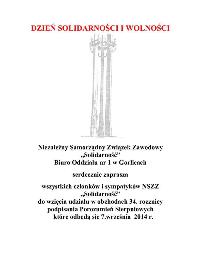 DZIEŃ SOLIDARNOŚCI I WOLNOŚCI Niezależny Samorządny Związek Zawodowy „Solidarność” Biuro Oddziału nr 1 w Gorlicach serdecznie zaprasza wszystkich członków i sympatyków NSZZ „Solidarność” do wzięcia udziału w obchodach 34. rocznicy podpisania Porozumień Sierpniowych które odbędą się 7.września 2014 r. Program uroczystości: 1245 zbiórka pocztów sztandarowych przed Bazyliką Mniejszą w Gorlicach. 1300 uroczysta msza św. w Bazylice Mniejszej w Gorlicach w intencji Ojczyzny i NSZZ „Solidarność” w 34.rocznicę jego powstania. bezpośrednio po mszy św. przemarsz pocztów sztandarowych i uczestników na Cmentarz Parafialny, złożenie kwiatów , zapalenie zniczy pod tablicą upamiętniającą ks. Jerzego Popiełuszko i Krzyżem Katyńskim.