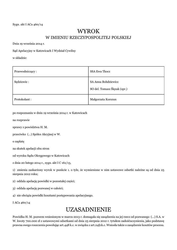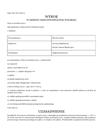 Sygn. akt I ACa 460/14 WYROK W IMIENIU RZECZYPOSPOLITEJ POLSKIEJ Dnia 19 września 2014 r. Sąd Apelacyjny w Katowicach I Wydział Cywilny w składzie: Przewodniczący : SSA Ewa Tkocz Sędziowie : SA Anna Bohdziewicz SO del. Tomasz Ślęzak (spr.) Protokolant : Małgorzata Korszun po rozpoznaniu w dniu 19 września 2014 r. w Katowicach na rozprawie sprawy z powództwa H. M. przeciwko (...) Spółce Akcyjnej w W. o zapłatę na skutek apelacji obu stron od wyroku Sądu Okręgowego w Katowicach z dnia 20 lutego 2014 r., sygn. akt I C 161/13, 1) zmienia zaskarżony wyrok w punkcie 1. o tyle, że wymienione w nim ustawowe odsetki należne są od dnia 25 sierpnia 2012 roku; 2) oddala apelację powódki w pozostałej części; 3) oddala apelację pozwanej w całości; 4) nie obciąża powódki kosztami postępowania apelacyjnego. I ACa 460/14 UZASADNIENIE Powódka H. M. pozwem wniesionym w marcu 2013 r. domagała się zasądzenia na jej rzecz od pozwanego (...) S.A. w W. kwoty 700.000 zł z ustawowymi odsetkami od dnia 25 sierpnia 2012 r. tytułem zadośćuczynienia, jako podstawę prawna swego roszczenia powołując art.448 k.c. w związku z art.24§1k.c. Wniosła także o zasądzenie kosztów procesu. W uzasadnieniu powódka podała, że dnia (...) miał miejsce wypadek komunikacyjny w wyniku, którego śmierć na miejscu ponieśli jej syn S. M. i wnukowie T. i K. K., a w wyniku obrażeń w szpitalu zmarli jej mąż E. M. i córka E. K.. Sprawca wypadku został uznany za winnego popełnienia czynu z art.177§2 k.k. wyrokiem Sądu Rejonowego w S. z dnia 15 października 2003 r. Jego pojazd był ubezpieczony w zakresie odpowiedzialności cywilnej w pozwanej spółce. Pozwany odmówił powódce wypłaty zadośćuczynienia wskazując na brak podstawy prawnej dla zgłoszonego roszczenia. W związku z tym tragicznym zdarzeniem, powódka musiała podjąć leczenie psychiatryczne. Rozpoznano u niej nawracające zaburzenia depresyjne oraz zaburzenia nerwicowe. W jej ocenie, żądana kwota zadośćuczynienia jest odpowiednia mając na uwadze rozmiar jej krzywdy na skutek śmierci najbliższych osób. Pozwany (...) Spółka Akcyjna w W. w odpowiedzi na pozew wniósł o oddalenie powództwa i zasądzenie na jego rzecz od powódki kosztów procesu. W uzasadnieniu swego stanowiska pozwany w pierwszej kolejności, przywołując art.4421§1, §2 i §3 k.c., podniósł zarzut przedawnienia roszczenia powódki, wyjaśnił, że w toku postępowania likwidacyjnego po zgłoszeniu szkody pismem z dnia 20 kwietnia 2012r. wypłacił powódce odszkodowanie w kwocie 20.000zł z tytułu zgonu jej męża i syna oraz koszty ich pogrzebu w kwocie 7.316,50zł, ale odmówił wypłaty zadośćuczynienia, gdyż jego zdaniem skoro przepisy kodeksu cywilnego przed 2008 r. nie przewidywały zadośćuczynienia dla najbliższych osoby, która zmarła w wyniku uszkodzenia ciała lub rozstroju zdrowia, to nie jest dopuszczalne zasądzenie go na podstawie art.448 k.c. w zw. z art.23 i 24 k.c. Pozwany także, przywołując art.822§1 k.c. (w brzmieniu obowiązującym w dacie wypadku) i art.34§1 ustawy z dnia 22 maja 2003r. o ubezpieczeniach obowiązkowych, ubezpieczeniowym Funduszu Gwarancyjnym i Polskim Biurze Ubezpieczeń Komunikacyjnych, podniósł, że nie obejmują one roszczeń z tytułu naruszenia dóbr osobistych osób trzecich z art.448 k.c. Niezależnie od tego pozwany zakwestionował wysokość żądanej kwoty zadośćuczynienia jako nadmiernie wygórowanej, a także żądanie odsetek od tej kwoty od dnia 25 sierpnia 2012 r. Wyrokiem z dnia 20 lutego 2014 r. Sąd Okręgowy w Katowicach zasądził od pozwanego na rzecz powódki 300 000 złotych, z ustawowymi odsetkami od dnia wyrokowania, kwoty 800 złotych i 7217 złotych z tytułu odpowiednio zwrotu kosztów sądowych i kosztów zastępstwa procesowego; oddalił powództwo w pozostałej części i nakazał pobranie od stron należne Skarbowi Państwa koszty sądowe. Sąd pierwszej instancji ustalił, że powódka od 1971 r. była żoną E. M.. Z ich małżeństwa urodziło się dwoje dzieci syn S. w dniu 7 maja 1978r. i córka E. w dniu (...). Córka powódki z małżeństwa z R. K. zawartym dnia 20 lutego 1993r. posiadała dwóch synów T. urodzonego w dniu (...). i K. urodzonego w dniu (...) W nocy z (...) na drodze (...) w rejonie (...), W. O., kierując ciągnikiem siodłowym marki V. z naczepą, przewożąc ładunek ponadnormatywny nieumyślnie naruszył zasady bezpieczeństwa w ruchu lądowym w ten sposób, że nie zachowując należytej ostrożności i nie obserwując przedpola jazdy zjechał na pas awaryjny i uderzył przodem ciągnika w stojące poza jezdnią prawidłowo oświetlone samochody: marki P. (...) oraz F. (...) w wyniku czego śmierć na miejscu ponieśli pasażerowie F. (...) – S. M. oraz T. K., natomiast w wyniku obrażeń w szpitalu zmarli kierowca tego pojazdu – E. M. w dniu (...) i pasażerka – E. K. w dniu (...) Sąd Rejonowy w S. wyrokiem z dnia 15 października 2003r. syg. akt VII K 1153/02 oskarżonego W. O. uznał za winnego popełnienia opisanego czynu stanowiącego przestępstwo z art.177§2 k.k. Sprawca zdarzenia w dacie wypadku był ubezpieczony w zakresie odpowiedzialności cywilnej posiadaczy pojazdów mechanicznych w pozwanym towarzystwie ubezpieczeń. E. M. mąż powódki w dacie wypadku liczył 49 lat, małżonkowie mieszkali razem, prowadzili wspólne gospodarstwo domowe, planowali zamieszkać we W., aby mieszkanie do tej pory zajmowane zostawić synowi. Żyli zgodnie, byli ze sobą bardzo związani, tworzyli wzorowe małżeństwo, darzyli się miłością i szacunkiem, dbali o siebie nawzajem oraz o dzieci i wnuki, które były dla nich priorytetem. E. M. był bardzo dobrym mężem, ojcem i dziadkiem. S. M. syn powódki w dacie wypadku liczył 24 lata. Mieszkał z rodzicami. Podobnie jak ojciec znalazł pracę we W.. Ze związku pozamałżeńskiego posiadał córkę, która obecnie liczy 14 lat. Relacje powódki z synem był