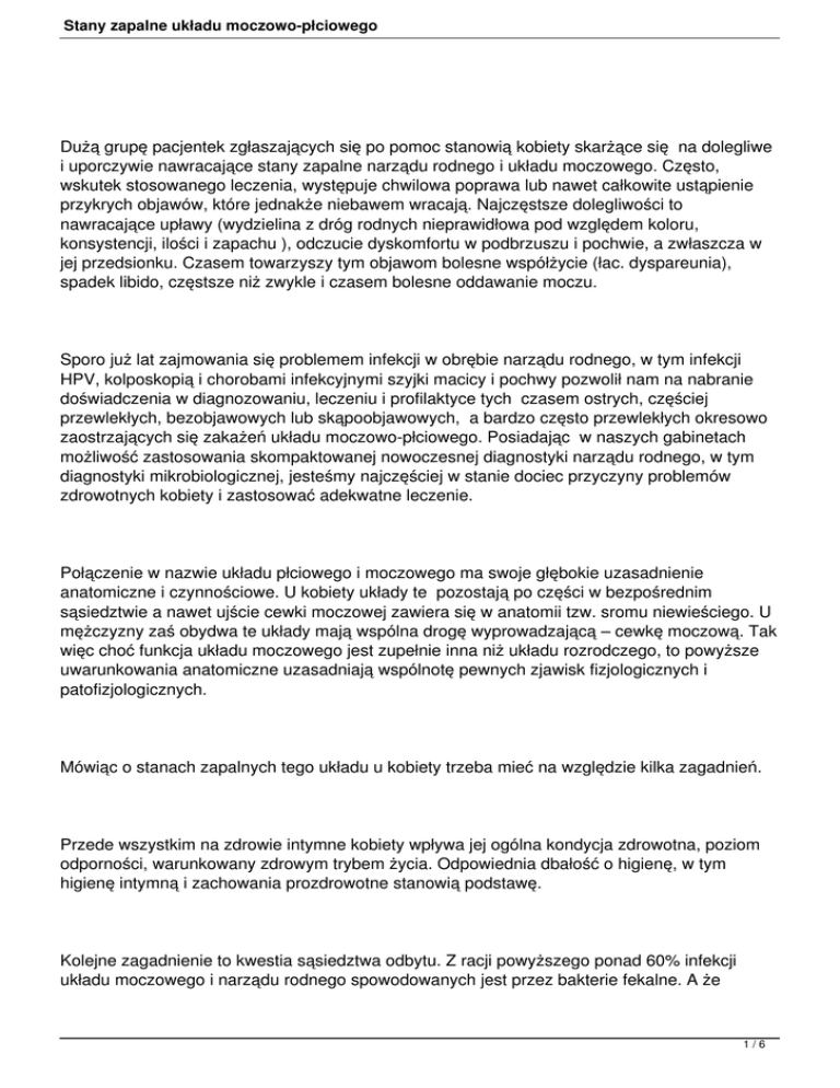 Stany zapalne układu moczowo-płciowego Dużą grupę pacjentek zgłaszających się po pomoc stanowią kobiety skarżące się na dolegliwe i uporczywie nawracające stany zapalne narządu rodnego i układu moczowego. Często, wskutek stosowanego leczenia, występuje chwilowa poprawa lub nawet całkowite ustąpienie przykrych objawów, które jednakże niebawem wracają. Najczęstsze dolegliwości to nawracające upławy (wydzielina z dróg rodnych nieprawidłowa pod względem koloru, konsystencji, ilości i zapachu ), odczucie dyskomfortu w podbrzuszu i pochwie, a zwłaszcza w jej przedsionku. Czasem towarzyszy tym objawom bolesne współżycie (łac. dyspareunia), spadek libido, częstsze niż zwykle i czasem bolesne oddawanie moczu. Sporo już lat zajmowania się problemem infekcji w obrębie narządu rodnego, w tym infekcji HPV, kolposkopią i chorobami infekcyjnymi szyjki macicy i pochwy pozwolił nam na nabranie doświadczenia w diagnozowaniu, leczeniu i profilaktyce tych czasem ostrych, częściej przewlekłych, bezobjawowych lub skąpoobjawowych, a bardzo często przewlekłych okresowo zaostrzających się zakażeń układu moczowo-płciowego. Posiadając w naszych gabinetach możliwość zastosowania skompaktowanej nowoczesnej diagnostyki narządu rodnego, w tym diagnostyki mikrobiologicznej, jesteśmy najczęściej w stanie dociec przyczyny problemów zdrowotnych kobiety i zastosować adekwatne leczenie. Połączenie w nazwie układu płciowego i moczowego ma swoje głębokie uzasadnienie anatomiczne i czynnościowe. U kobiety układy te pozostają po części w bezpośrednim sąsiedztwie a nawet ujście cewki moczowej zawiera się w anatomii tzw. sromu niewieściego. U mężczyzny zaś obydwa te układy mają wspólna drogę wyprowadzającą – cewkę moczową. Tak więc choć funkcja układu moczowego jest zupełnie inna niż układu rozrodczego, to powyższe uwarunkowania anatomiczne uzasadniają wspólnotę pewnych zjawisk fizjologicznych i patofizjologicznych. Mówiąc o stanach zapalnych tego układu u kobiety trzeba mieć na względzie kilka zagadnień. Przede wszystkim na zdrowie intymne kobiety wpływa jej ogólna kondycja zdrowotna, poziom odporności, warunkowany zdrowym trybem życia. Odpowiednia dbałość o higienę, w tym higienę intymną i zachowania prozdrowotne stanowią podstawę. Kolejne zagadnienie to kwestia sąsiedztwa odbytu. Z racji powyższego ponad 60% infekcji układu moczowego i narządu rodnego spowodowanych jest przez bakterie fekalne. A że 1/6 Stany zapalne układu moczowo-płciowego kobieta ma „relatywnie krótszą” cewkę moczową, toteż mechanizmy obronne działają słabiej. Częściej zatem jest narażona na bezobjawowe zakażenie układu moczowego (ZUM). Trzeba tu wyjaśnić, że w cewce moczowej znajduje się normalnie dużo różnych bakterii, w tym bakterie fekalne. Zaś od pęcherza moczowego począwszy idąc w górę układ moczowy powinien być jałowy. ZUM jest bezobjawowy. Okresowo przy osłabieniu organizmu, wyziębieniu, przewianiu może się zakażenie przekształcić w pełnoobjawowe zapalenie, najczęściej pęcherza moczowego. Wówczas nawracające ciągle parcie na mocz i jego bolesne oddawanie w małych porcjach zmusza do udania się po pomoc lekarską. Ustąpienie zaś objawów zapalenia często powoduje zaprzestanie dalszego przyjmowania zaleconych leków i ostre zapalenie znów zmienia się w przewlekłe zakażenie (ZUM). A takie leczenie winno być kontynuowane do końca i jego efekty zweryfikowane badaniem bakteriologicznym. Czasem ZUM przekształca się w odmiedniczkowe zapalenie nerek z towarzyszącą kolką nerkową i podwyższoną temperaturą ciała. Taki stan tym bardziej wymaga skrupulatnego wyleczenia. ZUM nie musi nawet dawać znać o sobie w badaniu ogólnym moczu, co najwyżej zmianę odczynu z kwaśnego na obojętny lub alkaliczny (zasadowy), co najczęściej bywa bagatelizowane. Poza tym badanie ogólne moczu daje jedynie informacje ogólne na temat funkcjonowania układu moczowego. Informacji bakteriologicznych dostarcza badanie bakteriologiczne (mikrobiologiczne) czyli posiew moczu. ZUM jest szczególnie niebezpieczny w ciąży. Udokumentowano, że powoduje wzrost odsetka poronień, obumarcia ciąż, porodów przedwczesnych, zakażeń wewnątrzmacicznych. Wykrycie go w ciąży stanowi bezwzględne wskazanie do leczenia antybiotykami. Czasem jest to trudne, bowiem w ciąży zakres leków możliwych do zastosowania jest ograniczony. A poza tym, żeby go wykryć, trzeba zrobić badania bakteriologiczne. Tymczasem w panelu badań przesiewowych wykonywanych w ciąży prawidłowej posiewu moczu nie ma… . Dlatego najlepiej taką diagnostykę zrobić przed planowaną ciążą, w ramach poradnictwa prekoncepcyjnego. Ponadto należy zaznaczyć, że krople zakażonego moczu mogą bez problemu dostać się do pochwy, powodując rozprzestrzenianie się zakażenia w toku tzw. infekcji wstępującej, do coraz wyższych pięter narządu rodnego i w efekcie być odpowiedzialne za poważne jego stany zapalne. Mogą być one przewlekłe bezobjawowe lub skąpoobjawowe i prowadzić do niepłodności bądź ciąży pozamacicznej, mogą okresowo zaostrzać się (z bólami w podbrzuszu i gorączką). Mogą też przyjąć postać guzów zapalnych przydatków (jajników i jajowodów), wymagających leczenia szpitalnego a czasem też i operacji. Stan zapalny pochwy manifestuje się subiektywnymi objawami dyskomforu oraz upławami (nieprawidłową, obfitszą niż zwykle wydzieliną pochwową o nietypowej barwie, konsystencji, zapachu). Do najczęstszych stanów zapalnych pochwy i sromu u kobiet należy grzybica (drożdżyca), wywoływana przez drożdżaki (grzyby drożdżopodobne - drożdżoidalne), a głównie przez pleśniaka białego (candida albicans). W warunkach normalnych w pochwie zdrowej kobiety 2/6 Stany zapalne układu moczowo-płciowego mogą występować niewielkie ilości zarodników tego grzyba. Nie ma w t