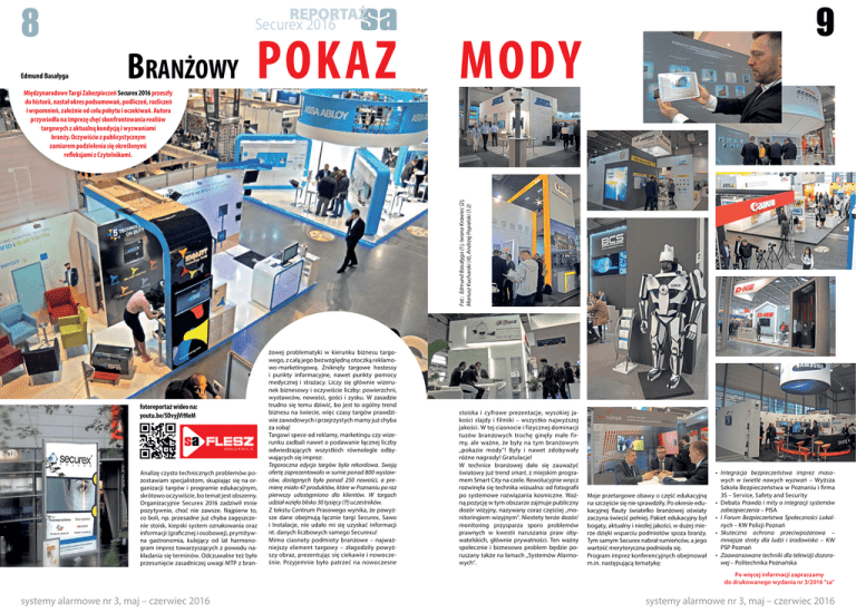 8 Edmund Basałyga Reportaż Securex 2016 Branżowy mody Fot.: Edmund Basałyga (1), Iwona Krawiec (2), Mariusz Kucharski (4), Andrzej Popielski (12) Międzynarodowe Targi Zabezpieczeń Securex 2016 przeszły do historii, nastał okres podsumowań, podliczeń, rozliczeń i wspomnień, zależnie od celu pobytu i oczekiwań. Autora przywiodła na imprezę chęć skonfrontowania realiów targowych z aktualną kondycją i wyzwaniami branży. Oczywiście z publicystycznym zamiarem podzielenia się określonymi refleksjami z Czytelnikami. pokaz 9 fotoreportaż wideo na: youtu.be/SDvyjVi9leM Analizę czysto technicznych problemów pozostawiam specjalistom, skupiając się na organizacji targów i programie edukacyjnym, skrótowo oczywiście, bo temat jest obszerny. Organizacyjnie Securex 2016 zadziwił mnie pozytywnie, choć nie zawsze. Najpierw to, co boli, np. przesadne już chyba zagęszczenie stoisk, kiepski system oznakowania oraz informacji (graficznej i osobowej), prymitywna gastronomia, kulejący od lat harmonogram imprez towarzyszących z powodu nakładania się terminów. Odczuwalne też było przesunięcie zasadniczej uwagi MTP z bran- żowej problematyki w kierunku biznesu targowego, z całą jego bezwzględną otoczką reklamowo-marketingową. Zniknęły targowe hostessy i punkty informacyjne, nawet punkty pomocy medycznej i strażacy. Liczy się głównie wizerunek biznesowy i oczywiście liczby: powierzchni, wystawców, nowości, gości i zysku. W zasadzie trudno się temu dziwić, bo jest to ogólny trend biznesu na świecie, więc czasy targów prawdziwie zawodowych i przejrzystych mamy już chyba za sobą! Targowi spece od reklamy, marketingu czy wizerunku zadbali nawet o podawanie łącznej liczby odwiedzających wszystkich równolegle odbywających się imprez: Tegoroczna edycja targów była rekordowa. Swoją ofertę zaprezentowało w sumie ponad 800 wystawców, dostępnych było ponad 250 nowości, a premierę miało 47 produktów, które w Poznaniu po raz pierwszy udostępniono dla klientów. W targach udział wzięło blisko 30 tysięcy (?!) uczestników. Z tekstu Centrum Prasowego wynika, że powyższe dane obejmują łącznie targi Securex, Sawo i Instalacje, nie udało mi się uzyskać informacji nt. danych liczbowych samego Securexu! Mimo ciasnoty podmioty branżowe – najważniejszy element targowy – złagodziły powyższy obraz, prezentując się ciekawie i nowocześnie. Przyjemnie było patrzeć na nowoczesne stoiska i cyfrowe prezentacje, wysokiej jakości slajdy i filmiki – wszystko najwyższej jakości. W tej ciasnocie i fizycznej dominacji tuzów branżowych trochę ginęły małe firmy, ale ważne, że były na tym branżowym „pokazie mody”! Były i nawet zdobywały różne nagrody! Gratulacje! W technice branżowej dało się zauważyć światowy już trend smart, z miejskim programem Smart City na czele. Rewolucyjnie wręcz rozwinęła się technika wizualna: od fotografii po systemowe rozwiązania kosmiczne. Ważną pozycję w tym obszarze zajmuje publiczny dozór wizyjny, nazywany coraz częściej „monitoringiem wizyjnym”. Niestety tenże dozór/ monitoring przysparza sporo problemów prawnych w kwestii naruszania praw obywatelskich, głównie prywatności. Ten ważny społecznie i biznesowo problem będzie poruszany także na łamach „Systemów Alarmowych”. Moje przetargowe obawy o część edukacyjną na szczęście się nie sprawdziły. Po okresie edukacyjnej flauty światełko branżowej oświaty zaczyna świecić pełniej. Pakiet edukacyjny był bogaty, aktualny i niezłej jakości, w dużej mierze dzięki wsparciu podmiotów spoza branży. Tym samym Securex nabrał rumieńców, a jego wartość merytoryczna podniosła się. Program imprez konferencyjnych obejmował m.in. następującą tematykę: • Integracja bezpieczeństwa imprez masowych w świetle nowych wyzwań – Wyższa Szkoła Bezpieczeństwa w Poznaniu i firma 3S – Service, Safety and Security • Debata Prawda i mity o integracji systemów zabezpieczenia – PISA • I Forum Bezpieczeństwa Społeczności Lokalnych – KW Policji Poznań • Skuteczna ochrona przeciwpożarowa – mniejsze straty dla ludzi i środowiska – KW PSP Poznań • Zaawansowane techniki dla telewizji dozorowej – Politechnika Poznańska Po więcej informacji zapraszamy do drukowanego wydania nr 3/2016 "sa" systemy alarmowe nr 3, maj – czerwiec 2016 systemy alarmowe nr 3, maj – czerwiec 2016