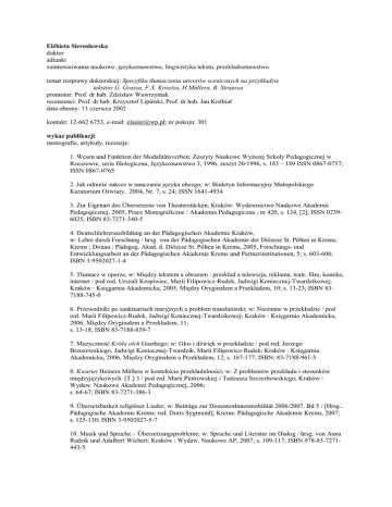 Elżbieta Sierosławska doktor adiunkt zainteresowania naukowe: językoznawstwo, lingwistyka tekstu, przekładoznawstwo temat rozprawy doktorskiej: Specyfika tłumaczenia utworów scenicznych na przykładzie tekstów G. Grassa, F.X. Kroetza, H.Müllera, B. Straussa promotor: Prof. dr hab. Zdzisław Wawrzyniak recenzenci: Prof. dr hab. Krzysztof Lipiński; Prof. dr hab. Jan Koźbiał data obrony: 13 czerwca 2002 kontakt: 12-662 6753, e-mail: [email protected]; nr pokoju: 301 wykaz publikacji: monografie, artykuły, recenzje: 1. Wesen und Funktion der Modalitätsverben; Zeszyty Naukowe Wyższej Szkoły Pedagogicznej w Rzeszowie, seria filologiczna, Językoznawstwo 3, 1996, zeszyt 20/1996, s. 183 – 189 ISSN 0867-0757; ISSN 0867-0765 2. Jak odnieść sukces w nauczaniu języka obcego; w: Biuletyn Informacyjny Małopolskiego Kuratorium Oświaty. 2004, Nr. 7, s. 24; ISSN 1641-4934 3. Zur Eigenart des Übersetzens von Theaterstücken, Kraków: Wydawnictwo Naukowe Akademii Pedagogicznej, 2005, Prace Monograficzne / Akademia Pedagogiczna ; nr 420, s. 134, [2]; ISSN 02396025; ISBN 83-7271-340-5 4. Deutschlehrerausbildung an der Pädagogischen Akademie Kraków, w: Lehre durch Forschung / hrsg. von der Pädagogischen Akademie der Diözese St. Pölten in Krems; Krems ; Donau : Pädagog. Akad. d. Diözese St. Pölten in Krems, 2005, Forschungs- und Entwicklungsarbeit an der Pädagogischen Akademie Krems und Partnerinstitutionen, 5; s. 603-606; ISBN 3-9502027-1-4 5. Tłumacz w operze, w: Między tekstem a obrazem : przekład a telewizja, reklama, teatr, film, komiks, internet / pod red. Urszuli Kropiwiec, Marii Filipowicz-Rudek, Jadwigi Koniecznej-Twardzikowej; Kraków : Księgarnia Akademicka, 2005, Między Oryginałem a Przekładem, 10; s. 13-23; ISBN 837188-745-0 6. Przewodniki po sanktuariach maryjnych a problem translatorski; w: Nieznane w przekładzie / pod red. Marii Filipowicz-Rudek, Jadwigi Koniecznej-Twardzikowej; Kraków : Księgarnia Akademicka, 2006, Między Oryginałem a Przekładem, 11; s. 13-18; ISBN 83-7188-859-7 7. Muzyczność Króla olch Goethego; w: Głos i dźwięk w przekładzie / pod red. Jerzego Brzozowskiego, Jadwigi Koniecznej-Twardzik, Marii Filipowicz-Rudek; Kraków : Księgarnia Akademicka, 2006, Między Oryginałem a Przekładem, 12; s. 167-177; ISBN: 83-7188-961-5 8. Kwartet Heinera Müllera w kontekście przekładalności; w: Z problemów przekładu i stosunków międzyjęzykowych. [T.] 3 / pod red. Marii Piotrowskiej i Tadeusza Szczerbowskiego; Kraków : Wydaw. Naukowe Akademii Pedagogicznej, 2006; s. 64-67; ISBN 83-7271-386-3 9. Übersetzbarkeit religiöser Lieder; w: Beiträge zur DozentenInnenmobilität 2006/2007. Bd 5 / [Hrsg.: Pädagogische Akademie Krems; red. Doris Sygmund]; Krems: Pädagogische Akademie Krems, 2007; s. 125-130; ISBN 3-9502027-5-7 10. Musik und Sprache – Übersetzungsprobleme; w: Sprache und Literatur im Dialog / hrsg. von Anna Radzik und Adalbert Wichert; Kraków : Wydaw. Naukowe AP, 2007; s. 109-117; ISBN 978-83-7271443-5 11. Akcenty muzyczne i wyrazowe w tekstach arii operowych na przykładzie arii Iselli z opery F. Schuberta Spiskowcy; w: Stil. - 2007, Vol. 6, s. 347-352; ISSN 1451-3145 12. Fraza muzyczna a fraza tekstowa. Prozodia w przekładzie arii operowych, Kraków: Wydaw. Naukowe Akademii Pedagogicznej, 2008, Prace Monograficzne / Akademia Pedagogiczna ; nr 486, s. 143, [1]; ISSN 0239-6025; ISBN 978-83-7271-463-3 13. Medienwelt der Oper; w: Germanistische Wahrnehmungen der Multimedialität, Multilingualität und Multikulturalität/ hrsg. von Franciszek Grucza, Hans-Jörg Schwenk, Magdalena Olpińska; Wydawnictwo Euro-Edukacja, Warszawa 2007; s. 141-147; ISBN 978-83-60729-14-4 14. Praca recenzowana: Język angielski kluczem do języka niemieckiego, język niemiecki kluczem do języka angielskiego / Lucyna Wille, Zdzisław Wawrzyniak. - Zielona Góra, 2002; w: Stil, 2003, Vol. 2, s. 390-395; ISSN 1451-3145 15. Praca recenzowana: Kiriwina. Język wysp Trobrianda / Tadeusz Szczerbowski, Prace Monograficzne nr 336, Wydawnictwo Naukowe Akademii Pedagogicznej - Kraków 2002; w: Stil, 2004, Vol. 3, s. 468-471; ISSN 1451-3145 16. Praca recenzowana: Neue Perspektiven in der Übersetzung- und Dolmetschwissenschaft / hrsg. Juliane House, Werner Koller, Klaus Schubert. - Bochum, 2004; w: Info DaF; 2006, nr 2/3, s. 195-197; ISSN 0724-9616 17. Praca recenzowana: Übersetzung - translation - traduction / [hrsg.] von Jörn Albrecht [et al.]. Tübingen, 2004; w: Info DaF; 2006, nr. 2/3, s. 132- 134; ISSN 0724-9616 18. Praca recenzowana: Lyrikübersetzen : übersetzungswissenschaftliche und sprachwissenschaftliche Grundlagen für ein Rahmenmodell zur Übersetzungskritik / Mirjam Appel. - Frankfurt am Main, 2004; w: Info DaF; 2006, nr. 2/3, s. 141-142; ISSN 0724-9616 19. Praca recenzowana: Rhetorik : Begriff - Geschichte - Internationalität / hrsg. Gert Ueding. - Tübingen, 2005; w: Info DaF; 2007, nr. 2/3, s. 316-317; ISSN 0724-9616 20. Praca recenzowana: Korpuslinguistik deutsch : synchron - diachron - kontrastiv. Würzburger Kolloquium 2003 / hrsg. Johannes Schwitalla, Werner Wegstein. - Tübingen, 2005; w: Info DaF; 2007, nr. 2/3, s. 304-306; ISSN 0724-9616 Tłumaczenia: 1. Autorzy: Mikołaj Rudyk, Tytuł: Kalwaria Zebrzydowska Marien-Passionssanktuarium: Reisefürer; Wrocław : Wydaw. ZET, 2002; s. 63, [1]; ISBN 83-88759-78-7 2. Autorzy: Eugeniusz Makulski, Tytuł: Geschichte des Sanktuariums in Lichen : Geschichte der Offenbarungen der Mutter Gottes; Wrocław : Wydaw. ZET, 2004; s. 143, [1]; 3. Tytuł: Heiligtum der Herrin aus Fatima der Sonnigen Königin in Szczecin / [Text: Archiv der Pfarrgemeinde]; Wrocław : Wydaw. ZET, 2004; s. 47, [1]; ISBN 83-7364-157-2 4. Autorzy: Jerzy Paszenda, Tytuł: Swieta Lipka : Vademekum; Wrocław : Wydaw. ZET, 2004; s. 72; ISBN 83-7364-135-1 5. Autor: Roman Soczewka tytuł: Niepokalanów. Stätteführer für Pilger und Touristen, Wydaw. ZET, Wrocław 2004; s. 80; ISBN 83-7364-186-6 6. Autorzy: Efrem A. Obruśn