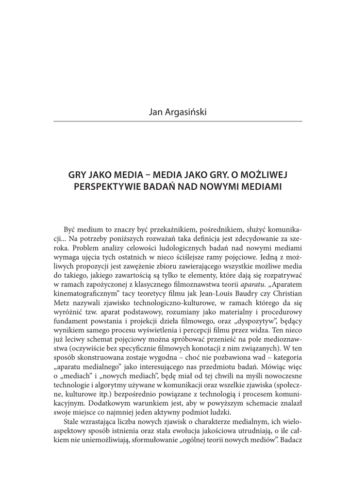 Jan Argasiński Gry jako media – media jako gry. O możliwej perspektywie badań nad nowymi mediami Być medium to znaczy być przekaźnikiem, pośrednikiem, służyć komunikacji... Na potrzeby poniższych rozważań taka definicja jest zdecydowanie za szeroka. Problem analizy celowości ludologicznych badań nad nowymi mediami wymaga ujęcia tych ostatnich w nieco ściślejsze ramy pojęciowe. Jedną z możliwych propozycji jest zawężenie zbioru zawierającego wszystkie możliwe media do takiego, jakiego zawartością są tylko te elementy, które dają się rozpatrywać w ramach zapożyczonej z klasycznego filmoznawstwa teorii aparatu. „Aparatem kinematograficznym” tacy teoretycy filmu jak Jean-Louis Baudry czy Christian Metz nazywali zjawisko technologiczno-kulturowe, w ramach którego da się wyróżnić tzw. aparat podstawowy, rozumiany jako materialny i procedurowy fundament powstania i projekcji dzieła filmowego, oraz „dyspozytyw”, będący wynikiem samego procesu wyświetlenia i percepcji filmu przez widza. Ten nieco już leciwy schemat pojęciowy można spróbować przenieść na pole medioznawstwa (oczywiście bez specyficznie filmowych konotacji z nim związanych). W ten sposób skonstruowana zostaje wygodna – choć nie pozbawiona wad – kategoria „aparatu medialnego” jako interesującego nas przedmiotu badań. Mówiąc więc o „mediach” i „nowych mediach”, będę miał od tej chwili na myśli nowoczesne technologie i algorytmy używane w komunikacji oraz wszelkie zjawiska (społeczne, kulturowe itp.) bezpośrednio powiązane z technologią i procesem komunikacyjnym. Dodatkowym warunkiem jest, aby w powyższym schemacie znalazł swoje miejsce co najmniej jeden aktywny podmiot ludzki. Stale wzrastająca liczba nowych zjawisk o charakterze medialnym, ich wieloaspektowy sposób istnienia oraz stała ewolucja jakościowa utrudniają, o ile całkiem nie uniemożliwiają, sformułowanie „ogólnej teorii nowych mediów”. Badacz