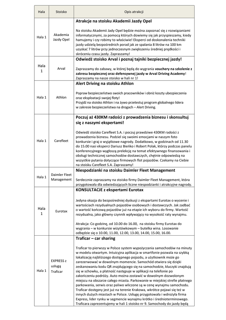 Hala Stoisko Opis atrakcji Atrakcje na stoisku Akademii Jazdy Opel Hala 1 Akademia Jazdy Opel Na stoisku Akademii Jady Opel będzie można zapoznać się z rozwiązaniami informatycznymi, za pomocą których dowiemy się jak przyspieszamy, kiedy hamujemy i czy robimy to właściwie! Eksperci od doskonalenia techniki jazdy udzielą bezpośrednich porad jak ze spalania 8 litrów na 100 km uzyskać 7 litrów przy jednoczesnym zwiększeniu średniej prędkości i skróceniu czasu jazdy. Zapraszamy! Odwiedź stoisko Arval i poznaj tajniki bezpiecznej jazdy! Hala 1 Arval Zapraszamy do zabawy, w której będą do wygrania vouchery na szkolenie z zakresu bezpiecznej oraz defensywnej jazdy w Arval Driving Academy! Zapraszamy na nasze stoisko w hali nr 1! Alert Driving na stoisku Athlon Hala 1 Athlon Popraw bezpieczeństwo swoich pracowników i obniż koszty ubezpieczenia oraz eksploatacji swojej floty! Przyjdź na stoisko Athlon i na żywo przetestuj program globalnego lidera w zakresie bezpieczeństwa na drogach – Alert Driving. Poczuj aż 430KM radości z prowadzenia biznesu i skonsultuj się z naszymi ekspertami! Hala 1 Carefleet Hala 1 Daimler Fleet Management Odwiedź stoisko Carefleet S.A. i poczuj prawdziwe 430KM radości z prowadzenia biznesu. Podziel się swoimi emocjami w naszym foto konkursie i graj o wyjątkowe nagrody. Dodatkowo, w godzinach od 11.30 do 15.00 nasi eksperci Dariusz Bieńko i Robert Polak, którzy podczas panelu konferencyjnego wygłoszą prelekcję na temat efektywnego finansowania i obsługi technicznej samochodów dostawczych, chętnie odpowiedzą na wszystkie pytania dotyczące firmowych flot pojazdów. Czekamy na Ciebie na stoisku Carefleet S.A. Zapraszamy! Niespodzianki na stoisku Daimler Fleet Management Serdecznie zapraszamy na stoisko firmy Daimler Fleet Management, która przygotowała dla odwiedzających liczne niespodzianki i atrakcyjne nagrody. KONSULTACJE z ekspertami Eurotax Hala 1 Eurotax Jedyna okazja do bezpośredniej dyskusji z ekspartami Eurotax o wycenie i wartościach rezydualnych pojazdów osobowych i dostawczych. Jak zadbać o wartość końcową pojazdów już na etapie ich wyboru do firmy. Wartość rezydualna, jako główny czynnik wpływający na wysokość raty wynajmu. Atrakcja: Co godzinę, od 10.00 do 16.00, na stoisku firmy Eurotax do wygrania – w konkursie wizytówkowym – butelka wina. Losowanie odbędzie się o 10.00, 11.00, 12.00, 13.00, 14.00, 15.00, 16.00. Traficar – car sharing Hala 1 EXPRESS z usługą Traficar Traficar to pierwszy w Polsce system wypożyczania samochodów na minuty w modelu otwartym. Intuicyjna aplikacja w smartfonie pozwala na szybką lokalizację najbliższego dostępnego pojazdu, a użytkownik może go zarezerwować w dowolnym momencie. Samochód otwiera się dzięki zeskanowaniu kodu QR znajdującego się na samochodzie, kluczyki znajdują się w schowku, a płatność następuje w aplikacji na telefonie po zakończeniu podróży. Auto można zostawić w dowolnym dozwolonym miejscu na obszarze całego miasta. Parkowanie w miejskiej strefie płatnego parkowania, serwis oraz paliwo wliczone są w cenę wynajmu samochodu. Traficar dostępny jest już na terenie Krakowa, wkrótce pojawi się też w innych dużych miastach w Polsce. Usługę przygotowała i wdrożyła firma Express, lider rynku w segmencie wynajmu krótko i średnioterminowego. Traficara zaprezentujemy w hali 1 stoisko nr 9. Samochody do jazdy będą także dostępne na parkingu przed wejściem głównym na targi. Dla uczestników targów Fleet Market przygotowaliśmy grę „Złap Traficara” w hali 1 stoisko 9/EXPRESS. Do wygrania markowe gadżety. Rozstrzygnięcie konkursu Traficar „Złap auto na minuty” odbędzie się na stosiku nr 9 w hali 1 w godzinach trwania targów. ZAPRASZAMY! Premiera linii samochodów ST-Line Hala 1 Ford ST-Line – Ford wprowadził do sprzedaży nową rodzinę modeli STLine inspirowaną samochodami sportowymi z pod znaku Ford Performance. Jej członkami stały się Fiesta ST-Line, Focus ST-Line, Mondeo ST-Line, Kuga ST-Line. Poczuj potężny zastrzyk energii i adrenaliny z edycją ST-Line – kwintesencją niedoścignionych wrażeń oraz sportowego designu w nowych modelach Forda. Sportowa stylizacja nadwozia, przednie światła przeciwmgielne, obręcze kół o unikatowej stylistyce Rock Metallic oraz wyjątkowy emblemat. Elementy wersji ST-Line podkreślają charakter Twojego Forda, nadając mu wyrazistości. Atrakcje na stoisku Peugeot Citroën DS Hala 3 Grupa PSA Peugeot Citroën DS Strefa Customer Experience : Przyjdź i doświadcz nowego SUV Peugeot 3008 za pośrednictwem Wirtualnej Rzeczywistości, która wpisuje się w naszą globalną koncepcję Peugeot Amplified Experience. Dzięki zainstalowanej fabrycznie aplikacji na smartphone Samsung Galaxy S6 oraz zestawie słuchawkowym Samsung Gear VR klienci mogą cieszyć się 8-oma różnymi doświadczeniami: i – Cockpit 5 ADAS 3D connected nav MyPeugeot app Strefa samochodów użytkowych – będziemy serwować burgery od godziny. 10.00 Atrakcyjny pakiet Hyundaia dla Klientów biznesowych Hyundai wprowadził do swojej oferty kompleksowy pakiet atrakcyjnych rozwiązań dla biznesu Hyundai for Business. Hale 1 i3 Hyundai Aktywne wspieranie przez markę sektora flotowego to wynik stale umacniającego się rynku klientów instytucjonalnych, który stanowi obecnie ponad 70% sprzedaży wszystkich nowych samochodów w Polsce. Hyundai for Business to pakiet łatwych i przyjaznych rozwiązań, składający się z 5 głównych narzędzi: Rabat dla Biznesu – aktualna polityka flotowa, wspierająca przedsiębiorców i grupy zawodowe Ubezpieczenie w wysokości 2,99% wartości samochodu, dostępne również dla Klientów instytucjonalnych Innowacyjne finansowanie: leasing Hyundai Finance Hyundai Abonament wynajem Hyundai Fleet Lease program serwisowy Hyundai Business Care 5 lat gwarancji bez limitu kilometrów Programem zostały objęte wszystkie osobowe modele