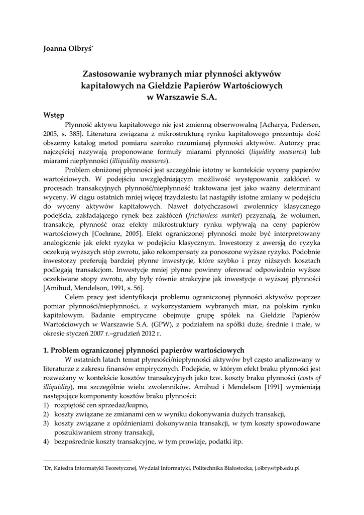 Joanna Olbryś* Zastosowanie wybranych miar płynności aktywów kapitałowych na Giełdzie Papierów Wartościowych w Warszawie S.A. Wstęp Płynność aktywu kapitałowego nie jest zmienną obserwowalną [Acharya, Pedersen, 2005, s. 385]. Literatura związana z mikrostrukturą rynku kapitałowego prezentuje dość obszerny katalog metod pomiaru szeroko rozumianej płynności aktywów. Autorzy prac najczęściej nazywają proponowane formuły miarami płynności (liquidity measures) lub miarami niepłynności (illiquidity measures). Problem obniżonej płynności jest szczególnie istotny w kontekście wyceny papierów wartościowych. W podejściu uwzględniającym możliwość występowania zakłóceń w procesach transakcyjnych płynność/niepłynność traktowana jest jako ważny determinant wyceny. W ciągu ostatnich mniej więcej trzydziestu lat nastąpiły istotne zmiany w podejściu do wyceny aktywów kapitałowych. Nawet dotychczasowi zwolennicy klasycznego podejścia, zakładającego rynek bez zakłóceń (frictionless market) przyznają, że wolumen, transakcje, płynność oraz efekty mikrostruktury rynku wpływają na ceny papierów wartościowych [Cochrane, 2005]. Efekt ograniczonej płynności może być interpretowany analogicznie jak efekt ryzyka w podejściu klasycznym. Inwestorzy z awersją do ryzyka oczekują wyższych stóp zwrotu, jako rekompensaty za ponoszone wyższe ryzyko. Podobnie inwestorzy preferują bardziej płynne inwestycje, które szybko i przy niższych kosztach podlegają transakcjom. Inwestycje mniej płynne powinny oferować odpowiednio wyższe oczekiwane stopy zwrotu, aby były równie atrakcyjne jak inwestycje o wyższej płynności [Amihud, Mendelson, 1991, s. 56]. Celem pracy jest identyfikacja problemu ograniczonej płynności aktywów poprzez pomiar płynności/niepłynności, z wykorzystaniem wybranych miar, na polskim rynku kapitałowym. Badanie empiryczne obejmuje grupę spółek na Giełdzie Papierów Wartościowych w Warszawie S.A. (GPW), z podziałem na spółki duże, średnie i małe, w okresie styczeń 2007 r.–grudzień 2012 r. 1. Problem ograniczonej płynności papierów wartościowych W ostatnich latach temat płynności/niepłynności aktywów był często analizowany w literaturze z zakresu finansów empirycznych. Podejście, w którym efekt braku płynności jest rozważany w kontekście kosztów transakcyjnych jako tzw. koszty braku płynności (costs of illiquidity), ma szczególnie wielu zwolenników. Amihud i Mendelson [1991] wymieniają następujące komponenty kosztów braku płynności: 1) rozpiętość cen sprzedaż/kupno, 2) koszty związane ze zmianami cen w wyniku dokonywania dużych transakcji, 3) koszty związane z opóźnieniami dokonywania transakcji, w tym koszty spowodowane poszukiwaniem strony transakcji, 4) bezpośrednie koszty transakcyjne, w tym prowizje, podatki itp. * Dr, Katedra Informatyki Teoretycznej, Wydział Informatyki, Politechnika Białostocka, [email protected] W znacznie nowszej pracy z 2005 r. znajdujemy, że do źródeł ograniczonej (obniżonej) płynności aktywów kapitałowych można zaliczyć [Amihud i inni, 2005]: egzogeniczne koszty transakcyjne, presję popytu i ryzyko zapasów, asymetrię informacyjną, spowodowaną obecnością na rynku lepiej poinformowanych inwestorów, trudności w znalezieniu drugiej strony transakcji. Prowadzone na świecie intensywne badania dotyczące wymienionych źródeł ograniczonej płynności aktywów zaowocowały powstaniem wielu modeli teoretycznych oraz analiz empirycznych, których przegląd można znaleźć np. w pozycji [Doman, 2011]. 2. Płynność aktywów a struktura i organizacja rynku Rynki finansowe (w tym rynki kapitałowe) pełnią dwie najważniejsze funkcje: zapewnienie płynności aktywów oraz odkrywanie cen instrumentów finansowych [O’Hara, 2003]. Struktura rynku i organizacja handlu mają kluczowe znaczenie jako czynniki generujące ewentualne zakłócenia w procesach transakcyjnych, poprzez ograniczenie (obniżenie) szeroko rozumianej płynności aktywów1. Szczególnie ważnym elementem jest organizacja handlu na danym rynku, która ma wpływ na cały proces transakcyjny. Ze względu na podstawowe procedury organizacyjne rynki dzielimy na: 1) kierowane zleceniami (order-driven markets), 2) kierowane cenami (quote-driven markets), 3) hybrydowe, łączące w różnych proporcjach cechy rynków kierowanych zleceniami i cenami. Na rynku kierowanym zleceniami nie występują typowi pośrednicy (kreatorzy rynku), a jedynie maklerzy (animatorzy rynku), którzy przekazują zlecenia klientów, i których zadaniem jest poprawienie płynności rynku. Rynek kierowany zleceniami uważany jest zatem za rynek bardziej transparentny w porównaniu z rynkiem kierowanym cenami. Na rynku kierowanym cenami działania i interwencje pośredników (kreatorów) mogą mieć decydujący wpływ na płynność pojedynczych instrumentów oraz płynność całego rynku. Zarówno animatorzy (na rynku kierowanym zleceniami), jak też kreatorzy (na rynku kierowanym cenami) określani są jako tzw. dostarczyciele płynności (liquidity suppliers) [Doman, 2011]. Z racji wykonywanych czynności kreatorzy i animatorzy rynku mają największe możliwości wykorzystywania przewagi informacyjnej w stosunku do pozostałych uczestników rynku. Szczególnie ważne jest stwierdzenie, czy kreatorów i animatorów rynku można zaliczyć do grupy inwestorów lepiej poinformowanych, ponieważ asymetria informacyjna uważana jest za jedną z głównych przyczyn podwyższania kosztów płynności, np. [O’Hara, 2003]. Generalnie większość autorów akceptuje taką przynależność, chociaż nie ma jednomyślności w tym zakresie. Najczęściej wyróżnia się w literaturze trzy grupy uczestników rynku: 1) inwestorów z dostępem do niepublicznej informacji (informed traders), 2) inwestorów nieposiadających dostępu do niepublicznej informacji (uninformed traders), 3) krea
