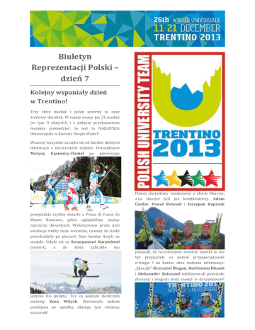 Biuletyn Reprezentacji Polski – dzień 7 Kolejny wspaniały dzień w Trentino! Trzy złote medale i jeden srebrny to nasz środowy dorobek. W sumie mamy już 21 medali (w tym 9 złotych!) i z pełnym przekonaniem możemy powiedzieć, że jest to NAJLEPSZA Uniwersjada w historii. Dzięki Wam!!! Wczoraj wszystko zaczęło się od bardzo dobrych informacji z narciarskich stoków. Prowadzenie Maryny Gąsienicy-Daniel po pierwszym Potem dostaliśmy wiadomość o złocie Maryny, a na skoczni byli już kombinatorzy. Adam Cieślar, Paweł Słowiok i Szczepan Kupczak przejeździe szybko dotarło z Pozza di Fassa do Monte Bondone, gdzie oglądaliśmy popisy narciarzy dowolnych. Wykonywane przez nich ewolucje robiły duże wrażenie, czasem aż ciarki przechodziły po plecach! Nasi bardzo liczyli na medale. Udało się to Szczepanowi Karpielowi (srebro), a do złota zabrakło mu jedynie 0,6 punktu. Tuż za podium skończyła niestety Zuza Witych. Startowała jednak poobijana po upadku, dlatego tym większy szacunek! pokazali, że wcześniejsze świetne wyniki to nie był przypadek, co potem przypieczętowali w biegu. I na koniec dnia radosna informacja: „Skoczki” Krzysztof Biegun, Bartłomiej Kłusek i Aleksander Zniszczoł zdeklasowali pozostałe drużyny i wygrali złoty medal w drużynówce!! Zdjęcia dnia Tworzymy historię!! Maryna Gąsienica-Daniel mknie do mety! Rozpoczęła się zdominowana przez Azjatów rywalizacja w short tracku. Dotychczas najlepszym wynikiem z zimowych Uniwersjad był rezultat z Zakopanego 2001, gdzie zdobyliśmy 14 medali w tym 8 złotych. Najmocniejszymi punktami ekipy byli wtedy: Tomasz Sikora (3 złote medale w biathlonie) i Łukasz Kruczek (2 złote medale indywidualnie w skokach). Media piszą Kombinatorzy w miłym towarzystwie Maryny i włoskich dzieci Co prawda nie tyle ile powinny, ale relacje regularnie pojawiają się na największych serwisach informacyjnych w Polsce Śnieżynka nauczona! Redakcja Pani Śnieżynka czytająca wyniki podczas ceremonii medalowych w Predazzo została przez Konrada Wełpę i Dariusza Mazura (AZS UJ) nauczona polskiej wymowy słów „złoty medal”. Czy odważy się złamać protokół już jutro? Parę szans pewnie będzie jeszcze miała Łukasz Turlej Michał Filarski [email protected] www.facebook.com/Trentino2013