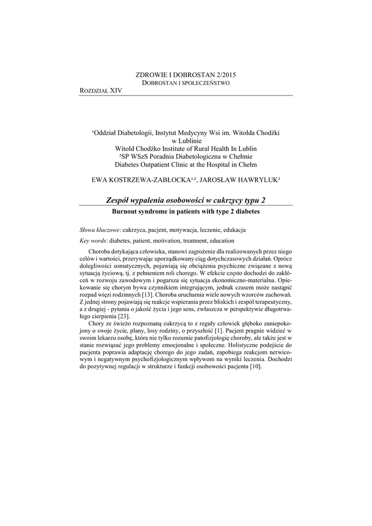 ZDROWIE I DOBROSTAN 2/2015 DOBROSTAN I SPOŁECZEŃSTWO ROZDZIAŁ XIV ¹Oddział Diabetologii, Instytut Medycyny Wsi im. Witolda Chodźki w Lublinie Witold Chodźko Institute of Rural Health In Lublin ²SP WSzS Poradnia Diabetologiczna w Chełmie Diabetes Outpatient Clinic at the Hospital in Chełm EWA KOSTRZEWA-ZABŁOCKA¹,², JAROSŁAW HAWRYLUK² Zespół wypalenia osobowości w cukrzycy typu 2 Burnout syndrome in patients with type 2 diabetes Słowa kluczowe: cukrzyca, pacjent, motywacja, leczenie, edukacja Key words: diabetes, patient, motivation, treatment, education Choroba dotykająca człowieka, stanowi zagrożenie dla realizowanych przez niego celów i wartości, przerywając uporządkowany ciąg dotychczasowych działań. Oprócz dolegliwości somatycznych, pojawiają się obciążenia psychiczne związane z nową sytuacją życiową, tj. z pełnieniem roli chorego. W efekcie często dochodzi do zakłóceń w rozwoju zawodowym i pogarsza się sytuacja ekonomiczno-materialna. Opiekowanie się chorym bywa czynnikiem integrującym, jednak czasem może nastąpić rozpad więzi rodzinnych [13]. Choroba uruchamia wiele nowych wzorców zachowań. Z jednej strony pojawiają się reakcje wspierania przez bliskich i zespół terapeutyczny, a z drugiej - pytania o jakość życia i jego sens, zwłaszcza w perspektywie długotrwałego cierpienia [23]. Chory ze świeżo rozpoznaną cukrzycą to z reguły człowiek głęboko zaniepokojony o swoje życie, plany, losy rodziny, o przyszłość [1]. Pacjent pragnie widzieć w swoim lekarzu osobę, która nie tylko rozumie patofizjologię choroby, ale także jest w stanie rozwiązać jego problemy emocjonalne i społeczne. Holistyczne podejście do pacjenta poprawia adaptację chorego do jego zadań, zapobiega reakcjom nerwicowym i negatywnym psychofizjologicznym wpływom na wyniki leczenia. Dochodzi do pozytywnej regulacji w strukturze i funkcji osobowości pacjenta [10]. ZDROWIE I DOBROSTAN 2/2015 Dobrostan i społeczeństwo U chorych na cukrzycę obserwuje się niski stopień wypełniania zaleceń lekarskich, co pogarsza wyniki leczenia i zwiększa ryzyko szybkiego wystąpienia powikłań. Wśród pacjentów z cukrzycą obserwuje się większą niż w populacji ogólnej częstość objawów lękowych i depresyjnych [4]. Termin „zespół wypalenia osobowości” (ZWO) powstał pierwotnie dla określenia sytuacji dotyczącej pracy zawodowej i postawy życiowej pracoholików. Oznacza sytuację, kiedy człowiek bardzo zaangażowany w proces kariery i pracy podejmuje coraz więcej zadań, pracując ponad siły. Z tego powodu pogarsza się jego sprawność umysłowa, popełnia błędy, a w efekcie nie odczuwa zadowolenia z pracy i ze swojej życiowej sytuacji. Reaguje zobojętnieniem, przestaje odczuwać radość, traci kontakt z rodziną i przyjaciółmi, mogą pojawić się uzależnienia. Nie umie przeorganizować swojego planu życiowego, popada w psychoemocjonalne i intelektualne odrętwienie, depresję - w zespół wypalenia osobowości [21]. Według badań, ZWO może dotyczyć 10-30% osób z cukrzycą. Mają oni z reguły znacznie podwyższony poziom glikowanej hemoglobiny (HbA1c). Często są to młodzi ludzie, ale może występować w każdym wieku [15]. ZWO niekiedy przyjmuje postać reakcji konwersyjnej - pacjent ucieka od problemu cukrzycy, zajmując się zastępczymi sprawami, stosując nieracjonalne metody terapeutyczne, mogą pojawić się objawy anoreksji lub bulimii [18]. Na powstanie ZWO mogą składać się różne przyczyny zewnętrzne, między innymi brak sprawnej i budzącej zaufanie opieki lekarsko-pielęgniarskiej. Sytuacje te sprzyjają powstaniu powikłań cukrzycy [19]. Można sądzić, że ZWO jest jednym z ważnych powodów upośledzenia jakości życia [24]. W badaniach jakości życia pacjenci często bardziej doceniają wygodę i liberalizację terapii, jak np. zastosowanie wstrzykiwaczy, pomp insulinowych i ułatwień w samokontroli, aniżeli propozycje wprowadzające ograniczenia dietetyczne czy modyfikujące styl życia [14]. Często oczekuje się, że pacjent w wyniku edukacji stanie się idealny. Dzięki działaniom edukacyjnym, pacjent ma możliwość opanowania potrzebnych umiejętności, jednak to, czy będzie je stosował w codziennym życiu, zależy tylko od niego samego [2]. W procesie edukacji napotyka się na różne trudności. Podobnie jak w całym społeczeństwie, także wśród chorych na cukrzycę spotkać można osoby o bardzo niskim poziomie inteligencji, samotne, porzucone, bez wsparcia rodzinnego. Wszystkie te stany powodują, że sylwetka idealnego i autonomicznego pacjenta staje się iluzoryczna, a na to miejsce pojawia się problem braku współpracy, chwiejnego przebiegu cukrzycy i szybkiego rozwoju powikłań [3]. W efekcie pojawiają się coraz gorsze wyniki leczenia. Pacjent często nie reaguje na proponowane modyfikacje leczenia mimo współpracy z zaufanym lekarzem [12]. W opisywanych sytuacjach, często rozpoznać można ZWO. Oceniając poczucie jakości życia pacjentów, lekarz zyskuje możliwość wyboru zakresu edukacji terapeutycznej, a także metod leczenia i zaleceń farmakoterapeutycznych [20]. 208 Ewa Kostrzewa-Zabłocka, Jarosław Hawryluk Zespół wypalenia osobowości w cukrzycy typu 2 Pamiętając o możliwości powstania ZWO u pacjentów chorych na cukrzycę, dzięki właściwej reakcji na pierwsze objawy zespół terapeutyczny może uniknąć jednego z ważnych powodów pogorszenia wyników opieki diabetologicznej i upośledzenia jakości życia [16]. Celem podjętych badań było dokonanie oceny poziomu „wypalenia osobowości”, wśród osób zgłaszających się po raz pierwszy do Poradni Diabetologicznej w Chełmie, a wcześniej leczonych przez lekarza rodzinnego. MATERIAŁ I METODY Metodą, która posłużyła do przeprowadzenia badań własnych, była metoda sondażu diagnostycznego. Jej zaletą jest anonimowość, co pozwala na wyrażenie przez ankietowanych wł