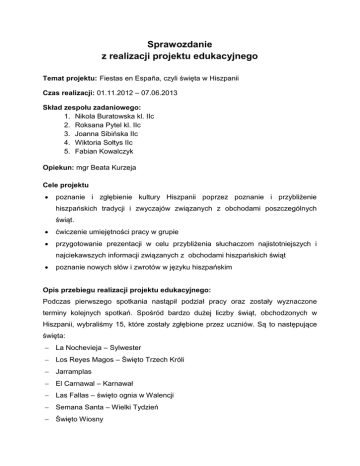 Sprawozdanie z realizacji projektu edukacyjnego Temat projektu: Fiestas en España, czyli święta w Hiszpanii Czas realizacji: 01.11.2012 – 07.06.2013 Skład zespołu zadaniowego: 1. Nikola Buratowska kl. IIc 2. Roksana Pytel kl. IIc 3. Joanna Sibińska IIc 4. Wiktoria Sołtys IIc 5. Fabian Kowalczyk Opiekun: mgr Beata Kurzeja Cele projektu poznanie i zgłębienie kultury Hiszpanii poprzez poznanie i przybliżenie hiszpańskich tradycji i zwyczajów związanych z obchodami poszczególnych świąt. ćwiczenie umiejętności pracy w grupie przygotowanie prezentacji w celu przybliżenia słuchaczom najistotniejszych i najciekawszych informacji związanych z obchodami hiszpańskich świąt poznanie nowych słów i zwrotów w języku hiszpańskim Opis przebiegu realizacji projektu edukacyjnego: Podczas pierwszego spotkania nastąpił podział pracy oraz zostały wyznaczone terminy kolejnych spotkań. Spośród bardzo dużej liczby świąt, obchodzonych w Hiszpanii, wybraliśmy 15, które zostały zgłębione przez uczniów. Są to następujące święta: La Nochevieja – Sylwester Los Reyes Magos – Święto Trzech Króli Jarramplas El Carnawal – Karnawał Las Fallas – święto ognia w Walencji Semana Santa – Wielki Tydzień Święto Wiosny Festiwal Patios San Fermin – Gonitwy byków Corrida La Tomatina – święto „pomidorów” Święto winobrania Fiestas de Pilar La Navidad – Boże Narodzenie Corrida i San Fermín Każdy z uczniów wybrał jedno z zagadnień i przyswoił sobie związane z nim informacje. W ramach comiesięcznych spotkań uczniowie prezentowali swoje dokonania, nanosili poprawki oraz przygotowywali się do zaprezentowania swojego projektu podczas szkolnego festiwalu projektów. Uczniowie przygotowali również prezentację multimedialną w celu zobrazowania świąt i tradycji hiszpańskich. W dniu 7 czerwca 2013 odbył się Szkolny Festiwal Projektów, podczas którego uczniowie zaprezentowali oraz przybliżyli słuchaczom klas I i II gimnazjum swoje dokonania charakteryzując pokrótce każde z wcześniej przygotowanych świąt. Refleksje po zrealizowaniu projektu W ramach realizacji projektu gimnazjalnego na temat hiszpańskich tradycji i zwyczajów uczniowie mieli możliwość głębiej poznać i zrozumieć kulturę hiszpańską. Są to pomocne informacje w nauce języka hiszpańskiego, na które na lekcji języka obcego rzadko starcza czasu. Ponadto, uczniowie prezentując swój projekt przed szerszym gronem odbiorców mieli możliwość sprawdzenia swoich umiejętności w publicznym wystąpieniu. Trudności, które napotkaliśmy w tym czasie to głównie ograniczona możliwość spotkań w całej grupie. Uczniowie są z dwóch różnych klas i często kończyli lekcje o różnych porach, tak więc spotkania odbywały się o godzinie 15.10, co z kolei były niedogodne dla uczniów dojeżdżających, a także wpływało na obniżoną jakość pracy, jako że uczniowie byli o tej porze zmęczeni. Uczennice Nikola Buratowska i Roksana Pytel bardzo dobrze wywiązały się z poszczególnych zadań, wykazały się także inicjatywą i samodzielnością w trakcie trwania projektu.