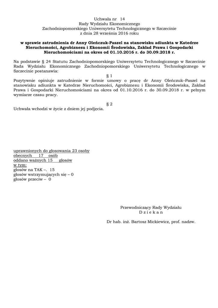 Uchwała nr 14 Rady Wydziału Ekonomicznego Zachodniopomorskiego Uniwersytetu Technologicznego w Szczecinie z dnia 28 września 2016 roku w sprawie zatrudnienia dr Anny Oleńczuk-Paszel na stanowisku adiunkta w Katedrze Nieruchomości, Agrobiznesu i Ekonomii Środowiska, Zakład Prawa i Gospodarki Nieruchomościami na okres od 01.10.2016 r. do 30.09.2018 r. Na podstawie § 24 Statutu Zachodniopomorskiego Uniwersytetu Technologicznego w Szczecinie Rada Wydziału Ekonomicznego Zachodniopomorskiego Uniwersytetu Technologicznego w Szczecinie postanawia: §1 Pozytywnie opiniuje zatrudnienie w formie umowy o pracę dr Anny Oleńczuk–Paszel na stanowisku adiunkta w Katedrze Nieruchomości, Agrobiznesu i Ekonomii Środowiska, Zakład Prawa i Gospodarki Nieruchomościami na okres od 01.10.2016 r. do 30.09.2018 r. w pełnym wymiarze czasu pracy. §2 Uchwała wchodzi w życie z dniem jej podjęcia. uprawnionych do głosowania 23 osoby obecnych 17 osób oddano ważnych 15 głosów w tym: głosów na TAK –. 15 głosów wstrzymujących się – 0 głosów przeciw – 0 Przewodniczący Rady Wydziału Dziekan Dr hab. inż. Bartosz Mickiewicz, prof. nadzw. Uchwała nr 15 Rady Wydziału Ekonomicznego Zachodniopomorskiego Uniwersytetu Technologicznego w Szczecinie z dnia 28 września 2016 roku w sprawie wyznaczenia recenzentów rozprawy doktorskiej mgr Anny Landowskiej Na podstawie art. 14 ust. 2 p. 2 Ustawy z dnia 14 marca 2003 roku o stopniach naukowych i tytule naukowym oraz o stopniach i tytule w zakresie sztuki (Dz. U. z 2003 r., Nr 65, poz. 595 z póź. zm.) Rada Wydziału Ekonomicznego Zachodniopomorskiego Uniwersytetu Technologicznego w Szczecinie uchwala co następuje: §1 Na recenzentów rozprawy doktorskie mgr Anny Landowskiej nt.: „Metody optymalizacji dynamicznej w ustalaniu struktury produkcji gospodarstw rolnych”, wyznacza: Prof. dr hab. Karola Kukułę – Uniwersytet Rolniczy im. Hugona Kołłątaja w Krakowie, Wydział Rolniczo- Ekonomiczny - dyscyplina – ekonomia, - specjalność– badania operacyjne, ekonometria, ekonomika rolnictwa, statystyka, prognozowanie i symulacje Prof. dr hab. Ludosław Drelichowski – Wyższa Szkoła Gospodarki w Bydgoszczy - dyscyplina – ekonomia, - specjalność -metody matematyczne i informatyczne w rolnictwie dr hab. Iwona Bąk – ZUT w Szczecinie, Wydział Ekonomiczny - dyscyplina – ekonomia, -specjalność -ekonometria, statystyka, turystyka, aktywność turystyczna w grupach wieku, analizy wielowymiarowe Uchwała wchodzi w życie z dniem jej podjęcia §2 Przewodniczący Rady Wydziału Dziekan Dr hab. inż. Bartosz Mickiewicz, prof. nadzw. Uchwała nr 16 Rady Wydziału Ekonomicznego Zachodniopomorskiego Uniwersytetu Technologicznego w Szczecinie z dnia 28 września 2016 roku w sprawie wszczęcia przewodu doktorskiegomgr Lesławowi Rządzińskiemu nt.„Efektywność techniczna szkolnictwa wyższego w Polsce” w obszarze nauk społecznych dziedzinie nauk ekonomicznych, dyscyplina ekonomia oraz wyznaczenie prof. dr hab. Michała Świtłyka na promotora tej rozprawy Na podstawie art. 14 ust. 2 p. 1 ustawy z dnia 14 marca 2003 roku o stopniach naukowych i tytule naukowym oraz o stopniach i tytule w zakresie sztuki (Dz. U. nr 65, poz. 595 z póź. zm.) Rada Wydziału Ekonomicznego Zachodniopomorskiego Uniwersytetu Technologicznego w Szczecinie uchwala co następuje: §1 Wszczyna przewód doktorski mgr Lesławowi Rządzińskiemu nt. „Efektywność techniczna szkolnictwa wyższego w Polsce” w obszarze nauk społecznych dziedzinie nauk ekonomicznych, dyscyplina ekonomia oraz wyznaczenie prof. dr hab. Michała Świtłyka na promotora tej rozprawy . Uchwała wchodzi w życie z dniem podjęcia §2 Przewodniczący Rady Wydziału Dziekan Dr hab. inż. Bartosz Mickiewicz, prof. nadzw. Uchwała nr 17 Rady Wydziału Ekonomicznego Zachodniopomorskiego Uniwersytetu Technologicznego w Szczecinie z dnia 28 września 2016 roku w sprawie powołania dr Bożeny Nadolnej na kierowników w Katedrze Ekonomii Menedżerskiej i Rachunkowości Na podstawie § 27 Statutu Zachodniopomorskiego Uniwersytetu Technologicznego w Szczecinie Rada Wydziału Ekonomicznego Zachodniopomorskiego Uniwersytetu Technologicznego w Szczecinie postanawia: §1 Pozytywnie opiniuje powołanie dr Bożeny Nadolnej na kierowników w Katedrze Ekonomii Menedżerskiej i Rachunkowości §2 Uchwała wchodzi w życie z dniem jej podjęcia. uprawnionych do głosowania 23 osób obecnych 17 osób oddano ważnych 17 głosów w tym: głosów na TAK –. 10 głosów wstrzymujących się – 1 głosów przeciw – 6 Przewodniczący Rady Wydziału Dziekan Dr hab. inż. Bartosz Mickiewicz, prof. nadzw. Uchwała nr 18 Rady Wydziału Ekonomicznego Zachodniopomorskiego Uniwersytetu Technologicznego w Szczecinie z dnia 28 września 2016 roku w sprawie opieki nad studentem przygotowującym pracę dyplomową na Wydziale Ekonomicznym Zachodniopomorskiego Uniwersytetu Technologicznego w Szczecinie od roku akademickiego 2016/2017 Na podstawie § 6 pkt. 1 Uchwały nr 47 Senatu Zachodniopomorskiego Uniwersytetu Technologicznego w Szczecinie z dnia 25 maja 2009 r. (z póź. zm.) Rada Wydziału Ekonomicznego ZUT w Szczecinie postanawia: §1 Z tytułu opieki nad studentami przygotowującymi pracę dyplomową, w tym również prowadzenie konsultacji, po uzyskaniu pozytywnej recenzji pracy, zaliczyć nauczycielowi akademickiemu 2 godziny dydaktyczne za każdego wypromowanego dyplomanta studiów stacjonarnych i niestacjonarnych I stopnia od roku akademickiego 2016/2017.. §2 Z tytułu opieki nad studentem przygotowującym pracę, w tym również prowadzenia konsultacji, po uzyskaniu pozytywnych recenzji pracy, zalicza nauczycielowi akademickiemu4 godziny dydaktyczne za każdego wypromowanego dyplomanta studiów stacjonarnych i niestacjonarnych II stopnia od roku akademickiego 2016/2017.. §3 Uchwała wchodzi w życie z dniem podjęcia. uprawnionych do głosowania 23 osób obecnych 17 osób oddano ważnych 17 głosów w 