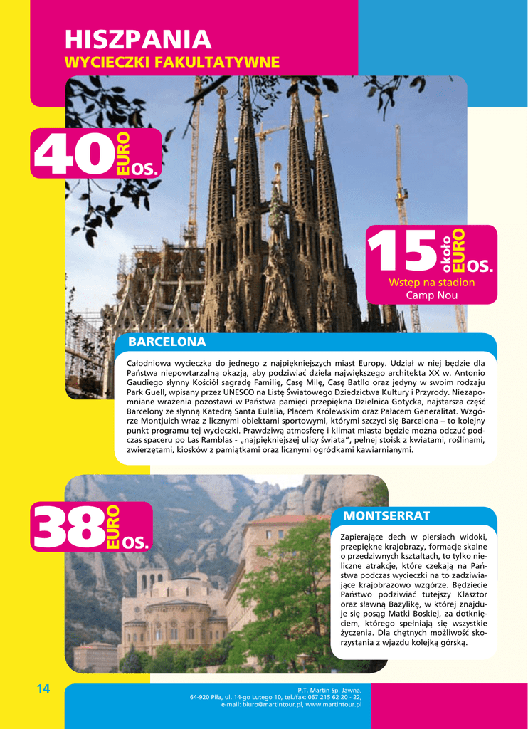 HISZPANIA WYCIECZKI FAKULTATYWNE EURO 40 około 15 EURO OS. OS. Wstęp na stadion Camp Nou BARCELONA Całodniowa wycieczka do jednego z najpiękniejszych miast Europy. Udział w niej będzie dla Państwa niepowtarzalną okazją, aby podziwiać dzieła największego architekta XX w. Antonio Gaudiego słynny Kościół sagradę Familię, Casę Milę, Casę Batllo oraz jedyny w swoim rodzaju Park Guell, wpisany przez UNESCO na Listę Światowego Dziedzictwa Kultury i Przyrody. Niezapomniane wrażenia pozostawi w Państwa pamięci przepiękna Dzielnica Gotycka, najstarsza część Barcelony ze słynną Katedrą Santa Eulalia, Placem Królewskim oraz Pałacem Generalitat. Wzgórze Montjuich wraz z licznymi obiektami sportowymi, którymi szczyci się Barcelona – to kolejny punkt programu tej wycieczki. Prawdziwą atmosferę i klimat miasta będzie można odczuć podczas spaceru po Las Ramblas - „najpiękniejszej ulicy świata”, pełnej stoisk z kwiatami, roślinami, zwierzętami, kiosków z pamiątkami oraz licznymi ogródkami kawiarnianymi. EURO 38 14 OS. MONTSERRAT Zapierające dech w piersiach widoki, przepiękne krajobrazy, formacje skalne o przedziwnych kształtach, to tylko nieliczne atrakcje, które czekają na Państwa podczas wycieczki na to zadziwiające krajobrazowo wzgórze. Będziecie Państwo podziwiać tutejszy Klasztor oraz sławną Bazylikę, w której znajduje się posąg Matki Boskiej, za dotknięciem, którego spełniają się wszystkie życzenia. Dla chętnych możliwość skorzystania z wjazdu kolejką górską. P.T. Martin Sp. Jawna, 64-920 Piła, ul. 14-go Lutego 10, tel./fax: 067 215 62 20 - 22, e-mail: [email protected], www.martintour.pl EURO 30 HISZPANIA OS. WYCIECZKI FAKULTATYWNE COSTA BRAVA Wycieczka objazdowa po najpiękniejszych miejscowościach i zakątkach Dzikiego Wybrzeża. Państwa oczom ukazywać będą się malownicze zatoczki, skały o dziwacznych kształtach, lazurowe morze. Bujną, egzotyczną przyrodę hiszpańską podziwiać będziecie w jednym z najatrakcyjniejszych ogrodów botanicznych w tym regionie. Ukoronowaniem tych, wspaniałych, duchowych przeżyć będzie degustacja wyśmienitych win i likierów w hiszpańskiej winiarni, gdzie będziecie Państwo mogli poznać walory smakowe tych doskonałych trunków. Zapraszamy Państwa na występy najznakomitszych artystów sceny hiszpańskiej: pokazy słynnego tańca flamenco, hiszpańska muzyka gitarowa, występ światowej sławy tenora hiszpańskiego. Ciepła i rodzinna atmosfera, którą udaje się stworzyć artystom hiszpańskim sprawi, iż będziecie Państwo bawić się doskonale w rytm gorącej muzyki i przy poczęstunku wspaniałym hiszpańskim winem. 32 EURO NOC HISZPAŃSKA OS. Rupit i Besalu OS. Całodniowa wycieczka, do wnętrza Katalonii. Przez malownicze miasteczka, z których największą wartość historyczną stanowi Rupit oraz Besalu. Rupit znany jest z urokliwych uliczek, zabudowanych domami z kamienia, pochodzącymi z 16 i 17 wieku. Mieszkańcy miasta słyną też z ciekawych dekoracji balkonów. Kwiatowe kompozycje, wyróżniane co roku przez specjalną komisję z Barcelony, jeszcze bardziej uprzyjemniają spacery po starówce. Największą atrakcją miasta jest zamek położony na skałach. Kościół św. Michała, Pałac Notariuszy z okazałym ogrodem oraz Kaplica św. Magdaleny z 17 wieku. PAKIET IMPREZ: BARCELONA+MONTSERRAT+COSTA BRAVA 88 EURO 35 EURO Średniowieczna wizytówka Katalonii OS. Dzieci: do 10 lat – GRATIS (z wyłączeniem Flamenco płatne jak osoba dorosła). 11-17 LAT – 50% CENY (z wyłączeniem Flamenco płatne jak osoba dorosła). PAKIET NIE OBEJMUJE NOCY HISZPAŃSKIEJ, Rupit i Besalu - Średniowieczna wizytówka Katalonii. Realizacja wycieczek przy wymaganej ilości uczestników! P.T. Martin Sp. Jawna, 64-920 Piła, ul. 14-go Lutego 10, tel./fax: 067 215 62 20 - 22, e-mail: [email protected], www.martintour.pl 15