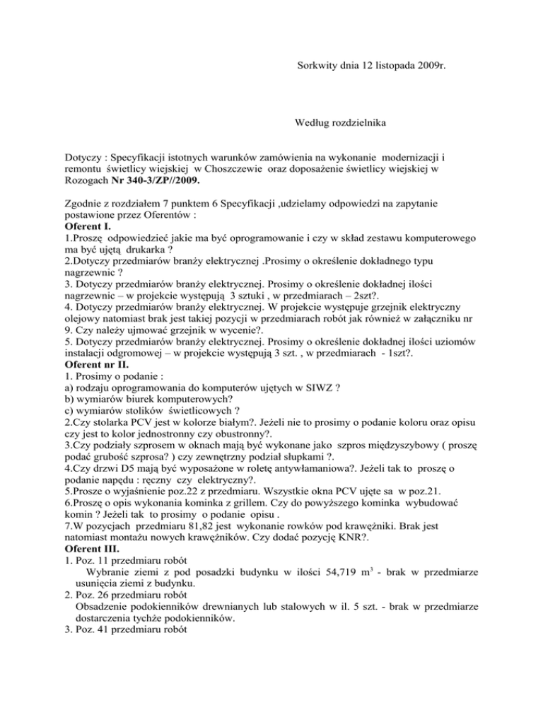 Sorkwity dnia 12 listopada 2009r. Według rozdzielnika Dotyczy : Specyfikacji istotnych warunków zamówienia na wykonanie modernizacji i remontu świetlicy wiejskiej w Choszczewie oraz doposażenie świetlicy wiejskiej w Rozogach Nr 340-3/ZP//2009. Zgodnie z rozdziałem 7 punktem 6 Specyfikacji ,udzielamy odpowiedzi na zapytanie postawione przez Oferentów : Oferent I. 1.Proszę odpowiedzieć jakie ma być oprogramowanie i czy w skład zestawu komputerowego ma być ujętą drukarka ? 2.Dotyczy przedmiarów branży elektrycznej .Prosimy o określenie dokładnego typu nagrzewnic ? 3. Dotyczy przedmiarów branży elektrycznej. Prosimy o określenie dokładnej ilości nagrzewnic – w projekcie występują 3 sztuki , w przedmiarach – 2szt?. 4. Dotyczy przedmiarów branży elektrycznej. W projekcie występuje grzejnik elektryczny olejowy natomiast brak jest takiej pozycji w przedmiarach robót jak również w załączniku nr 9. Czy należy ujmować grzejnik w wycenie?. 5. Dotyczy przedmiarów branży elektrycznej. Prosimy o określenie dokładnej ilości uziomów instalacji odgromowej – w projekcie występują 3 szt. , w przedmiarach - 1szt?. Oferent nr II. 1. Prosimy o podanie : a) rodzaju oprogramowania do komputerów ujętych w SIWZ ? b) wymiarów biurek komputerowych? c) wymiarów stolików świetlicowych ? 2.Czy stolarka PCV jest w kolorze białym?. Jeżeli nie to prosimy o podanie koloru oraz opisu czy jest to kolor jednostronny czy obustronny?. 3.Czy podziały szprosem w oknach mają być wykonane jako szpros międzyszybowy ( proszę podać grubość szprosa? ) czy zewnętrzny podział słupkami ?. 4.Czy drzwi D5 mają być wyposażone w roletę antywłamaniowa?. Jeżeli tak to proszę o podanie napędu : ręczny czy elektryczny?. 5.Prosze o wyjaśnienie poz.22 z przedmiaru. Wszystkie okna PCV ujęte sa w poz.21. 6.Proszę o opis wykonania kominka z grillem. Czy do powyższego kominka wybudować komin ? Jeżeli tak to prosimy o podanie opisu . 7.W pozycjach przedmiaru 81,82 jest wykonanie rowków pod krawężniki. Brak jest natomiast montażu nowych krawężników. Czy dodać pozycję KNR?. Oferent III. 1. Poz. 11 przedmiaru robót Wybranie ziemi z pod posadzki budynku w ilości 54,719 m3 - brak w przedmiarze usunięcia ziemi z budynku. 2. Poz. 26 przedmiaru robót Obsadzenie podokienników drewnianych lub stalowych w il. 5 szt. - brak w przedmiarze dostarczenia tychże podokienników. 3. Poz. 41 przedmiaru robót Dostawa i montaż kominka, natomiast w projekcie - opisie technicznym podany grill z obudową - prosimy o sprecyzowanie z podaniem dokładnych parametrów. 4. Poz. 58 przedmiaru robót Słupki daszków nad wejściami w il. 4 szt., zamocowanie w ścianie na kotwy - brak w przedmiarze osadzenia kotew w il. 16 szt., fi 18mm, dł. 35 cm. 5. Poz. 66 przedmiaru robót Pokrycie dachu blachodachówką - w projekcie zapisano pokrycie pod blachodachówką folią wstępnego krycia. W przedmiarze brak tej pozycji, która ze względów technologicznych jest zalecana do wykonania i powszechnie praktykowana. 6. Poz. 80, 81, 82 przedmiaru robót Brak w przedmiarze robót wywiezienia ziemi z placu budowy. 7. Poz. 87, 88 przedmiaru robót Brak w przedmiarze wykopu pod rurociągi w budynku. 8. Poz. 92, 95 przedmiaru robót Umywalka i baterie umywalkowe - w przedmiarze zapisano po 2 szt., natomiast w projekcie ujęto po 3 szt. 9. Poz. 98 przedmiaru robót Elektryczny podgrzewacz wody - prosimy o dokładne sprecyzowanie (rodzaj i parametry ). Oferent IV. 1. Co rozumieć pod słowem "... z oprogramowaniem", czy dotyczy to systemu operacyjnego i/lub pakietu biurowego lub innych programów? Jeżeli tak, to jaki system operacyjny: Linux, Windows, ... itd.. pakiet biurowy: MS Office, Open Officce, itp.. Odpowiedź zamawiającego : Oferent I. Ad.1. Oprogramowanie - system operacyjny WINDOWS XP oraz OFFICE BASIC 2007 . W zestawie komputerowym nie ujęto drukarki i nie należy jej ujmować . Ad.2.Nagrzewnice –o mocy ok. 5kW , każda z wydajnością przepływu powietrza ok. 600m3/ godz. Ad.3.Należy przyjąć ilość nagrzewnic szt. 2 , tyle ile występuje w przedmiarze . Ad.4.Grzejnika elektrycznego olejowego nie należy ujmować w wycenie . Ad.5.Ilość uziomów instalacji odgromowej należy przyjąć tak jak w przedmiarze - 1 szt. Oferent II. Ad.1.a) Oprogramowanie - system operacyjny WINDOWS XP oraz OFFICE BASIC 2007. Ad.1.b)proponowany wymiar biurek komputerowych – wymiar całkowity (SxGxW) 1400mm x 630mm x 760mm. Wymiar blatu 1200mm x 420mm. Wysokość półki na klawiaturę – 655mm, kolor buk lub inny kolor drewnopodobny. Ad1.c)proponowany wymiar stołów świetlicowych – wymiar blatu 1200mmx800mm. Wysokość 760mm na stelażu metalowym- kolor buk lub inny kolor drewnopodobny w takiej samej kolorystyce co biurka komputerowe. Ad.2.Stolarka PCV jest w kolorze biały – obustronnym . Ad.3. Podział szprosem w oknach należy przyjąć szpros międzyszybowy. Szerokość szprosu jest różna u różnych producentów ale należy przyjąć szprosy szersze, ostateczna wersję należy uzgodnić na etapie wykonawstwa. Ad.4.Tak ,do drzwi D5 przewidziana jest roleta antywłamaniowa z napędem ręcznym. Ad.5. W pozycji 22 przedmiaru wyszczególnione zostały drzwi dwuskrzydłowe określone w załączniku do projektu architektoniczno-budowlanego w zestawieniu drzwi określone symbolem D5. Ad.6. Opis kominka z grillem - należy zakupić wkład kominkowy żeliwny o mocy grzewczej 14-18 kW, drzwiczki otwierane na bok, z przednia szybą panoramiczną, obudowa murowana tradycyjna , front zabezpieczyć przed zbliżeniem kratą ozdobną. Tak , do kominka należy wybudować komin z cegły klinkierowej h-120 cm, czapą klinkierową wraz z obróbką blacharska komina. Ad.7. Nie należy dodawać nowej pozycji do przedmiaru dotyczącej montażu nowych krawężników . Wszystkie roboty nie uwzględnione w przedmiarze będą rozliczane na podstawie podpunktu 6 pkt.3.3. rozdziału 3 SIWZ. Oferent III. Ad.1.Usunię