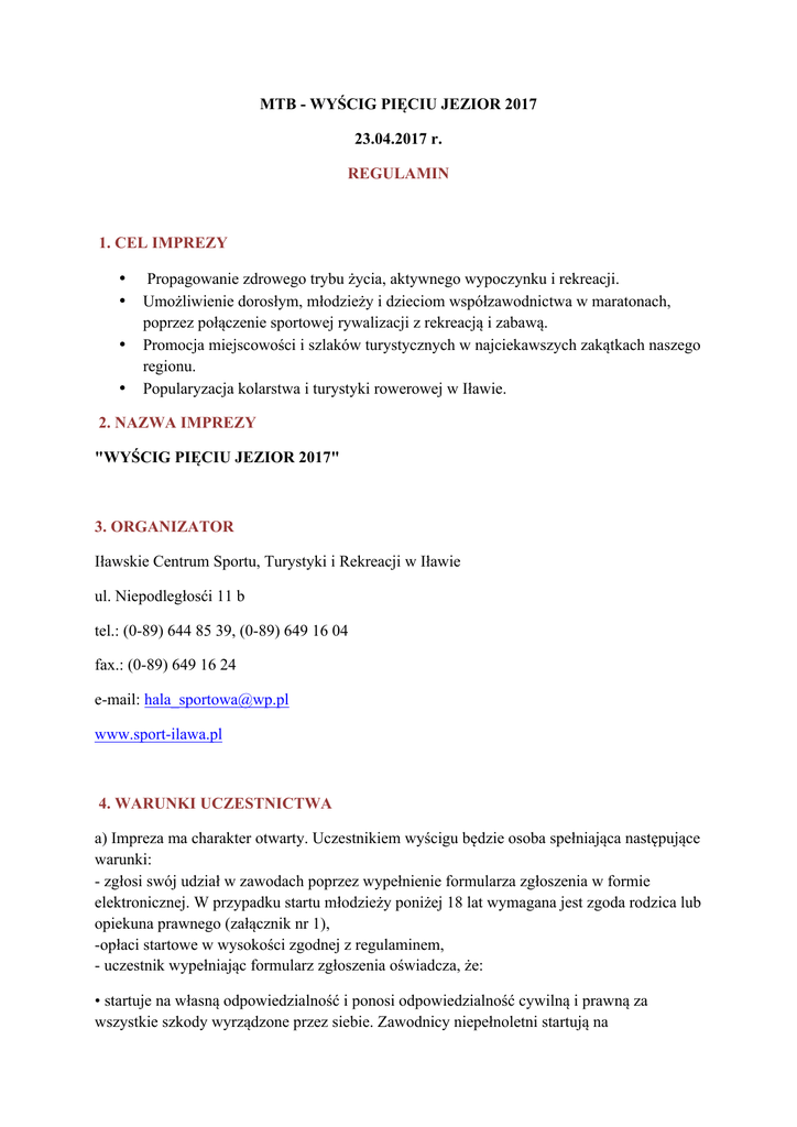MTB - WYŚCIG PIĘCIU JEZIOR 2017 23.04.2017 r. REGULAMIN 1