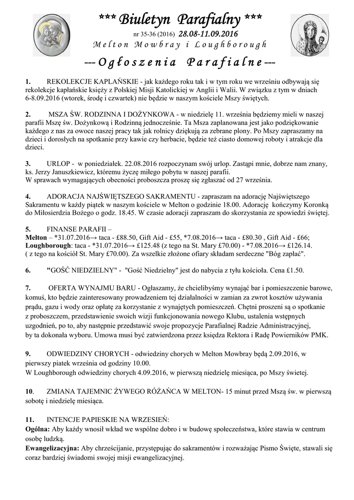 *** Biuletyn Parafialny *** 28.08-11.09.2016 Melton Mowbray i Loughborough nr 35-36 (2016) --- O g ł o s z e n i a P a r a f i a l n e --1. REKOLEKCJE KAPLAŃSKIE - jak każdego roku tak i w tym roku we wrześniu odbywają się rekolekcje kapłańskie księży z Polskiej Misji Katolickiej w Anglii i Walii. W związku z tym w dniach 6-8.09.2016 (wtorek, środę i czwartek) nie będzie w naszym kościele Mszy Mszy świętych. 2. MSZA ŚW. RODZINNA I DOŻYNKOWA - w niedzielę 11. września będziemy mieli w naszej parafii Mszę św. Dożynkową i Rodzinną jednocześnie. Ta Msza zaplanowana jest jako podziękowanie każdego z nas za owoce naszej pracy tak jak rolnicy dziękują za zebrane plony. Po Mszy zapraszamy na dzieci i dorosłych na spotkanie przy kawie czy herbacie, będzie też ciasto domowej roboty i atrakcje dla dzieci. 3. URLOP - w poniedziałek. 22.08.2016 rozpoczynam swój urlop. Zastąpi mnie, dobrze nam znany, ks. Jerzy Januszkiewicz, któremu życzę miłego pobytu w naszej n parafii. W sprawach wymagających obecności proboszcza proszę się zgłaszać od 27 września. 4. ADORACJA NAJŚWIĘTSZEGO SAKRAMENTU - zapraszam na adorację Najświętszego Sakramentu w każdy piątek w naszym kościele w Melton o godzinie 18.00. Adorację koń kończymy Koronką do Miłosierdzia Bożego o godz. 18.45. W czasie adoracji zapraszam do skorzystania ze spowiedzi świętej. 5. FINANSE PARAFII – Melton – *31.07.2016→ taca - £88.50, Gift Aid - £55, *7.08.2016→ taca - £80.30 , Gift Aid - £66; Loughborough: taca - *31.07.2016→ → £125.48 (z tego na St. Mary £70.00) - *7.08.2016 *7.08.2016→ £126.14. ( z tego na kościół St. Mary £70.00) 70.00). Za wszelkie złożone ofiary składam serdeczne "Bóg zapłać". 6. "GOŚĆ NIEDZIELNY" - "Gość Niedzielny" jest do nabycia z tyłu kościoła. Cena £1. £1.50. 7. OFERTA WYNAJMU BARU ARU - Ogłaszamy, że chcielibyśmy wynająć bar i pomieszczenie barowe, komuś, kto będzie zainteresowany prowadzeniem tej działalności w zamian za zwrot kosztów używania prądu, gazu i wody oraz opłatę za korzystanie z wynajętych pomieszczeń. Chętni proszeni są o spotkanie z proboszczem, przedstawienie swoich wizji funkcjonowania nowego Klubu, ustalenia wstępnych uzgodnień, po to, aby następnie przedstawić swoje propozycje Parafialnej Radzie Administracyjnej, by ta dokonała wyboru. Umowa musi być zatwierdzona przez przez księdza Rektora i Radę Powierników PMK. 9. ODWIEDZINY CHORYCH - odwiedziny chorych w Melton Mowbray będą 2.09.2016, w pierwszy piatek września od godziny 10.00. W Loughborough odwiedziny chorych 4.09.2016, w pierwszą niedzielę miesiąca, po Mszy świete świetej. 10. ZMIANA TAJEMNIC ŻYWEGO RÓŻAŃCA W MELTONMELTON 15 minut przed Mszą św. w pierwszą sobotę i niedzielę miesiąca. 11. INTENCJE PAPIESKIE NA WRZESIEŃ: Ogólna: Aby każdy wnosił wkład we wspólne dobro i w budowę społeczeństwa, które stawia w centrum osobę ludzką. Ewangelizacyjna: Aby chrześcijanie, przystępując do sakramentów i rozważając Pismo Święte, stawali się coraz bardziej świadomi swojej misji ewangelizacyjnej. POLSKA MISJA KATOLICKA w MELTON MOWBRAY i LOUGHBOROUGH Polska Parafia pw. MB Częstochowskiej i Polska Parafia pw.Świętej Rodziny Duszpasterz: ks. Krzysztof Zalewski PCM Melton Mowbray; Charity №: 1119423 PCM Loughborough; Charity №: 1119423 www.parafiamelton.ucoz.com www.polishchurche-melton.co.uk Adres: 119 Sandy Lane Melton Mowbray LE13 0AW telefon: 01664 562101 e-mail: [email protected] KALENDARZ LITURGICZNY I INTENCJE MSZALNE Sobota 27.08.2016 19.00 22 NIEDZIELA ZWYKŁA Melton 28.08.2016 Poniedziałek 29.08.2016 Wtorek 30.08.2016 Środa 31.08.2016 Czwartek 1.09.2016 Piątek 2.09.2016 10.30 12.45 Loughborough 10.00 10.00 10.00 Msza niedzielna Za śp. Szczepana Wojtak (int. żony) O zdrowie, Boże błogosławieństwo i wszelkie potrzebne łaski dla Krystyny z okazji urodzin Za śp. Aleksego Zarzyckiego (int. p. Hewel) Wspomnienie męczeństwa św. Jana Chrzciciela Dziękczynno - błagalna w drugą rocznicę ślubu Mirosława i Ani Wspomnienie bł. Bronisławy, zakonnicy 18.00 Adoracja Najświętszego Sakramentu i Koronka do Miłosierdzia o g. 18.45 19.00 W 3 r. pogrzebu o łaskę nieba dla córki Marii Oleś oraz o miłosierdzie Boże dla śp. rodziców: Anny i Eugeniusza Oleś (int. Ryszarda Oleś) Msza niedzielna Sobota 3.09.2016 19.00 O zdrowie i dalsze Boże błogosławieństwo dla Neli i Henryka Korabo (int. syna z rodziną) 23 NIEDZIELA ZWYKŁA 10.30 Melton Za śp. Huberta Janowskiego 4.09.2016 Poniedziałek 5.09.2016 Wtorek 6.09.2016 Środa 7.09.2016 Czwartek 8.09.2016 Piątek 9.09.2016 Sobota 10.09.2016 12.45 Loughborough Za śp. Bronisławę Zarzycką (int. p. Hewel) 10.00 Rekolekcje kapłańskie Rekolekcje kapłańskie Rekolekcje kapłańskie 18.00 Adoracja Najświętszego Sakramentu i Koronka do Miłosierdzia o g. 18.45 19.00 Dziękczynna i z prośbą o dalsze łaski dla syna z rodziną (int.p. Konieczko) 11.45 Ślub: Grzegorz Dobrowolski i Sigita Žukauskaitė 19.00 Msza niedzielna Za śp. Antoniego i Janinę Juszkiewicz (int. p. Eli Juszkiewicz) Msza Rodzinna i Dozynkowa 24 NIEDZIELA ZWYKŁA 11.09.2016 10.30 Melton 12.45 Loughborough 1. Dożynkowa - w podziękowaniu za otrzymane dary (int. Rady) 2. Za śp. Janinę i Ken'a Tyler oraz za Marię i Kazimierza Jacek (int. p. Boniewicz) Dziękczynno - błagalna z okazji 95. rocznicy urodzin Marty Mosoń