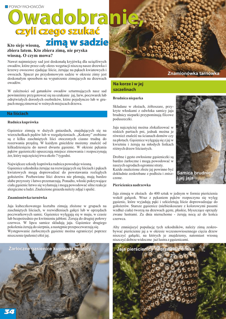 PORADY FACHOWCÓW Owadobranie, czyli czego szukać zimą w sadzie Kto sieje wiosną, zbiera latem. Kto zbiera zimą, nie pryska wiosną. O czym mowa? Nawet najmniejszy sad jest doskonałą kryjówką dla uciążliwych owadów, które przez cały okres wegetacji niszczą nasze drzewka i krzewy owocowe zjadając liście, żerując na pąkach kwiatowych i owocach. Spacer po przydomowym sadzie w okresie zimy jest doskonałym sposobem na wypatrzenie zimujących na drzewach owadów. W zależności od gatunków owadów szturmujących nasz sad powinniśmy przygotować się na szukanie jaj, larw, poczwarek lub odrętwiałych dorosłych osobników, które pojedynczo lub w grupach mogą zimować w rożnych miejscach drzewa. Na liściach Rudnica kuprówka Gąsienice zimują w dużych gniazdach, znajdujących się na wierzchołkach pędów lub w rozgałęzieniach. „Kokony” zrobione są z kilku zaschniętych liści otoczonych ciasno trudną do rozerwania przędzą. W każdym gnieździe możemy znaleźć od kilkudziesięciu do nawet dwustu gąsienic. W okresie pękania pąków gąsieniczki opuszczają miejsce zimowania i rozpoczynają żer, który najczęściej trwa około 7 tygodni. Największe szkody kuprówka rudnica powoduje wiosną. Gąsienice szkodnika żerując na rozwijających się liściach i pąkach kwiatowych mogą doprowadzać do powstawania rozległych gołożerów. Pozbawione liści drzewa nie plonują, mają bardzo słabe przyrosty i łatwo przemarzają. Ponadto, włoski pokrywające ciała gąsienic łatwo się wyłamują i mogą powodować silne reakcje alergiczne u ludzi. Znalezione gniazda należy zdjąć i spalić. Znamionówka tarnówka Jaja kubeczkowatego kształtu zimują złożone w grupach na zaschniętych liściach, w rozwidleniach gałęzi lub w oprzędach poczwarkowych samic. Gąsienice wylęgają się w maju, w czasie lub bezpośrednio po kwitnieniu jabłoni. Żerują do drugiej połowy czerwca. W lipcu samice składają jaja. Gąsienice drugiego pokolenia żerują do sierpnia, a następnie przepoczwarzają się. Występowanie żarłocznych gąsienic można ograniczyć poprzez niszczenie (palenie) złóż jaj. Żarłoczne gąsienice kuprówki rudnicy 34 Znamionówka tarnówka Na korze i w jej szczelinach Brudnica nieparka Składane w złożach, żółtoszare, przykryte włoskami z odwłoka samicy jaja brudnicy nieparki przypominają filcowe poduszeczki. Jaja najczęściej można zlokalizować w niskich partiach pni, jednak można je również znaleźć na ścianach domów czy na płotach. Gąsienice wylęgają się z jaj w kwietniu i żerują na młodych listkach różnych drzew liściastych. Drobne i gęsto owłosione gąsieniczki są bardzo żarłoczne i mogą powodować w naszych ogrodach ogromne straty. Każde znalezione złoże jaj powinno być dokładnie zeskrobane z podłoża i zniszczone. Samica brudnicy i jej jaja Pierścienica nadrzewka Jaja zimują w złożach do 400 sztuk w jednym w formie pierścienia wokół gałązek. Wraz z pękaniem pąków rozpoczyna się wylęg gąsienic, które wyjadają pąki i szkieletują liście doprowadzając do gołożerów. Starsze gąsienice (niebieskoszare z kolorowymi pasami wzdłuż ciała) tworzą na drzewach gęste, płaskie, błyszczące oprzędy zwane lustrami. Za dnia nieruchome - żerują nocą aż do końca czerwca. Aby zmniejszyć populację tych szkodników, należy zimą zeskrobywać pierścienie jaj a w okresie wczesnowiosennego cięcia drzew niszczyć gałązki, na których je znajdziemy, natomiast wiosną niszczyć dobrze widoczne już lustra z gąsienicami. Jaja pierścienicy nadrzewki z bliska PORADY FACHOWCÓW Piędzik przedzimek Miodówka jabłoniowa Zimujące jaja piędzika przedzimka możemy znaleźć rozrzucone pojedyncze na drzewie w zagłębieniach kory. Najczęściej znajdują się w wyższych częściach korony. Jaja są żółtozielone, owalne, długości 0,5 - 0,8 mm. Wiosną wylęgają się z nich zielone gąsienice z ciemnym paskiem, które żerują do połowy czerwca, uszkadzając liście, pąki kwiatowe i zawiązki owoców jabłoni, grusz, czasem też czereśni oraz innych drzew i krzewów owocowych. Jaja zimują po dolnej stronie pędów oraz w kątach rozgałęzień, ułożone w rzędach. Jaja są owalnego kształtu z wyrostkami, za pomocą których przytwierdzone są do gałęzi. Gdy gąsienice najedzą się do syta, opuszczają się na długich, cienkich niciach ku ziemi, by tam pod postacią poczwarek doczekać jesieni. Gąsieniczki piędzika są bardo łatwe do rozpoznania, gdyż podobnie jak inne przedstawicielki rodziny miernikowcowatych posiadają trzy pary odnóży tułowiowych i tylko dwie odwłokowych, dzięki czemu poruszają się jakby odmierzały pokonywany dystans. Wiosną wylęgają się z nich larwy, które żerują na młodych pąkach, szypułkach kwiatowych oraz na ogonkach liściowych młodych liści. Larwy wydzielają znaczne ilości lepkiej spadzi, sklejającej liście oraz pąki kwiatowe, które nie rozkwitają, usychają i opadają. Zidentyfikowane jaja należy niszczyć mechanicznie. Skorupik jabłoniowy Jaja tego gatunku zimują pod tarczką samicy, która po złożeniu średnio 70-100 jaj zamiera. Jaja są dobrze widoczne po oderwaniu tarczki od kory, przypominają one biały proszek. Wylęg rozpoczyna się tuż po kwitnieniu. Larwy i dorosłe osobniki wysysają soki z pędów drzew i krzewów owocowych, a w czasie żerowania wprowadzają do tkanek toksyczną substancję niszczącą komórki. W rezultacie wzrost jednej strony pędu zostaje zahamowany i dochodzi do pastorałowatego wygięcia. Wysoka liczebność szkodnika prowadzi do osłabienia wzrostu roślin, pogorszenia ich wzrostu i zwiększenia podatności na choroby i przemarzanie. Kolonia skorupika jabłoniowego Gąsienice piędzika bardzo łatwo rozpoznać Przędziorek owocowiec Formą zimującą są bardzo drobne, czerwone jaja, które w górnej części posiadają wyrostek w kształcie antenki, do któreg