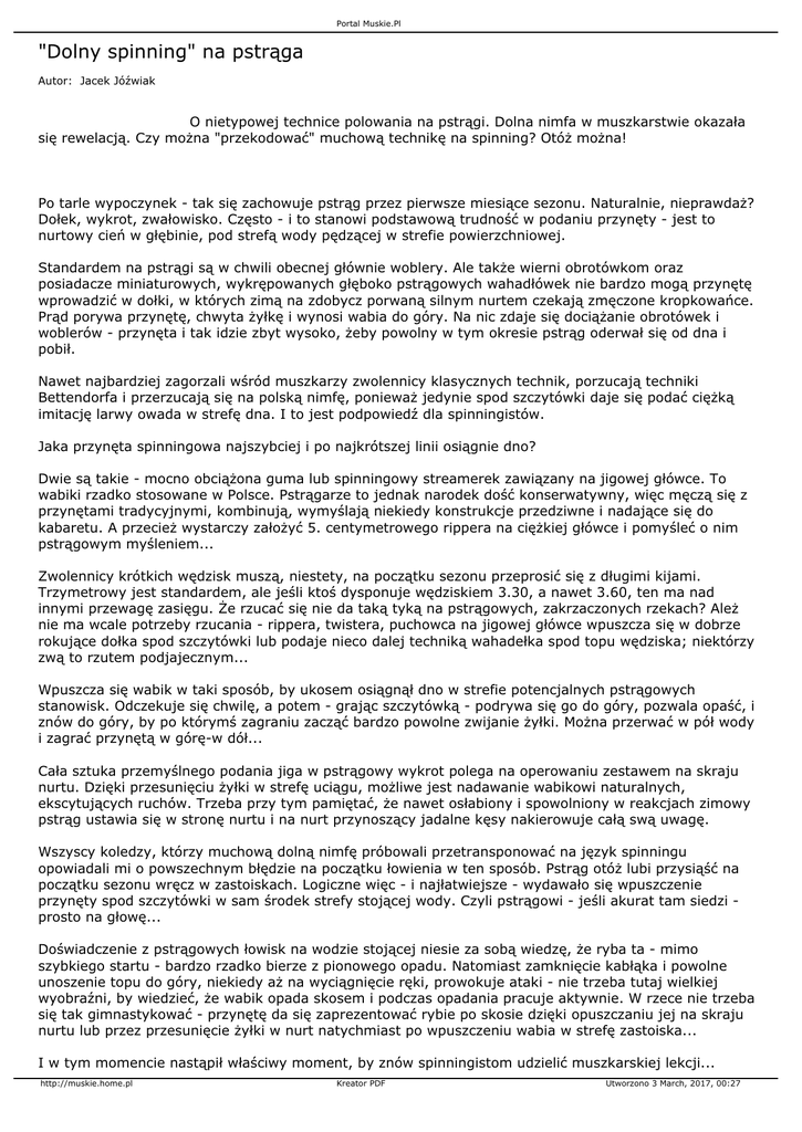 Portal Muskie.Pl "Dolny spinning" na pstrąga Autor: Jacek Jóźwiak O nietypowej technice polowania na pstrągi. Dolna nimfa w muszkarstwie okazała się rewelacją. Czy można "przekodować" muchową technikę na spinning? Otóż można! Po tarle wypoczynek - tak się zachowuje pstrąg przez pierwsze miesiące sezonu. Naturalnie, nieprawdaż? Dołek, wykrot, zwałowisko. Często - i to stanowi podstawową trudność w podaniu przynęty - jest to nurtowy cień w głębinie, pod strefą wody pędzącej w strefie powierzchniowej. Standardem na pstrągi są w chwili obecnej głównie woblery. Ale także wierni obrotówkom oraz posiadacze miniaturowych, wykrępowanych głęboko pstrągowych wahadłówek nie bardzo mogą przynętę wprowadzić w dołki, w których zimą na zdobycz porwaną silnym nurtem czekają zmęczone kropkowańce. Prąd porywa przynętę, chwyta żyłkę i wynosi wabia do góry. Na nic zdaje się dociążanie obrotówek i woblerów - przynęta i tak idzie zbyt wysoko, żeby powolny w tym okresie pstrąg oderwał się od dna i pobił. Nawet najbardziej zagorzali wśród muszkarzy zwolennicy klasycznych technik, porzucają techniki Bettendorfa i przerzucają się na polską nimfę, ponieważ jedynie spod szczytówki daje się podać ciężką imitację larwy owada w strefę dna. I to jest podpowiedź dla spinningistów. Jaka przynęta spinningowa najszybciej i po najkrótszej linii osiągnie dno? Dwie są takie - mocno obciążona guma lub spinningowy streamerek zawiązany na jigowej główce. To wabiki rzadko stosowane w Polsce. Pstrągarze to jednak narodek dość konserwatywny, więc męczą się z przynętami tradycyjnymi, kombinują, wymyślają niekiedy konstrukcje przedziwne i nadające się do kabaretu. A przecież wystarczy założyć 5. centymetrowego rippera na ciężkiej główce i pomyśleć o nim pstrągowym myśleniem... Zwolennicy krótkich wędzisk muszą, niestety, na początku sezonu przeprosić się z długimi kijami. Trzymetrowy jest standardem, ale jeśli ktoś dysponuje wędziskiem 3.30, a nawet 3.60, ten ma nad innymi przewagę zasięgu. Że rzucać się nie da taką tyką na pstrągowych, zakrzaczonych rzekach? Ależ nie ma wcale potrzeby rzucania - rippera, twistera, puchowca na jigowej główce wpuszcza się w dobrze rokujące dołka spod szczytówki lub podaje nieco dalej techniką wahadełka spod topu wędziska; niektórzy zwą to rzutem podjajecznym... Wpuszcza się wabik w taki sposób, by ukosem osiągnął dno w strefie potencjalnych pstrągowych stanowisk. Odczekuje się chwilę, a potem - grając szczytówką - podrywa się go do góry, pozwala opaść, i znów do góry, by po którymś zagraniu zacząć bardzo powolne zwijanie żyłki. Można przerwać w pół wody i zagrać przynętą w górę-w dół... Cała sztuka przemyślnego podania jiga w pstrągowy wykrot polega na operowaniu zestawem na skraju nurtu. Dzięki przesunięciu żyłki w strefę uciągu, możliwe jest nadawanie wabikowi naturalnych, ekscytujących ruchów. Trzeba przy tym pamiętać, że nawet osłabiony i spowolniony w reakcjach zimowy pstrąg ustawia się w stronę nurtu i na nurt przynoszący jadalne kęsy nakierowuje całą swą uwagę. Wszyscy koledzy, którzy muchową dolną nimfę próbowali przetransponować na język spinningu opowiadali mi o powszechnym błędzie na początku łowienia w ten sposób. Pstrąg otóż lubi przysiąść na początku sezonu wręcz w zastoiskach. Logiczne więc - i najłatwiejsze - wydawało się wpuszczenie przynęty spod szczytówki w sam środek strefy stojącej wody. Czyli pstrągowi - jeśli akurat tam siedzi prosto na głowę... Doświadczenie z pstrągowych łowisk na wodzie stojącej niesie za sobą wiedzę, że ryba ta - mimo szybkiego startu - bardzo rzadko bierze z pionowego opadu. Natomiast zamknięcie kabłąka i powolne unoszenie topu do góry, niekiedy aż na wyciągnięcie ręki, prowokuje ataki - nie trzeba tutaj wielkiej wyobraźni, by wiedzieć, że wabik opada skosem i podczas opadania pracuje aktywnie. W rzece nie trzeba się tak gimnastykować - przynętę da się zaprezentować rybie po skosie dzięki opuszczaniu jej na skraju nurtu lub przez przesunięcie żyłki w nurt natychmiast po wpuszczeniu wabia w strefę zastoiska... I w tym momencie nastąpił właściwy moment, by znów spinningistom udzielić muszkarskiej lekcji... http://muskie.home.pl Kreator PDF Utworzono 3 March, 2017, 00:27 Portal Muskie.Pl Łowiący w czystej wodzie na nimfę lub mokra muchę mogą o braniu pstrąga opowiadać godzinami. Zjawisko to bowiem nadzwyczaj piękne i widowiskowe. Kropkowaniec zwrócony jest "twarzą" pod prąd, tak aby spływający kąsek czy ofiarę dostrzec już z daleka. I mimo - już o tym wspominałem - że potrafi do pokarmu wystartować jak błyskawica, to zazwyczaj lubi się do ataku przygotować bardzo starannie, można by rzec, że z całą obrzędowością. Przedstawmy sobie taką sytuację... Spływa prowadzona starannie nimfa, pstrąg ją dostrzega z daleka... I wcale nie przyczaja się jak jakieś kocisko, by zaatakować ją z nagła, z przyczajki - przeciwnie, odrywa się od dna, ustawia na jej drodze... Kiedy nimfa znajduje się już w zasięgu machnięcia ogonem, to wcale się na nią nie rzuca natychmiast. Przeciwnie - daje się znieść prądowi pół metra, metr, półtora, zupełnie jak snajper ustawiający sobie ofiarę w krzyżaku celownika optycznego. Atak jest precyzyjny, błyskawiczny i zawiera się w rzadko dzisiaj używanym słowie - niechybny. No dobra, ale co ma wspólnego muszkarskie studium pstrągowego brania do opadającej szybko silikonowej rybki lub spinnigowego streamerka? Otóż ma - co także widywałem w krystalicznie czystych wodach na Słowacji i w Skandynawii. Otóż podczas wpuszczania rippera w opisywany sposób, pstrągi wcale nie pośpiesznie, a dostojnie niemal - podpływały w miejsce, gdzie przynęta "bombła" w dno i ustawiały się wygodnie. Atakowały też wca