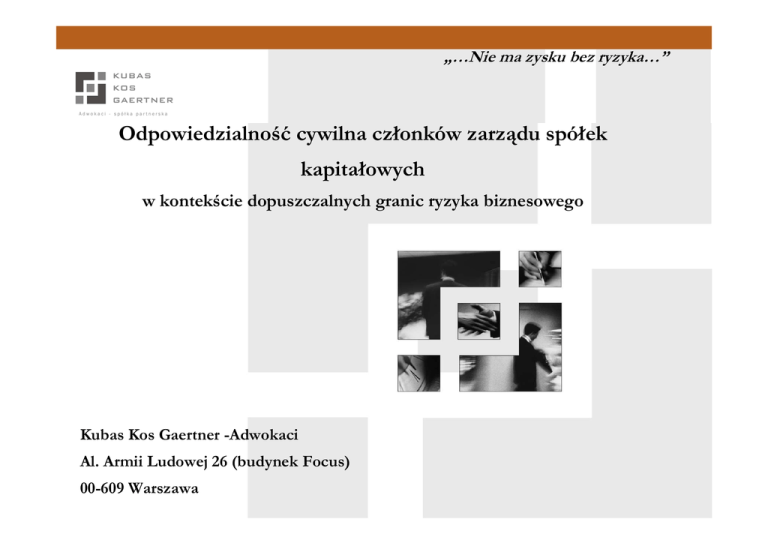 „…Nie ma zysku bez ryzyka…” Odpowiedzialność cywilna członków zarządu spółek kapitałowych w kontekście dopuszczalnych granic ryzyka biznesowego Kubas Kos Gaertner -Adwokaci Al. Armii Ludowej 26 (budynek Focus) 00-609 Warszawa KWESTIE WPROWADZAJĄCE : 1. RODZAJE ODPOWIEDZIALNOŚCI i. ii. prywatnoprawna (cywilnoprawna): • wewnętrzna (wobec spółki i jej wspólników); • zewnętrzna (wobec wierzycieli spółki i osób trzecich); publicznoprawna (poza prawem prywatnym): • administracyjnoprawna (prawo administracyjne); • karna (kodeks karny, pozakodeksowe prawo karne); karny-skarbowy, KWESTIE WPROWADZAJĄCE : 2. PRZYPOMNIENIE OGÓLNYCH PRZESŁANEK ODPOWIEDZIALNOŚCI (1) i.źródła obowiązków członków zarządu: • ustawa (kodeks spółek handlowych i pozakodeksowe przepisy prawa handlowego, np. ustawa o KRS); • akty organiczne spółki (statut spółki akcyjnej, umowa spółki z ograniczoną odpowiedzialnością, itp.); • regulaminy funkcjonowania organów spółki; • umowy konstruujące stosunek zatrudnienia (kontrakty menedŜerskie); • umowy wspólników, które członek zarządu zobowiązał się przestrzegać (np. joint venture agreements); ii.bezprawność jako podstawowa przesłanka odpowiedzialności iii.kryterium winy – wina w postaci lekkomyślności i niedbalstwa, zamiar ewentualny; KWESTIE WPROWADZAJĄCE: 2. PRZYPOMNIENIE OGÓLNYCH PRZESŁANEK ODPOWIEDZIALNOŚCI (2) iv.mierniki staranności (standardy zarządzania); • SA Katowice 5.11.1998 (ACa 322/1998): Staranność sumiennego kupca powinna uwzględniać : (a) przewidywanie skutków załoŜonych działań, (b) podejmowanie dostępnych środków faktycznych lub prawnych w celu wywiązania się z zobowiązania, (c) wykazywanie zapobiegliwości, sumienności, ostroŜności i dbałości dla osiągnięcia rezultatu zgodnego z interesami spółki. KWESTIE WPROWADZAJĄCE: 3. ZNACZENIE ABSOLUTORIUM (1) i. Co do zasady wyłącza odpowiedzialność członka zarządu za szkodę względem spółki . ii. Udzielenie/odmowa nie jest powiązane z mandatem zarządcy. KWESTIE WPROWADZAJĄCE: 3. ZNACZENIE ABSOLUTORIU (2) Orzeczenie SA Katowice 5.11.2004 (I ACa 540/2004): iii.(…) sama odmowa udzielenia absolutorium nie jest równoznaczna z odpowiedzialnością członka zarządu i nie przesądza o działaniu lub zaniechaniu sprzecznym z prawem lub postanowieniami statutu spółki. iv.Nie moŜna skutecznie domagać się ustalenia nieistnienia odpowiedzialności powoda z tytułu wszystkich nieskonkretyzowanych zdarzeń i zachowań mogących ewentualnie w przyszłości prowadzić do odpowiedzialności członka zarządu za szkodę wyrządzoną działaniem lub zachowaniem sprzecznym z prawem lub postanowieniami statutu. KWESTIE WPROWADZAJĄCE: 4. PODZIAŁ KOMPETENCJI W ZARZĄDZIE A ODPOWIEDZIALNOŚĆ JEGO POSZCZEGÓLNYCH CZŁONKÓW Orzeczenie SA Katowice 5.11.1998 (ACa 322/1998): i. Znaczny stopień wyodrębnienie samodzielności biura finansowo-organizacyjne, maklerskiego które zezwalały oraz mu jego na samodzielne podejmowanie decyzji, nie wyłączało go spod nadzoru organów banku, a kierujący biurem był powołany i odwoływany przez zarząd banku. ii. Powierzenie nadzoru jednemu członkowi zarządu banku nad działalnością biura z reguły nie powinno zwalniać pozostałych członków zarządu od odpowiedzialności w tym zakresie. 5. 1. RYZYKO GOSPODARCZE JAKO PRZESŁANKA WYŁĄCZENIA ODPOWIEDZIALNOŚCI CZŁONKA ZARZĄDU – ZAŁOśENIA i. Obowiązek pomnaŜania majątku spółki jako podstawowy obowiązek zarządców (takŜe w warunkach ryzyka gospodarczego) ii. Działania menedŜerów nie mogą być dowolne i wyjęte spod weryfikacji pod kątem legalności; iii. Kluczowe ustalenie pojęcia LEGALNOŚCI w kontekście decyzji biznesowych iv. Relewantność kryteriów ekonomicznych (celowość, rentowność bądź uzasadnione ryzyko ekonomiczne)? efektywność, 5.1. RYZYKO GOSPODARCZE W ORZECZNICTWIE SN (1) i. Członek zarządu odpowiedzialny za szkody wyrządzone działaniem lub zaniechaniem sprzecznym z prawem lub postanowieniami statutu spółki (zgodnie z art. 293 § 1 oraz art. 483 § 1 kodeksu spółek handlowych). ii. Ustalenie bezprawności zgodnie z art. 293 kodeksu wymaga wskazania na czym polega sprzeczność zachowania członka organu spółki z określonym przepisem prawa bądź postanowieniem umowy. iii. Zdaniem SN powinność zachowania musi wynikać wprost z umowy spółki lub z ustawy. 5.1. RYZYKO GOSPODARCZE W ORZECZNICTWIE SN (2) iv. Uchybienie art. 293 § 2 kodeksu (wymóg dołoŜenia staranności) nie stanowi per se zaniechania sprzecznego z prawem . v. Miernik staranności jest kryterium winy a spełnieniem tego kryterium nie zwalnia Sąd od obowiązku ustalenia bezprawności. vi. Na powodzie obowiązek wykazania bezprawności działania członka organu w następującym rozumieniu: • naruszenie określonej normy; • szkoda wynikająca z takiego naruszenia; • związek przyczynowy pomiędzy naruszeniem a szkodą. vii. Reguła dowodowa w postaci domniemania dotyczy wyłącznie winy z art. 293 kodeksu)! 5.1. RYZYKO GOSPODARCZE W ORZECZNICTWIE SN – KONKLUZJE (3) viii.Szeroki obszar bezpieczeństwa członków zarządu wyznaczony poprzez aktualną linię orzeczniczą poprzez odwołanie się do skonkretyzowanych ex ante norm powinnościowych. ix. Wątpliwa efektywność linii orzeczniczej. x. Ryzyko odczytania judykatury SN jako bodźca do kazuistycznego formułowania umów spółek. 5.1. RYZYKO GOSPODARCZE W ORZECZNICTWIE SN – KONKLUZJE c.d. (4) xi. Iluzoryczność odpowiedzialności członków zarządu wobec spółki ? xii. Sąd jako „superarbiter gospodarczy” ? xiii.Uprawnienie członków zarządu do podejmowania decyzji biznesowych w oparciu o uznaniowość (w granicach „safe harbour” ) 5.2.RYZYKO GOSPODARCZE - BUSINESS JUDGMENT RULE (1) i. Zobowiązania członka zarządu do lojalności wobec spółki. ii. Odpowiedzialność za wszelkie działania wynikające ze źró