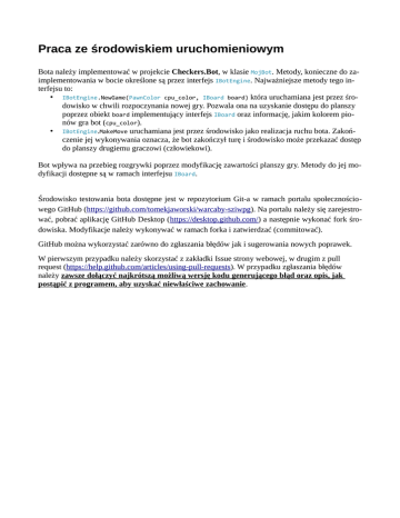 Praca ze środowiskiem uruchomieniowym Bota należy implementować w projekcie Checkers.Bot, w klasie MojBot. Metody, konieczne do zaimplementowania w bocie określone są przez interfejs IBotEngine. Najważniejsze metody tego interfejsu to: • IBotEngine.NewGame(PawnColor cpu_color, IBoard board) która uruchamiana jest przez środowisko w chwili rozpoczynania nowej gry. Pozwala ona na uzyskanie dostępu do planszy poprzez obiekt board implementujący interfejs IBoard oraz informację, jakim kolorem pionów gra bot (cpu_color). • IBotEngine.MakeMove uruchamiana jest przez środowisko jako realizacja ruchu bota. Zakończenie jej wykonywania oznacza, że bot zakończył turę i środowisko może przekazać dostęp do planszy drugiemu graczowi (człowiekowi). Bot wpływa na przebieg rozgrywki poprzez modyfikację zawartości planszy gry. Metody do jej modyfikacji dostępne są w ramach interfejsu IBoard. Środowisko testowania bota dostępne jest w repozytorium Git-a w ramach portalu społecznościowego GitHub (https://github.com/tomekjaworski/warcaby-sziwpg). Na portalu należy się zarejestrować, pobrać aplikację GitHub Desktop (https://desktop.github.com/) a następnie wykonać fork środowiska. Modyfikacje należy wykonywać w ramach forka i zatwierdzać (commitować). GitHub można wykorzystać zarówno do zgłaszania błędów jak i sugerowania nowych poprawek. W pierwszym przypadku należy skorzystać z zakładki Issue strony webowej, w drugim z pull request (https://help.github.com/articles/using-pull-requests). W przypadku zgłaszania błędów należy zawsze dołączyć najkrótszą możliwą wersję kodu generującego błąd oraz opis, jak postąpić z programem, aby uzyskać niewłaściwe zachowanie.