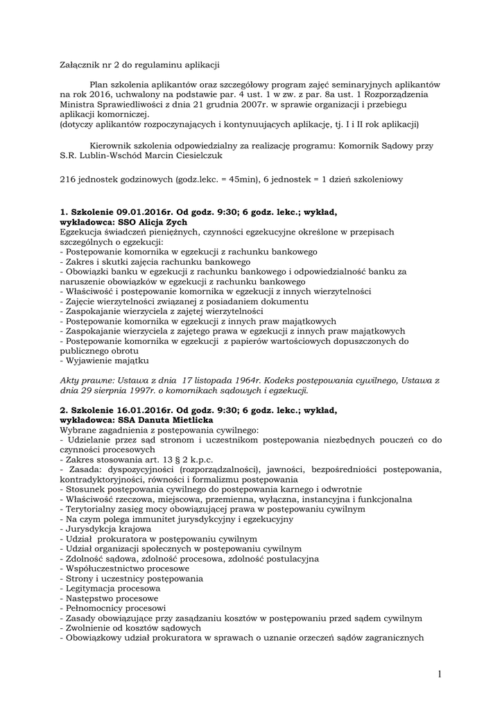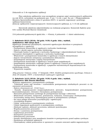 Załącznik nr 2 do regulaminu aplikacji Plan szkolenia aplikantów oraz szczegółowy program zajęć seminaryjnych aplikantów na rok 2016, uchwalony na podstawie par. 4 ust. 1 w zw. z par. 8a ust. 1 Rozporządzenia Ministra Sprawiedliwości z dnia 21 grudnia 2007r. w sprawie organizacji i przebiegu aplikacji komorniczej. (dotyczy aplikantów rozpoczynających i kontynuujących aplikację, tj. I i II rok aplikacji) Kierownik szkolenia odpowiedzialny za realizację programu: Komornik Sądowy przy S.R. Lublin-Wschód Marcin Ciesielczuk 216 jednostek godzinowych (godz.lekc. = 45min), 6 jednostek = 1 dzień szkoleniowy 1. Szkolenie 09.01.2016r. Od godz. 9:30; 6 godz. lekc.; wykład, wykładowca: SSO Alicja Zych Egzekucja świadczeń pieniężnych, czynności egzekucyjne określone w przepisach szczególnych o egzekucji: - Postępowanie komornika w egzekucji z rachunku bankowego - Zakres i skutki zajęcia rachunku bankowego - Obowiązki banku w egzekucji z rachunku bankowego i odpowiedzialność banku za naruszenie obowiązków w egzekucji z rachunku bankowego - Właściwość i postępowanie komornika w egzekucji z innych wierzytelności - Zajęcie wierzytelności związanej z posiadaniem dokumentu - Zaspokajanie wierzyciela z zajętej wierzytelności - Postępowanie komornika w egzekucji z innych praw majątkowych - Zaspokajanie wierzyciela z zajętego prawa w egzekucji z innych praw majątkowych - Postępowanie komornika w egzekucji z papierów wartościowych dopuszczonych do publicznego obrotu - Wyjawienie majątku Akty prawne: Ustawa z dnia 17 listopada 1964r. Kodeks postępowania cywilnego, Ustawa z dnia 29 sierpnia 1997r. o komornikach sądowych i egzekucji. 2. Szkolenie 16.01.2016r. Od godz. 9:30; 6 godz. lekc.; wykład, wykładowca: SSA Danuta Mietlicka Wybrane zagadnienia z postępowania cywilnego: - Udzielanie przez sąd stronom i uczestnikom postępowania niezbędnych pouczeń co do czynności procesowych - Zakres stosowania art. 13 § 2 k.p.c. - Zasada: dyspozycyjności (rozporządzalności), jawności, bezpośredniości postępowania, kontradyktoryjności, równości i formalizmu postępowania - Stosunek postępowania cywilnego do postępowania karnego i odwrotnie - Właściwość rzeczowa, miejscowa, przemienna, wyłączna, instancyjna i funkcjonalna - Terytorialny zasięg mocy obowiązującej prawa w postępowaniu cywilnym - Na czym polega immunitet jurysdykcyjny i egzekucyjny - Jurysdykcja krajowa - Udział prokuratora w postępowaniu cywilnym - Udział organizacji społecznych w postępowaniu cywilnym - Zdolność sądowa, zdolność procesowa, zdolność postulacyjna - Współuczestnictwo procesowe - Strony i uczestnicy postępowania - Legitymacja procesowa - Następstwo procesowe - Pełnomocnicy procesowi - Zasady obowiązujące przy zasądzaniu kosztów w postępowaniu przed sądem cywilnym - Zwolnienie od kosztów sądowych - Obowiązkowy udział prokuratora w sprawach o uznanie orzeczeń sądów zagranicznych 1 - Pojęcie, rodzaje, forma czynności postępowania Pisma procesowe, urzędowe formularze Uzupełnienie braków formalnych pism procesowych i skutki ich nieuzupełnienia Doręczanie pism sądowych i procesowych Akty prawne: Ustawa z dnia 17 listopada 1964r. Kodeks postępowania cywilnego 3. Szkolenie 23.01.2016r. Od godz. 9:30; 6 godz. lekc.; wykład/ćwiczenia, wykładowca: KSR Arkadiusz Włodarczyk Stosowanie Konwencji o ochronie praw człowieka i podstawowych wolności w Polsce w świetle Deklaracji z Brighton (Deklaracja konferencji wysokiego szczebla nt przyszłości Europejskiego Trybunału Praw Człowieka z dn. 17-18 kwietnia 2012r. w Brighton) oraz art. 16 i 17 rozporządzenia Rady WE nr 1346/2000 z dnia 29 maja 2000r. w sprawie postępowania upadłościowego. Akty prawne: Deklaracja konferencji wysokiego szczebla nt przyszłości Europejskiego Trybunału Praw Człowieka z dn. 17-18 kwietnia 2012r., Rozporządzenie Rady WE nr 1346/2000 z dnia 29 maja 2000r. w sprawie postępowania upadłościowego. 4. Szkolenie 30.01.2016r. Od godz. 9:30; 6 godz. lekc.; wykład; wykładowca: SSA Danuta Mietlicka Wybrane zagadnienia z postępowania cywilnego, cd.: - Terminy w postępowaniu cywilnym - obliczanie, przywracanie - Ciężar udowodnienia twierdzeń faktycznych w postępowaniu cywilnym - Kto nie może być świadkiem a kto jest uprawniony do odmowy zeznań - Wyrok wstępny, częściowy, łączny - Wyrok kontradyktoryjny i wyrok zaoczny - Nieważność postępowania - Sprostowanie, uzupełnienie i wykładnia wyroku - Wyrok, postanowienie, prawomocność orzeczeń - Oddalenie powództwo i odrzucenie pozwu - Srodki zaskarżenia - Skarga na naruszenie prawa strony do rozpoznania sprawy w postępowaniu sądowym bez nieuzasadnionej zwłoki - Postępowanie dowodowe w postępowaniu apelacyjnym - Wznowienie postępowania - Skarga o stwierdzenie niezgodności z prawem prawomocnego orzeczenia - Sąd polubowny, wyrok sądu polubownego, skarga o uchylenie wyroku sądu polubownego, uznanie i stwierdzenie wykonalności wyroku sądu polubownego - test sprawdzający opanowanie zagadnień z postępowania cywilnego Akty prawne: Ustawa z dnia 17 listopada 1964r. Kodeks postępowania cywilnego, 5. Szkolenie 06.02.2016r. Od godz. 10:00; 6 godz. lekc; kolokwium zaliczeniowe dla aplikantów drugiego roku aplikacji (aplikanci pierwszego roku – dzień wolny od zajęć) wykładowca/kierownik szkolenia: SSO Alicja Zych, KSR Marcin Ciesielczuk 6. Szkolenie 13.02.2016r. Od godz. 9:30; 6 godz. lekc.; wykład; wykładowca: SSO Alicja Zych Egzekucja świadczeń pieniężnych, czynności egzekucyjne określone w przepisach szczególnych o egzekucji, cd.: - Egzekucja świadczeń alimentacyjnych - Egzekucja należności sądowych - Egzekucja wydania rzeczy - Wykonanie orzeczeń zagranicznych - Czynności komornika w egzekucji prowadzonej przez sąd (art. 1049-1051) Akty prawne: Ustawa z dnia 17 listopada 1964r. Kodeks postępowania cywilnego, Ustawa z dnia 29 sierpnia 1997r. o komornikach sądo
