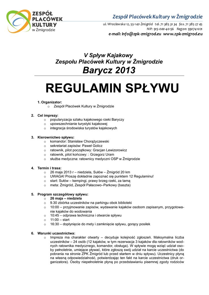 V Spływ Kajakowy Zespołu Placówek Kultury w Żmigrodzie Barycz 2013 REGULAMIN SPŁYWU 1. Organizator: o Zespół Placówek Kultury w Żmigrodzie 2. Cel imprezy: o popularyzacja szlaku kajakowego rzeki Baryczy o upowszechnianie turystyki kajakowej o integracja środowiska turystów kajakowych 3. Kierownictwo spływu: o komandor: Stanisław Chorążyczewski o sekretariat zapisów: Paweł Golicz o ratownik, pilot początkowy: Gracjan Lewizorowicz o ratownik, pilot końcowy: : Grzegorz Uram o służba medyczna: ratownicy medyczni OSP w Żmigrodzie 4. Termin i trasa: o 26 maja 2013 r – niedziela, Sułów – Żmigród 20 km o UWAGA! Proszę dokładnie zapoznać się punktem 12 Regulaminu! o start: Sułów – kempingi, prawy brzeg rzeki, za tamą o meta: Żmigród, Zespół Pałacowo–Parkowy (baszta) 5. Program szczegółowy spływu: o 26 maja – niedziela o 9.30 zbiórka uczestników na parkingu obok biblioteki o 10:00 – przyjmowanie zapisów, wydawanie kajaków osobom zapisanym, przygotowanie kajaków do wodowania o 10:45 – odprawa techniczna i otwarcie spływu o 11:00 – start o 16:30 – dopłynięcie do mety i zamknięcie spływu, gorący posiłek 6. Warunki uczestnictwa: o Impreza ma charakter otwarty – decyduje kolejność zgłoszeń. Maksymalna liczba uczestników – 24 osób (12 kajaków, w tym rezerwacja 3 kajaków dla ratowników wodnych ratownika medycznego, komandor, obsługa). W spływie mogą wziąć udział osoby pełnoletnie, umiejące pływać, które zgłoszą swój udział na karcie uczestnictwa (do pobrania na stronie ZPK Żmigród lub przed startem w dniu spływu). Uczestnicy płyną na własną odpowiedzialność, potwierdzając ten fakt na karcie uczestnictwa (druk organizatora). Osoby niepełnoletnie płyną po przedstawianiu pisemnej zgody rodziców (na karcie uczestnictwa) i pod opieką osoby dorosłej, która bierze odpowiedzialność za niepełnoletniego. Wszyscy uczestnicy płyną bezwarunkowo w kamizelkach asekuracyjnych. 7. Informacji udzielają: o Zespół Placówek Kultury w Żmigrodzie tel. (71) 385 31 34, [email protected] 8. Zgłoszenia do imprezy: o przyjmowane wyłącznie na karcie uczestnictwa dostarczonej do dnia 24 maja 2013 r. do godziny 12.00 na adres organizatora (pokój nr 8) 9. Wpisowe: Wpisowe wynosi 30 zł/osobę z przeznaczeniem na ubezpieczenie, transport i gorący posiłek. Zgłoszenia do uczestnictwa w spływie wraz z kartą uczestnika i wpłatą gotówkową przyjmowane będą w sekretariacie spływu (ZPK pokój nr 8). Istnieje możliwość wzięcia udziału w spływie na własnych kajakach. 10. Świadczenia organizatora: o miejsce w turystycznym kajaku dwuosobowym z wiosłem i kamizelką asekuracyjną o opieka pilota-przewodnika, ratownika WOPR, pomoc techniczna o pierwsza pomoc medyczna o zapewnienie dojazdu na miejsce startu o gorący posiłek o ubezpieczenie od NNW 11. Obowiązki uczestników: o podporządkowanie się Regulaminowi i uzasadnionym poleceniom Kierownictwa spływu o podanie swoich danych: imię i nazwisko, adres, PESEL (dowód osobisty lub legitymacja szkolna do wglądu) o udzielanie pomocy uczestnikom na trasie w razie potrzeby o niezanieczyszczanie trasy spływu o nieużywanie napojów alkoholowych o skompletowanie wyposażenia osobistego we własnym zakresie 12. Warianty nieprzewidzianych trudności – termin rezerwowy o w przypadku braku dostatecznej ilości wody w korycie Baryczy w dniu 26 maja 2013, spływ może zostać odwołany a termin rezerwowy podany zostanie najpóźniej do dnia 28.05.2013 na stronie internetowej ZPK o o ewentualne odwołanie spływu uczestnicy zobowiązani są zapytać telefonicznie organizatora tel. 71 385 31 34 lub Komandora spływu w dniu 24 maja 2013 tel. 696 47 26 39 13. Postanowienia końcowe: o w zależności od nieprzewidzianych okoliczności Organizator zastrzega sobie prawo do dokonania zmian w programie spływu o Organizator może odwołać spływ w części lub całości ze względu na niesprzyjające warunki atmosferyczne (ulewny deszcz, niski stan wody itp.) o osoby nieprzestrzegające Regulaminu spływu bądź norm współżycia międzyludzkiego mogą być wydalone ze spływu o uczestnicy odpowiadają materialnie za szkody wyrządzone przez siebie w trakcie trwania imprezy o prawo interpretacji niniejszego Regulaminu należy do Kierownictwa spływu Zespół Placówek Kultury w Żmigrodzie