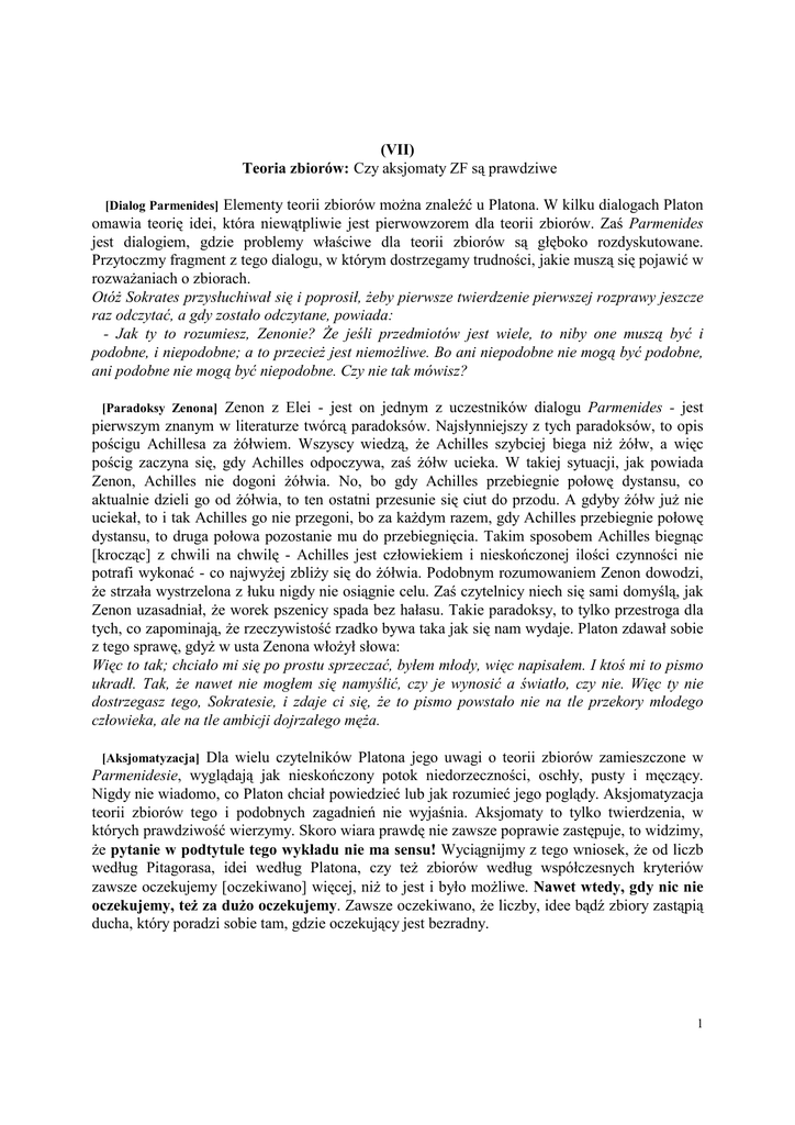(VII) Teoria zbiorów: Czy aksjomaty ZF są prawdziwe [Dialog Parmenides] Elementy teorii zbiorów moŜna znaleźć u Platona. W kilku dialogach Platon omawia teorię idei, która niewątpliwie jest pierwowzorem dla teorii zbiorów. Zaś Parmenides jest dialogiem, gdzie problemy właściwe dla teorii zbiorów są głęboko rozdyskutowane. Przytoczmy fragment z tego dialogu, w którym dostrzegamy trudności, jakie muszą się pojawić w rozwaŜaniach o zbiorach. OtóŜ Sokrates przysłuchiwał się i poprosił, Ŝeby pierwsze twierdzenie pierwszej rozprawy jeszcze raz odczytać, a gdy zostało odczytane, powiada: - Jak ty to rozumiesz, Zenonie? śe jeśli przedmiotów jest wiele, to niby one muszą być i podobne, i niepodobne; a to przecieŜ jest niemoŜliwe. Bo ani niepodobne nie mogą być podobne, ani podobne nie mogą być niepodobne. Czy nie tak mówisz? [Paradoksy Zenona] Zenon z Elei - jest on jednym z uczestników dialogu Parmenides - jest pierwszym znanym w literaturze twórcą paradoksów. Najsłynniejszy z tych paradoksów, to opis pościgu Achillesa za Ŝółwiem. Wszyscy wiedzą, Ŝe Achilles szybciej biega niŜ Ŝółw, a więc pościg zaczyna się, gdy Achilles odpoczywa, zaś Ŝółw ucieka. W takiej sytuacji, jak powiada Zenon, Achilles nie dogoni Ŝółwia. No, bo gdy Achilles przebiegnie połowę dystansu, co aktualnie dzieli go od Ŝółwia, to ten ostatni przesunie się ciut do przodu. A gdyby Ŝółw juŜ nie uciekał, to i tak Achilles go nie przegoni, bo za kaŜdym razem, gdy Achilles przebiegnie połowę dystansu, to druga połowa pozostanie mu do przebiegnięcia. Takim sposobem Achilles biegnąc [krocząc] z chwili na chwilę - Achilles jest człowiekiem i nieskończonej ilości czynności nie potrafi wykonać - co najwyŜej zbliŜy się do Ŝółwia. Podobnym rozumowaniem Zenon dowodzi, Ŝe strzała wystrzelona z łuku nigdy nie osiągnie celu. Zaś czytelnicy niech się sami domyślą, jak Zenon uzasadniał, Ŝe worek pszenicy spada bez hałasu. Takie paradoksy, to tylko przestroga dla tych, co zapominają, Ŝe rzeczywistość rzadko bywa taka jak się nam wydaje. Platon zdawał sobie z tego sprawę, gdyŜ w usta Zenona włoŜył słowa: Więc to tak; chciało mi się po prostu sprzeczać, byłem młody, więc napisałem. I ktoś mi to pismo ukradł. Tak, Ŝe nawet nie mogłem się namyślić, czy je wynosić a światło, czy nie. Więc ty nie dostrzegasz tego, Sokratesie, i zdaje ci się, Ŝe to pismo powstało nie na tle przekory młodego człowieka, ale na tle ambicji dojrzałego męŜa. Dla wielu czytelników Platona jego uwagi o teorii zbiorów zamieszczone w Parmenidesie, wyglądają jak nieskończony potok niedorzeczności, oschły, pusty i męczący. Nigdy nie wiadomo, co Platon chciał powiedzieć lub jak rozumieć jego poglądy. Aksjomatyzacja teorii zbiorów tego i podobnych zagadnień nie wyjaśnia. Aksjomaty to tylko twierdzenia, w których prawdziwość wierzymy. Skoro wiara prawdę nie zawsze poprawie zastępuje, to widzimy, Ŝe pytanie w podtytule tego wykładu nie ma sensu! Wyciągnijmy z tego wniosek, Ŝe od liczb według Pitagorasa, idei według Platona, czy teŜ zbiorów według współczesnych kryteriów zawsze oczekujemy [oczekiwano] więcej, niŜ to jest i było moŜliwe. Nawet wtedy, gdy nic nie oczekujemy, teŜ za duŜo oczekujemy. Zawsze oczekiwano, Ŝe liczby, idee bądź zbiory zastąpią ducha, który poradzi sobie tam, gdzie oczekujący jest bezradny. [Aksjomatyzacja] 1 Do tego, aby myślenie przystawało w zakresie zdrowego rozsądku do rzeczywistości, potrzebna jest armia duchów. Często Ŝołnierzy takiej armii nazywamy aniołami. Czy kaŜdemu niezbędny jest własny anioł stróŜ? Wielu za nas w to wierzy. Niektórzy rozmowy z aniołem stróŜem zwą sumienie. W anioła stróŜa, w zalety sumienia, kaŜdy sobie wierzy tak, jak mu się to podoba. Czy taki rodzaj wiary nie jest mnoŜeniem bytów, o których krótko naleŜałby powiedzieć, iŜ powstają nadaremno? Twierdzimy, Ŝe tam gdzie jest cywilizacja tam, choć jeden rodzaj ducha jest niezbędny. Dla przetrwania cywilizacji niezbędna jest umiejętność porozumiewania się. Kresem cywilizacji są wojny albo naturalne kataklizmy. Wtedy sztuka porozumiewania się zanika. [Anioł stróŜ] [Choć jedna niesprzeczna teoria] Dla skutecznego porozumiewania się niezbędna jest wiara w sens porozumienia. Zaś niezbędną właściwością, jest niesprzeczność zasad wchodzących w zakres porozumienia. Innymi słowy, potrzebna jest przynajmniej jedna niesprzeczna teoria. Mógłby to być fragment teorii liczb. TakŜe jakiś drobny fragment teorii zbiorów wystarcza. JednakŜe nie wiemy, który? D. Hilbert na listę najbardziej potrzebnych do rozwiązania w XX wieku problemów matematycznych wpisał postulat, by udowodnić niesprzeczność teorii zbiorów. Dziwne, bo wydaje się, Ŝe tak znakomity matematyk jak D. Hilbert powinien zapytać się: No, ale jak? Zrobić pauzę. Po pauzie nie kontynuować dociekań niesprzeczności jakiejkolwiek teorii zbiorów. Być moŜe, podobnie jak Platon bronił Zenona - wyŜej cytowaliśmy stosowe fragmenty naleŜałoby bronić [rozumieć] poglądy Hilberta. [Bolzano, Cantor] Twórcami współczesnej teorii mnogości są niewątpliwie XIX-wieczni matematycy i logicy. Poprzestańmy na wymienieniu B. Bolzano oraz G. Cantora. Jest jakaś wspólna cecha łącząca się z ich twórczością. Podobnie jak Platon mieli oni powaŜne trudności w jasnym wyłoŜeniu, o co idzie w posługiwaniu się zbiorami. Mieli trudności w nauczaniu o zbiorach, a więc zadbali [załatwili sobie?] wpływowych wrogów [oponentów]. Bolzano był księdzem katolickim Ŝyjącym w czeskiej Pradze w pierwszej połowie XIX wieku. Jego oponent – autor podręcznika dla studentów – miał wpływy w Wiedniu i załatwił Bolzanie odsunięcie od zajęć akademickich ze studentami. Złośliwcy [np. matematycy związani z diasporą Ŝydowską] mówią, Ŝe ten ksiądz załatwi