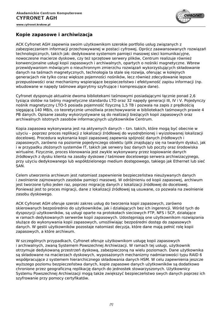 Kopie zapasowe i archiwizacja ACK Cyfronet AGH zapewnia swoim użytkownikom szerokie portfolio usług związanych z zabezpieczaniem informacji przechowywanej w postaci cyfrowej. Oprócz zaawansowanych rozwiązań technologicznych, takich jak: dedykowane systemom pamięci masowej sieci komunikacyjne, nowoczesne macierze dyskowe, czy też sprzętowe serwery plików, Centrum realizuje również konwencjonalne usługi kopii zapasowych i archiwalnych, opartych o nośniki magnetyczne. Wbrew przewidywaniom mówiącym o nieuchronnym zmierzchu rozwiązań wykorzystujących składowanie danych na taśmach magnetycznych, technologia ta stale się rozwija, oferując w kolejnych generacjach nie tylko coraz większe pojemności nośników, lecz również zdecydowanie lepsze przepustowości oraz mechanizmy wspierające bezpieczeństwo i efektywność zapisu informacji (np. wbudowane w napędy taśmowe algorytmy szyfrujące i kompresujące dane). Cyfronet dysponuje aktualnie dwoma bibliotekami taśmowymi posiadającymi łącznie ponad 2,6 tysiąca slotów na taśmy magnetyczne standardu LTO oraz 32 napędy generacji III, IV i V. Pojedynczy nośnik magnetyczny LTO-5 posiada pojemność fizyczną 1,5 TB i pozwala na zapis z prędkością sięgającą 140 MB/s, co teoretycznie umożliwia przechowywanie w bibliotekach taśmowych prawie 4 PB danych. Opisane zasoby wykorzystywane są do realizacji bieżących kopii zapasowych oraz archiwalnych istotnych zasobów informacyjnych użytkowników Centrum. Kopia zapasowa wykonywana jest na aktywnych danych – tzn. takich, które mogą być obecnie w użyciu – poprzez proces replikacji z lokalizacji źródłowej do wyodrębnionej i wyizolowanej lokalizacji docelowej. Procedura wykonania kopii zapasowej zapewnia spójność danych źródłowych i zapasowych, zarówno na poziomie pojedynczego obiektu (plik znajdujący się na twardym dysku), jak i w przypadku złożonych systemów IT, takich jak serwery baz danych lub poczty oraz środowiska wirtualne. Fizycznie, proces klonowania jest zwykle wykonywany przez kopiowanie danych źródłowych z dysku klienta na zasoby dyskowe / taśmowe docelowego serwera archiwizacyjnego, przy użyciu dedykowanego lub współdzielonego medium dostępowego, takiego jak Ethernet lub sieć SAN. Celem utworzenia archiwum jest natomiast zapewnienie bezpieczeństwa nieużywanych danych i zwolnienie zajmowanych zasobów pamięci masowej. W odróżnieniu od kopii zapasowej, archiwum jest tworzone tylko jeden raz, poprzez migrację danych z lokalizacji źródłowej do docelowej. Ponieważ jest to proces migracji, dane z lokalizacji źródłowej są usuwane, co pozwala na zwolnienie zasobu dyskowego. ACK Cyfronet AGH oferuje szeroki zakres usług do tworzenia kopii zapasowych, zarówno skierowanych bezpośrednio do użytkowników, jak i działających bez ich ingerencji. Wśród tych do dyspozycji użytkowników, są usługi oparte na protokołach sieciowych FTP, NFS i SCP, działające w ramach dedykowanych serwerów kopii zapasowych. Udostępniają one użytkownikom rozwiązania służące do wykonywania kopii zapasowych, umożliwiając bezpośredni dostęp do zapasowych danych. W gestii użytkowników pozostaje natomiast decyzja, które dane mają pełnić rolę kopii zapasowych, a które archiwum. W szczególnych przypadkach, Cyfronet oferuje użytkownikom usługę kopii zapasowych i archiwalnych, zwaną Systemem Powszechnej Archiwizacji. W ramach tej usługi, użytkownik otrzymuje dedykowaną przestrzeń dyskową, zabezpieczoną na wielu poziomach. Dane użytkownika są składowane na macierzach dyskowych, wyposażonych mechanizmy nadmiarowości typu RAID 6 współpracujące z systemem hierarchicznego składowania danych HSM. W celu zapewnienia jeszcze wyższego poziomu bezpieczeństwa danych, kopie zapasowe danych użytkowników są dodatkowo chronione przez geograficzną replikację danych do jednostek stowarzyszonych. Użytkownicy Systemu Powszechnej Archiwizacji mogą także zwiększyć bezpieczeństwo swych danych poprzez ich szyfrowanie przy pomocy certyfikatów. [1] Powered by TCPDF (www.tcpdf.org)
