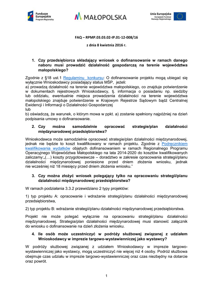 FAQ – RPMP.03.03.02-IP.01-12-008/16 z dnia 8 kwietnia 2016 r. 1. Czy przedsiębiorca składający wniosek o dofinansowanie w ramach danego naboru musi prowadzić działalność gospodarczą na terenie województwa małopolskiego? Zgodnie z §18 ust.1 Regulaminu konkursu: O dofinansowanie projektu mogą ubiegać się wyłącznie Wnioskodawcy posiadający status MŚP, jeżeli: a) prowadzą działalność na terenie województwa małopolskiego, co znajduje potwierdzenie w dokumentach rejestrowych Wnioskodawcy, tj. informacja o posiadaniu np. siedziby lub oddziału, ewentualnie miejsca prowadzenia działalności na terenie województwa małopolskiego znajduje potwierdzenie w Krajowym Rejestrze Sądowym bądź Centralnej Ewidencji i Informacji o Działalności Gospodarczej lub b) oświadczą, że warunek, o którym mowa w ppkt. a) zostanie spełniony najpóźniej na dzień podpisania umowy o dofinansowanie. 2. Czy można samodzielnie opracować międzynarodowej przedsiębiorstwa? strategie/plan działalności Wnioskodawca może samodzielnie opracować strategie/plan działalności międzynarodowej, jednak nie będzie to koszt kwalifikowany w ramach projektu. Zgodnie z Podręcznikiem kwalifikowania wydatków objętych dofinansowaniem w ramach Regionalnego Programu Operacyjnego Województwa Małopolskiego na lata 2014-2020 do kosztów kwalifikowanych zaliczamy:„(…) koszty przygotowawcze – doradztwo w zakresie opracowania strategii/planu działalności międzynarodowej poniesione przed dniem złożenia wniosku, jednak nie wcześniej niż 18 miesięcy przed dniem złożenia wniosku.” 3. Czy można złożyć wniosek polegający tylko na opracowaniu strategii/planu działalności międzynarodowej przedsiębiorstwa? W ramach podziałania 3.3.2 przewidziano 2 typy projektów: 1) typ projektu A: opracowanie i wdrażanie strategii/planu działalności międzynarodowej przedsiębiorstwa, 2) typ projektu B: wdrażanie strategii/planu działalności międzynarodowej przedsiębiorstwa. Projekt nie może polegać wyłącznie na opracowaniu strategii/planu działalności międzynarodowej. Strategia/plan działalności międzynarodowej musi stanowić załącznik do wniosku o dofinansowanie na dzień złożenia wniosku. 4. Ile osób może uczestniczyć w podróży służbowej związanej z udziałem Wnioskodawcy w imprezie targowo-wystawienniczej jako wystawcy? W podróży służbowej związanej z udziałem Wnioskodawcy w imprezie targowowystawienniczej jako wystawcy, mogą uczestniczyć nie więcej niż 4 osoby. Podróż służbowa obejmuje czas udziału w imprezie targowo-wystawienniczej oraz czas niezbędny na dotarcie oraz powrót. 1 5. Jak prawidłowo wykazać wydatki kwalifikowane, w sytuacji, jeśli Beneficjent będzie podróżował klasą biznes (dotyczy biletów lotniczych) lub I klasą (dotyczy biletów kolejowych)? Zgodnie z Podręcznikiem Kwalifikowania Wydatków objętych dofinansowaniem w ramach RPO WM na lata 2014-2020, kosztem kwalifikowanym w ramach podróży służbowej są m.in. bilety lotnicze (kwalifikowalny koszt do wysokości ceny przelotu w klasie ekonomicznej) oraz bilety kolejowe (kwalifikowalny koszt do wysokości ceny przejazdu w II klasie).W przypadku przedstawienia do refundacji biletu lotniczego z klasy biznes, czy też biletu kolejowego z I klasy, w celu właściwego udokumentowania kosztu kwalifikowanego Beneficjent zobowiązany jest do przedstawienia oferty (np. wydruk ze strony internetowej), potwierdzającej cenę biletu klasy ekonomicznej/biletu kolejowego II klasy z dnia zakupu biletów przedstawionych do rozliczenia w ramach projektu. 6. Czy podatek VAT może być kosztem kwalifikowanym w ramach danego poddziałania? Jeśli Wnioskodawca nie ma prawnej możliwości odzyskania podatku VAT w związku z realizacją niniejszego projektu, może zaliczyć podatek VAT do kosztów kwalifikowanych. Wnioskodawca zobowiązany jest do wyjaśnienia w pkt. J.1 wniosku o dofinansowanie czy planuje kwalifikować podatek VAT oraz wskazać dokładną podstawę prawną umożliwiającą uznanie podatku VAT za wydatek kwalifikowany. 7. Kiedy Wnioskodawca może rozpocząć projekt? Projekty, w których wydatki są objęte pomocą publiczną (pomocą na targi/doradztwo) nie mogą się rozpocząć wcześniej niż dzień po dniu złożenia wniosku o dofinansowanie, co wynika z treści §26 ust.1 Regulaminu konkursu. Wydatki w ramach projektów objętych pomocą publiczną tj. pomocą na usługi doradcze i/lub pomocą na udział w targach oraz projekty, dla których wsparcie będzie udzielane poprzez połączenie ww. typów pomocy publicznej oraz pomocy de minimis, są kwalifikowane nie wcześniej niż od dnia następującego po dniu złożenia wniosku o dofinansowanie. Zgodnie z Regulaminem konkursu okres realizacji projektu nie może przekraczać 12 miesięcy. Realizacja projektu nie może rozpocząć się później niż 12 miesięcy od dnia złożenia wniosku. Projekty, w których wydatki są objęte wyłącznie pomocą de minimis mogą rozpoczynać się zarówno przed, jak i po dniu złożenia wniosku (przy zachowaniu zasad, o których poniżej). W ramach projektów objętych pomocą de minimis, wydatki mogą zostać uznane za kwalifikowane, jeśli zostały poniesione nie wcześniej niż 18 miesięcy przed dniem złożenia wniosku o dofinansowanie. Należy jednak pamiętać, że okres realizacji projektu nie może przekraczać 12 miesięcy, a projekt nie może zostać zakończony przed dniem złożenia wniosku o dofinansowanie. W ramach projektów typu A polegających na opracowaniu i wdrażaniu strategii/planu działalności międzynarodowej objętych pomocą de minimis, Wnioskodawca ma możliwość poniesienia kosztów przygotowawczych tj. kosztów doradztwa w zakresie opracowania strategii/planu działalności międzynarodowej do 18 miesięcy przed dniem złożenia wniosku. Opracowania strategii/planu działalności międzynarodowej nie traktuje się jako rozpoczęcia realizacji pro