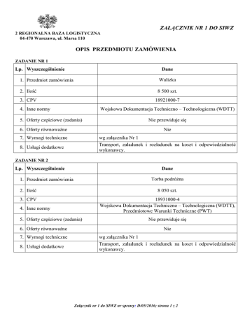 ZAŁĄCZNIK NR 1 DO SIWZ 2 REGIONALNA BAZA LOGISTYCZNA 04-470 Warszawa, ul. Marsa 110 OPIS PRZEDMIOTU ZAMÓWIENIA ZADANIE NR 1 Lp. Wyszczególnienie Dane 1. Przedmiot zamówienia Walizka 2. Ilość 8 500 szt. 3. CPV 18921000-7 4. Inne normy Wojskowa Dokumentacja Techniczno – Technologiczna (WDTT) 5. Oferty częściowe (zadania) Nie przewiduje się 6. Oferty równoważne Nie 7. Wymogi techniczne wg załącznika Nr 1 Transport, załadunek i rozładunek na koszt i odpowiedzialność wykonawcy. 8. Usługi dodatkowe ZADANIE NR 2 Lp. Wyszczególnienie Dane Torba podróżna 1. Przedmiot zamówienia 2. Ilość 8 050 szt. 3. CPV 18931000-4 Wojskowa Dokumentacja Techniczno – Technologiczna (WDTT), Przedmiotowe Warunki Techniczne (PWT) 4. Inne normy 5. Oferty częściowe (zadania) Nie przewiduje się 6. Oferty równoważne Nie 7. Wymogi techniczne wg załącznika Nr 1 Transport, załadunek i rozładunek na koszt i odpowiedzialność wykonawcy. 8. Usługi dodatkowe Załącznik nr 1 do SIWZ nr sprawy: D/05/2016; strona 1 z 2 Załącznik Nr 1 do OPZ Wymagania dla przedmiotów umundurowania i wyekwipowania objętych zamówieniem 1. Przedmiotem zamówienia jest dostawa do Odbiorców wskazanych w „Planie dostaw przedmiotów umundurowania i wyekwipowania w 2016 r.” (załącznik do umowy) przedmiotów umundurowania i wyekwipowania wyszczególnionych w poniższej tabeli, pkt. 9, spełniających wymagania Wojskowych Dokumentacji Techniczno – Technologicznych (WDTT) i zgodnych ze wzorami przedmiotów, obowiązujących w Ministerstwie Obrony Narodowej. 2. Wykonawca dostarczy przedmiot zamówienia wyprodukowany na podstawie WDTT oraz wzorów PUiW potwierdzonych przez Wojskowy Ośrodek Badawczo – Wdrożeniowy Służby Mundurowej (WOBW SM) do produkcji seryjnej (odpowiedni dla danego zadania zamówienia). 3. Wojskowe Dokumentacje Techniczno – Technologiczne wyszczególnione w tabeli pkt 9, kolumna 6, są integralną częścią opisu przedmiotu zamówienia. 4. Wzory przedmiotów dostępne są w WOBW SM w Łodzi 90-613, ul. Gdańska 89, tel. 261 444 269. 5. Na dostarczone przedmioty, Wykonawca udzieli gwarancji na okres 36 miesięcy liczonych od daty podpisania przez Odbiorcę „Protokołu przyjęcia-przekazania”. 6. Wszystkie zadania zamówienia muszą pochodzić z produkcji 2016 roku i być fabrycznie nowe. 7. Poszczególne przedmioty oraz opakowania powinny być znakowane kodami kreskowymi umieszczonymi na etykietach jednostkowych i etykietach opakowań zbiorczych, określonych w Wojskowej Dokumentacji Techniczno – Technologicznej, zgodnie z postanowieniami decyzji nr 3/MON Ministra Obrony Narodowej z dnia 3 stycznia 2014 r. w sprawie wytycznych określających wymagania w zakresie znakowania kodem kreskowym wyrobów dostarczanych do resortu obrony narodowej (Dz. Urz. MON z dnia 7 stycznia 2014 r., poz. 11) oraz przywołanym w jej treści standardem GS1. Specyfikacja generalna GS1 oraz dokumenty pomocnicze dla dostawcy dostępne są na stronach internetowych www.gs1.org i www.gs1pl.org. Jako dokument pomocniczy do SIWZ załączono „Wymagania w zakresie znakowania kodem kreskowym przedmiotów umundurowania i wyekwipowania, odzieży ochronnej i roboczej oraz sprzętu służby mundurowej dostarczanego do resortu obrony narodowej w ramach postepowania o udzielenie zamówienia publicznego” opracowane przez Szefostwo Służby Mundurowej Inspektoratu Wsparcia Sił Zbrojnych. 8. W przypadku wystawiania faktur za dostawy przedmiotu umowy przez poszczególnych członków Konsorcjum, w terminie do 14 dni od dnia podpisania umowy Lider Konsorcjum przedstawi Zamawiającemu harmonogram dostaw realizowanych przez poszczególnych członków Konsorcjum z wyszczególnieniem ilości i wartości oraz rozmiarów. 9. Wykaz przedmiotów umundurowania i wyekwipowania: Nr zadania 1 Ilość zamówienia 4 Nazwa przedmiotu zamówienia Jm. Kod CPV Nr WDTT 2 3 5 6 1 Walizka szt. 8 500 18921000-7 WDTT 974/MON 2 Torba podróżna szt. 8 050 18931000-4 WDTT 968A/MON 1 Przedmioty zamówienia, wyszczególnione w powyższej tabeli, opisane są dodatkowo poprzez przywołane w odpowiedniej Wojskowej Dokumentacji Techniczno – Technologicznej (WDTT) wymagania określone w poniższych Przedmiotowych Warunkach Technicznych (PWT) dla materiałów zasadniczych i dodatków: 1. PWT 23:2008 Przedmioty umundurowania i wyekwipowania. Tkaniny na oporządzenie. Tkaniny poliestrowe. Załącznik nr 1 do SIWZ nr sprawy: D/05/2016; strona 2 z 2