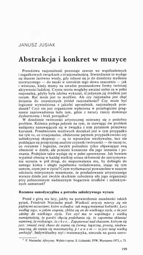 JANUSZ JUSIAK A bstrakcja i konkret w m uzyce Praw dziw a racjonalność pozostaje zawsze we współzależnych i zagadkow ych zw iązkach z irracjonalnością. Stw ierdzenie to wydaje się słuszne zarów no wtedy, gdy odnosi się je do dziedziny myślenia teoretycznego — do nauki w szerokim tego słowa znaczeniu — ja k i wówczas, kiedy m am y na uw adze pozanaukow e form y twórczej aktyw ności ludzkiej. C zysta teoria m ogłaby uw ażać siebie za w pełni racjonalną, gdyby była zdolna w ykazać, iż jedynym jej źródłem jest rozum . Być m oże jest to możliwe. Ale czy racjonalna je st chęć d o tarcia do ostatecznych źródeł racjonalności? Czy m oże być logicznie wywiedziona z jak ich ś uprzednich, racjonalnych prze słanek? Czyż nie je st organicznie w pleciona w pozalogiczne p ra g nienie zaprow adzenia ładu tam , gdzie z natu ry rzeczy dom inuje d y sh arm onia i brak porządku? W dziedzinie twórczości artystycznej ocieram y się o podobny problem . R óżnica polega jedynie na tym , że staw iając ów problem nadajem y nasuw ającym się w zw iązku z nim pytaniom przeciwny kierunek. Przedm iotem m ożliwych dociekań jest w tym przypadku nie tyle to, co irracjonalne, o bdarzone piętnem przypadkow ości czy subiektywnej ekspresji — są to w praw dzie niezbyw alne, lecz nie poddające się przejrzystej analizie czynniki tw órczości — ile raczej to, co rozum ne i logiczne, zwykle pośrednio tylko objaw iające swą obecność w dziele, ale przecież konieczne dla jego istnienia i p o znania. Podejście takie wydaje się w pełni upraw nione. Jak bowiem wyjaśnić obecną w każdej wielkiej sztuce skłonność do zatrzym yw a nia uczucia w pół drogi, do niepozw alania m u, by dobiegło do sam ego końca i uległo zupełnem u rozładow aniu, stając się tym sam ym , czym jest w życiu? Czym wytłum aczyć powszechne w naszym odczuciu estetycznym m niem anie, że przeładow anie artystycznego wyrazu dzieła jest zwykle skutkiem zubożenia siły jego organizacji przy jednoczesnym nadm iernym bogactw ie środków i subiektyw nych zamierzeń? Rozumna sam odyscyplina a potrzeba subiektywnego wyrazu Przed z górą stu laty, ja k b y na potw ierdzenie zasadności takich pytań, F riedrich N ietzsche pisał: W ielkość artysty m ierzy się nie p iękn ym i uczuciami, które wzbudza: tak mogą m niem ać kobietki. Lecz według tego, w ja k im stopniu, zbliża się on do wielkiego stylu, o ile je s t zdolny do wielkiego stylu. Ten styl ma to wspólnego z wielką namiętnością, że gardzi chęcią podobania się, że zapomina skłaniać namową, że rozkazuje; że c h c e ... Zapanować nad chaosem, którym się je st; zmusić swój chaos do stania się fo rm ą : logiczną, prostą, niedwu znaczną, do stania się m atem atyką, p r a w e m — to je s t tutaj wielką am bicją1. Indyw idualny styl i m atem atyka, nieczuła na gusta szero1 F. Nietzsche: Aforyzmy. W ybór i oprać. S. Lichański. PIW, Warszawa 1973, s. 75. 199 kiej publiczności nam iętność tw orzenia i w ew nętrzny logos obiek tywizujący się w oderwanej od zm ysłowości form ie. C hyba jedynie sztuka k o m p o n ow ania m uzyki obrazuje w pełni n atu rę związków zachodzących m iędzy dw om a tym i sposobam i przejaw iania się ludzkich m ożliwości tw órczych. F orm ow anie dzieła m uzycznego jest bowiem ciągiem oderw anych od rzeczywistości empirycznej decyzji, m ających na Celu przekształcenie nieokreślonej m aterii dźwięków w ydaw anych przez poszczególne instrum enty, głosy ludzkie lub n atu rę w abstrakcyjny zespół sym bolizujących je znaków , odbijający n ad rzęd n ą ideę dzieła, ową — ja k pow iada Hegel — „najgłębszą po d m io to w ą w ew nętrzność ja k o ta k ą ” 2, bez której m uzyka p o zbaw iona byłaby elem entu osobistej wypowiedzi. W procesie tym dwie rzeczy są szczególnie ważne. Z jednej strony, rodzący się w w yobraźni u tw ór m uzyczny pozostaw ia kom pozytorow i dużą sw obodę, gdy chodzi o m ożliw ość kształtow ania jego form y, m elo dyki, sposobu rozw ijania tem atów czy w yboru m ateriału dźw ięko wego. Z arazem je d n a k jego właściwe, zgodne z pow ziętą ideą, uform ow anie w ym aga zachow ania wewnętrznej dyscypliny twórczej — pod groźbą niem ożności w ykreow ania w artościow ego artystycz nie w yrazu dzieła. D latego m om ent racjonalno-abstrakcyjny jest w m uzycznym procesie tw órczym ściśle zespolony z m om entem subiektyw no-uczuciow ym i zm ysłowym , pom im o tendencji każdego z nich do łatw ego usam odzielniania się i do bytow ania — pierwszy — w dziedzinie czystej myśli, drugi — w niekom unikow alnej innym ludziom bezpośredniości tego, co konkretne. O koliczność ta spraw ia, że choć zasadniczym celem m uzyki jest — ja k się zwykło sądzić — oddziaływ anie n a em ocjonalną w arstw ę psychiki, realizacja tego zam ierzenia pociągać za sobą m usi niezbęd ność urzeczyw istnienia rów nież innych zadań, w ykraczających poza to pierw otne zam ierzenie. D o b ra m uzyka porusza zarów no nasze uczucia, ja k i wrażliwość intelektualną. K reuje sobie tylko właściwe nastroje i napięcia, ale czynić tak m oże dlatego, że respektuje obiektyw ne praw a harm onii, sym etrii i regularnej pow tarzalności. F a k t ów wydaje się najważniejszym czynnikiem w spółokreślającym n atu rę procesu jej tw orzenia. W komponowaniu rozstrzyga u mnie — wyznaje w swojej Harmonielehre A rnold Schónberg — jedynie wyczucie, wyczucie fo r m y . Ono m i mówi, co mam pisać, w szystko inne je s t nieważne. Każdy akord, który kładę, odpowiada pew nem u celowi — zapewne celowi mej potrzeby wyrazu, ale także i celowi nieub łaganej, choć nieświadomej logiki w harmonicznej konstrukcji. Twór czość artysty je s t gorączkow ym poszukiw aniem . Udział świadomości je s t tu niewielki. Po to ma on uczucie, żeby mu dyktow ało, co czynić. C zyn