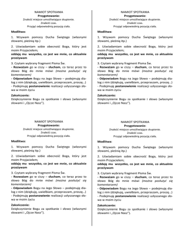 NAMIOT SPOTKANIA Przygotowanie: NAMIOT SPOTKANIA Przygotowanie: Znaleźć miejsce umożliwiające skupienie. Znaleźć czas. Przyjąć odpowiednią pozycję ciała. Znaleźć miejsce umożliwiające skupienie. Znaleźć czas. Przyjąć odpowiednią pozycję ciała. Modlitwa: Modlitwa: 1. Wzywam pomocy Ducha Świętego (własnymi słowami, pieśnią itp.) 1. Wzywam pomocy Ducha Świętego (własnymi słowami, pieśnią itp.) 2. Uświadamiam sobie obecność Boga, który jest moim Przyjacielem; oddaję mu wszystko, co jest we mnie, co aktualnie przeżywam 2. Uświadamiam sobie obecność Boga, który jest moim Przyjacielem; oddaję mu wszystko, co jest we mnie, co aktualnie przeżywam 3. Czytam wybrany fragment Pisma Św. - Rozważam go w ciszy – słucham, co teraz przez to słowo Bóg do mnie mówi (można posłużyć się komentarzem) - Odpowiadam Bogu na Jego Słowo – podejmuję dialog z nim (dziękuję, uwielbiam, przepraszam, proszę…) - Podejmuję postanowienie realizacji usłyszanego słowa w moim życiu 3. Czytam wybrany fragment Pisma Św. - Rozważam go w ciszy – słucham, co teraz przez to słowo Bóg do mnie mówi (można posłużyć się komentarzem) - Odpowiadam Bogu na Jego Słowo – podejmuję dialog z nim (dziękuję, uwielbiam, przepraszam, proszę…) - Podejmuję postanowienie realizacji usłyszanego słowa w moim życiu Zakończenie: Dziękczynienie Bogu za spotkanie i słowo (własnymi słowami i „Ojcze Nasz”). Zakończenie: Dziękczynienie Bogu za spotkanie i słowo (własnymi słowami i „Ojcze Nasz”). NAMIOT SPOTKANIA Przygotowanie: NAMIOT SPOTKANIA Przygotowanie: Znaleźć miejsce umożliwiające skupienie. Znaleźć czas. Przyjąć odpowiednią pozycję ciała. Znaleźć miejsce umożliwiające skupienie. Znaleźć czas. Przyjąć odpowiednią pozycję ciała. Modlitwa: Modlitwa: 1. Wzywam pomocy Ducha Świętego (własnymi słowami, pieśnią itp.) 1. Wzywam pomocy Ducha Świętego (własnymi słowami, pieśnią itp.) 2. Uświadamiam sobie obecność Boga, który jest moim Przyjacielem; oddaję mu wszystko, co jest we mnie, co aktualnie przeżywam 2. Uświadamiam sobie obecność Boga, który jest moim Przyjacielem; oddaję mu wszystko, co jest we mnie, co aktualnie przeżywam 3. Czytam wybrany fragment Pisma Św. - Rozważam go w ciszy – słucham, co teraz przez to słowo Bóg do mnie mówi (można posłużyć się komentarzem) - Odpowiadam Bogu na Jego Słowo – podejmuję dialog z nim (dziękuję, uwielbiam, przepraszam, proszę…) - Podejmuję postanowienie realizacji usłyszanego słowa w moim życiu 3. Czytam wybrany fragment Pisma Św. - Rozważam go w ciszy – słucham, co teraz przez to słowo Bóg do mnie mówi (można posłużyć się komentarzem) - Odpowiadam Bogu na Jego Słowo – podejmuję dialog z nim (dziękuję, uwielbiam, przepraszam, proszę…) - Podejmuję postanowienie realizacji usłyszanego słowa w moim życiu Zakończenie: Dziękczynienie Bogu za spotkanie i słowo (własnymi słowami i „Ojcze Nasz”). Zakończenie: Dziękczynienie Bogu za spotkanie i słowo (własnymi słowami i „Ojcze Nasz”).