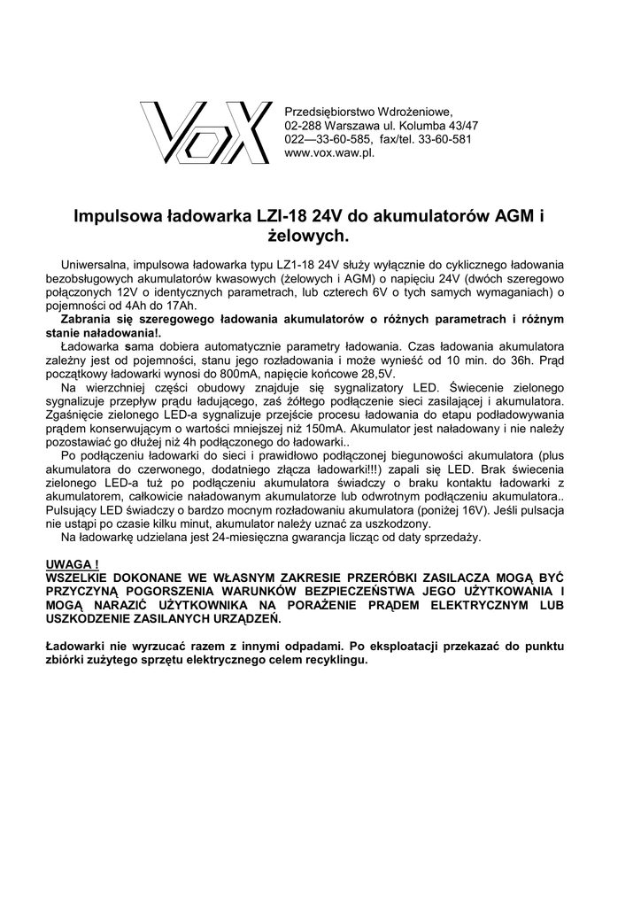 Przedsiębiorstwo WdroŜeniowe, 02-288 Warszawa ul. Kolumba 43/47 022—33-60-585, fax/tel. 33-60-581 www.vox.waw.pl. Impulsowa ładowarka LZI-18 24V do akumulatorów AGM i Ŝelowych. Uniwersalna, impulsowa ładowarka typu LZ1-18 24V słuŜy wyłącznie do cyklicznego ładowania bezobsługowych akumulatorów kwasowych (Ŝelowych i AGM) o napięciu 24V (dwóch szeregowo połączonych 12V o identycznych parametrach, lub czterech 6V o tych samych wymaganiach) o pojemności od 4Ah do 17Ah. Zabrania się szeregowego ładowania akumulatorów o róŜnych parametrach i róŜnym stanie naładowania!. Ładowarka sama dobiera automatycznie parametry ładowania. Czas ładowania akumulatora zaleŜny jest od pojemności, stanu jego rozładowania i moŜe wynieść od 10 min. do 36h. Prąd początkowy ładowarki wynosi do 800mA, napięcie końcowe 28,5V. Na wierzchniej części obudowy znajduje się sygnalizatory LED. Świecenie zielonego sygnalizuje przepływ prądu ładującego, zaś Ŝółtego podłączenie sieci zasilającej i akumulatora. Zgaśnięcie zielonego LED-a sygnalizuje przejście procesu ładowania do etapu podładowywania prądem konserwującym o wartości mniejszej niŜ 150mA. Akumulator jest naładowany i nie naleŜy pozostawiać go dłuŜej niŜ 4h podłączonego do ładowarki.. Po podłączeniu ładowarki do sieci i prawidłowo podłączonej biegunowości akumulatora (plus akumulatora do czerwonego, dodatniego złącza ładowarki!!!) zapali się LED. Brak świecenia zielonego LED-a tuŜ po podłączeniu akumulatora świadczy o braku kontaktu ładowarki z akumulatorem, całkowicie naładowanym akumulatorze lub odwrotnym podłączeniu akumulatora.. Pulsujący LED świadczy o bardzo mocnym rozładowaniu akumulatora (poniŜej 16V). Jeśli pulsacja nie ustąpi po czasie kilku minut, akumulator naleŜy uznać za uszkodzony. Na ładowarkę udzielana jest 24-miesięczna gwarancja licząc od daty sprzedaŜy. UWAGA ! WSZELKIE DOKONANE WE WŁASNYM ZAKRESIE PRZERÓBKI ZASILACZA MOGĄ BYĆ PRZYCZYNĄ POGORSZENIA WARUNKÓW BEZPIECZEŃSTWA JEGO UśYTKOWANIA I MOGĄ NARAZIĆ UśYTKOWNIKA NA PORAśENIE PRĄDEM ELEKTRYCZNYM LUB USZKODZENIE ZASILANYCH URZĄDZEŃ. Ładowarki nie wyrzucać razem z innymi odpadami. Po eksploatacji przekazać do punktu zbiórki zuŜytego sprzętu elektrycznego celem recyklingu.