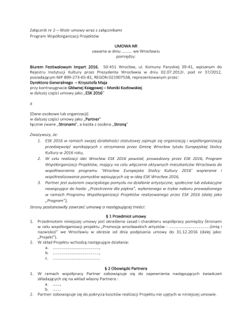 Załącznik nr 2 – Wzór umowy wraz z załącznikami Program Współorganizacji Projektów UMOWA NR zawarta w dniu ………. we Wrocławiu pomiędzy: Biurem Festiwalowym Impart 2016, 50-451 Wrocław, ul. Komuny Paryskiej 39-41, wpisanym do Rejestru Instytucji Kultury przez Prezydenta Wrocławia w dniu 02.07.2012r. pod nr 37/2012, posiadającym NIP 899-273-65-81, REGON 021907538, reprezentowanym przez: Dyrektora Generalnego – Krzysztofa Maja przy kontrasygnacie Głównej Księgowej – Moniki Kozłowskiej w dalszej części umowy jako „ESK 2016” a [Dane osobowe lub organizacji] w dalszej części umowy jako „Partner” łącznie zwane „Stronami”, a każda z osobna „Stroną” Zważywszy, że: 1. ESK 2016 w ramach swojej działalności statutowej zajmuje się organizacją i współorganizacją przedsięwzięć wynikających z otrzymania przez Gminę Wrocław tytułu Europejskiej Stolicy Kultury w 2016 roku, 2. W celu realizacji idei Wrocław ESK 2016 powstał, prowadzony przez ESK 2016, Program Współorganizacji Projektów, mający na celu włączenie aktywnych mieszkańców Wrocławia do współtworzenia programu ‘Wrocław Europejska Stolicy Kultury 2016’ wspieranie i współrealizowanie pomysłów wpisujących się w ideę ESK Wrocław 2016, 3. Partner jest autorem zwycięskiego pomysłu na działanie artystyczne, społeczne lub edukacyjne nawiązujące do hasła: „Przestrzenie dla piękna”, wyłonionego w trybie naboru prowadzonego w ramach Programu Współorganizacji Projektów realizowanego przez ESK 2016 (dalej jako „Program”), Strony postanowiły zawrzeć umowę o następującej treści: § 1 Przedmiot umowy 1. Przedmiotem niniejszej umowy jest określenie zasad i charakteru współpracy pomiędzy Stronami w celu współorganizacji projektu „Promocja wrocławskich artystów - …………………………………(imię i nazwisko)” we Wrocławiu w okresie od dnia podpisania umowy do 31.12.2016 (dalej jako: „Projekt”). 2. W skład Projektu wchodzą następujące działania: a. …………………………………….., b. …………………………………….., c. ……………………………………… § 2 Obowiązki Partnera 1. W ramach współpracy Partner zobowiązuje się do zapewnienia następujących świadczeń składających się na wkład własny Partnera : a. ……., b. …….. 2. Partner zobowiązuje się do pokrycia kosztów realizacji Projektu nie ujętych w niniejszej umowie. 3. Partner nie będzie występował z wnioskiem do Urzędu Miasta Wrocław o dofinansowanie Projektu. 4. Jeśli wykonanie któregokolwiek ze zobowiązań ESK 2016 będzie wymagało dostarczenia przez Partnera określonych dzieł lub informacji, Partner zobowiązuje się dostarczyć je w terminie umożliwiającym ESK 2016 wykonanie zobowiązania. W przeciwnym razie ESK 2016 nie ponosi odpowiedzialności za niewykonanie zobowiązania. 5. Partner zobowiązuje się używać logotypu Programu we wszelkich materiałach wizualnych i audiowizualnych Projektu zgodnie z Ramą promocyjną Programu. Użycie logotypu Programu musi zostać każdorazowo zaakceptowane przez ESK 2016 przed opublikowaniem materiałów wizualnych i audiowizualnych Projektu. § 3 Obowiązki ESK 2016 1. W ramach współpracy ESK 2016 zobowiązuje się dopokrycia kosztów realizacji Projektu do wysokości 5000,00 zł brutto (słownie: pięć tysięcy złotych), na podstawie umów zawieranych przez ESK 2016, na co składa się: i. …………………………………….., ii. …………………………………….., iii. …………………………………….., iv. bezpłatny kolportaż ………………………. podczas wydarzeń organizowanych i współorganizowanych przez ESK 2016 w okresie od 01.01.2016 do 31.12.2016 wśród gości, dziennikarzy, wolontariuszy i pozostałych uczestników wydarzeń. 2. ESK 2016 dostarczy Partnerowi wszelkie towary, usługi i dzieła powstałe w wyniku realizacji zobowiązań określonych w ust. 1 lit. a punkty ……. powyżej w terminach uzgodnionych z Partnerem i umożliwiających Partnerowi wykonanie swoich zobowiązań. 3. Do dnia ……… ESK 2016 dostarczy Partnerowi logotyp Programu w celu realizacji przez Partnera zobowiązania, o którym mowa w § 2 ust. 4 i 5 umowy. § 4 Obowiązki wspólne Stron 1. Strony niniejszej umowy zobowiązują się do uzyskania wszelkich licencji, zezwoleń upoważnień i zaświadczeń od stosownych władz zgodnie z przepisami prawa i innymi zarządzeniami, związanych z organizacją Projektu i niezbędnych dla podejmowanych przez nie działań. 2. W zakresie niezbędnym do wykonania zobowiązań wynikających z niniejszej umowy Strony udzielają sobie wszelkich zgód i zezwoleń na korzystanie z ich oznaczeń, logo i stworzonych przez nie materiałów dotyczących Projektu. 3. Strony zobowiązują się do promowania Projektu poprzez dostępne im media własne: strony internetowe, media społecznościowe, wydawnictwa. § 5 Finansowanie Projektu 1. ESK 2016 zobowiązuje się do partycypowania w kosztach realizacji Projektu w łącznej maksymalnej kwocie 5100,00 zł brutto, co obejmuje wkład finansowy ESK 2016 w Projekt w postaci wynagrodzenia Partnera w wysokości ………………………. zł brutto (słownie: …………………………..), a także wartość świadczeń wskazanych w § 3 ust. 1 lit. ………... powyżej w wysokości …………… zł brutto (słownie: …………………………..) oraz wartość świadczeń wskazanych w §4 ust. 2 i 3 w wysokości 100,00 zł brutto (słownie: sto złotych). 2. Partner zobowiązuje się pokryć koszty realizacji Projektu przewyższające kwotę 5100,00 zł brutto, w szczególności Partner zobowiązuje się do pokrycia kosztów świadczeń wskazanych w §2 ust. 1 lit. ……. i partycypowania w kosztach realizacji promocji Projektu w łącznej kwocie ………………….. zł brutto (słownie: ……………. złotych), co