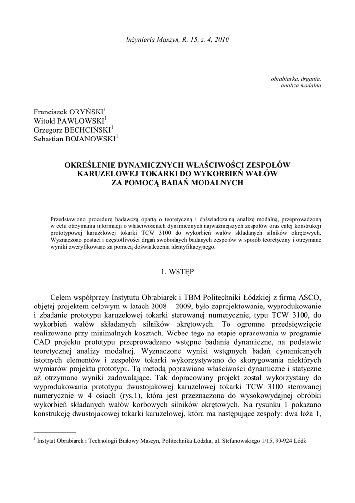 InŜynieria Maszyn, R. 15, z. 4, 2010 obrabiarka, drgania, analiza modalna Franciszek ORYŃSKI1 Witold PAWŁOWSKI1 Grzegorz BECHCIŃSKI1 Sebastian BOJANOWSKI1 OKREŚLENIE DYNAMICZNYCH WŁAŚCIWOŚCI ZESPOŁÓW KARUZELOWEJ TOKARKI DO WYKORBIEŃ WAŁÓW ZA POMOCĄ BADAŃ MODALNYCH Przedstawiono procedurę badawczą opartą o teoretyczną i doświadczalną analizę modalną, przeprowadzoną w celu otrzymania informacji o właściwościach dynamicznych najwaŜniejszych zespołów oraz całej konstrukcji prototypowej karuzelowej tokarki TCW 3100 do wykorbień wałów składanych silników okrętowych. Wyznaczono postaci i częstotliwości drgań swobodnych badanych zespołów w sposób teoretyczny i otrzymane wyniki zweryfikowano za pomocą doświadczenia identyfikacyjnego. 1. WSTĘP Celem współpracy Instytutu Obrabiarek i TBM Politechniki Łódzkiej z firmą ASCO, objętej projektem celowym w latach 2008 – 2009, było zaprojektowanie, wyprodukowanie i zbadanie prototypu karuzelowej tokarki sterowanej numerycznie, typu TCW 3100, do wykorbień wałów składanych silników okrętowych. To ogromne przedsięwzięcie realizowano przy minimalnych kosztach. Wobec tego na etapie opracowania w programie CAD projektu prototypu przeprowadzano wstępne badania dynamiczne, na podstawie teoretycznej analizy modalnej. Wyznaczone wyniki wstępnych badań dynamicznych istotnych elementów i zespołów tokarki wykorzystywano do skorygowania niektórych wymiarów projektu prototypu. Tą metodą poprawiano właściwości dynamiczne i statyczne aŜ otrzymano wyniki zadowalające. Tak dopracowany projekt został wykorzystany do wyprodukowania prototypu dwustojakowej karuzelowej tokarki TCW 3100 sterowanej numerycznie w 4 osiach (rys.1), która jest przeznaczona do wysokowydajnej obróbki wykorbień składanych wałów korbowych silników okrętowych. Na rysunku 1 pokazano konstrukcję dwustojakowej tokarki karuzelowej, która ma następujące zespoły: dwa łoŜa 1, _____________ 1 Instytut Obrabiarek i Technologii Budowy Maszyn, Politechnika Łódzka, ul. Stefanowskiego 1/15, 90-924 Łódź Określenie dynamicznych właściwości zespołów karuzelowej tokarki do wykorbień wałów za pomocą badań … 31 dwa suporty poziome 2 i dwa suporty pionowe 4, dwie kolumny 3, belkę poprzeczną 5, tokarską głowicę narzędziową przechylną 6 oraz stół obrotowy 7. Rys. 1. Karuzelowa tokarka sterowana numerycznie TCW 3100 1- łoŜe, 2- suport poziomy, 3- kolumna, 4- suport pionowy, 5- belka poprzeczna, 6- tokarska głowica narzędziowa przechylna, 7- stół obrotowy, 8- element obrabiany Fig. 1. The CNC vertical lathe TCW 3100 1- bed, 2- horizontal slide, 3- column, 4- vertical slide, 5- transverse beam, 6- toolhead, 7- rotary table, 8- workpiece ŁoŜa osadzone są na fundamencie. Na górnych powierzchniach łóŜ są zamocowane po dwie prowadnice szynowe kulkowe. Po prowadnicach przesuwają się cztery wózki prowadzące, na których jest zamontowany suport poziomy wraz z kolumną (rys. 2). W celu zwiększenia sztywności i odporności na drgania korpusy łóŜ i kolumn są wewnątrz gęsto Ŝebrowane. Kolumny otrzymują ruch od dwóch zsynchronizowanych ze sobą napędów sterowanych numerycznie CNC. Napęd kaŜdej kolumny (napęd osi X i Z) składa się z: silnika, przekładni planetarnej, sprzęgła i śruby tocznej. Kolumny są wyposaŜone w dwie prowadnice szynowe kulkowe, po których przesuwają się wózki suportu pionowego, do których przymocowana jest pozioma belka poprzeczna. Suporty pionowe i belka poprzeczna otrzymują ruch od dwóch zsynchronizowanych napędów sterowanych numerycznie CNC. 32 Franciszek ORYŃSKI, Witold PAWŁOWSKI, Grzegorz BECHCIŃSKI, Sebastian BOJANOWSKI Ruchy belki poprzecznej w obu kierunkach osi X i Z są ograniczone wyłącznikami krańcowymi. Prawe łoŜe wraz z kolumną i napędami przedstawiono na rys. 3. Rys. 2. Zdjęcie od góry prawego łoŜa i napędu kolumny Fig. 2. Top view of the right bed and column drive W środkowej części belki zamocowano przechylną głowicę narzędziową (rys. 4), która umoŜliwia ruch obrotowy narzędzia w zakresie ±90o. Napęd głowicy narzędziowej ma: silnik, przekładnię harmoniczną oraz enkoder kątowy absolutny. Stół obrotowy o średnicy 3100 mm przeznaczony do mocowania obrabianego przedmiotu za pomocą wymiennych przyrządów obróbczych – palet, jest umieszczony na fundamencie symetrycznie względem łóŜ. Zaprojektowany, wyprodukowany i przebadany prototyp tokarki sterowanej numerycznie TCW 3100 zainstalowano w Hucie Celsa w Ostrowcu Świętokrzyskim, która jest światowym producentem wałów korbowych silników okrętowych. To wdroŜenie przyczyniło się do uzyskania wymiernych korzyści ekonomicznych. Wskutek tego czas obróbki jednego elementu wykorbienia z 40 godzin zmniejszono do 9 godzin. Określenie dynamicznych właściwości zespołów karuzelowej tokarki do wykorbień wałów za pomocą badań … Rys. 3. Zdjęcie boczne prawego łoŜa z kolumną i napędami Fig. 3. Side view of the right bed with column and drives Rys. 4. Przechylna głowica narzędziowa Fig. 4. The swivel toolhead 33 34 Franciszek ORYŃSKI, Witold PAWŁOWSKI, Grzegorz BECHCIŃSKI, Sebastian BOJANOWSKI W celu zweryfikowania wstępnych badań dynamicznych karuzelowej tokarki TCW 3100 do wykorbień wałów składanych silników okrętowych wykonano doświadczalną analizę modalną i powtórzono analizę teoretyczną ostatecznej wersji prototypu. Te badania stosowane miały na celu określenie rzeczywistych postaci oraz częstotliwości drgań swobodnych zespołów tokarki. Wyznaczone wartości moŜna wykorzystać do właściwego doboru parametrów obróbki skrawaniem oraz cyklu obróbki, aby uniknąć pracy w dynamicznie niestabilnym zakresie pracy maszyny, a przez to otrzymać moŜliwie najlepszy wynik obróbki. 2. CEL I WARUNKI BADAŃ Badania dynamicznych charakterystyk amplitudowych były prowadzone w celu wyznaczenia postaci drgań swob