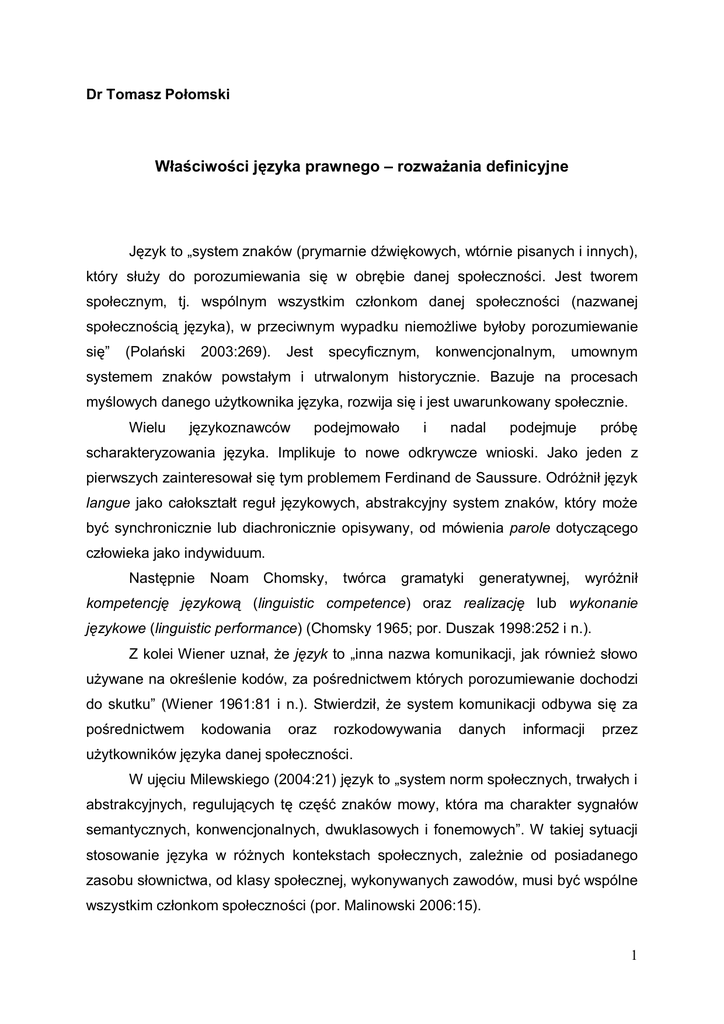 Dr Tomasz Połomski Właściwości języka prawnego – rozważania definicyjne Język to „system znaków (prymarnie dźwiękowych, wtórnie pisanych i innych), który służy do porozumiewania się w obrębie danej społeczności. Jest tworem społecznym, tj. wspólnym wszystkim członkom danej społeczności (nazwanej społecznością języka), w przeciwnym wypadku niemożliwe byłoby porozumiewanie się” (Polański 2003:269). Jest specyficznym, konwencjonalnym, umownym systemem znaków powstałym i utrwalonym historycznie. Bazuje na procesach myślowych danego użytkownika języka, rozwija się i jest uwarunkowany społecznie. Wielu językoznawców podejmowało i nadal podejmuje próbę scharakteryzowania języka. Implikuje to nowe odkrywcze wnioski. Jako jeden z pierwszych zainteresował się tym problemem Ferdinand de Saussure. Odróżnił język langue jako całokształt reguł językowych, abstrakcyjny system znaków, który może być synchronicznie lub diachronicznie opisywany, od mówienia parole dotyczącego człowieka jako indywiduum. Następnie Noam Chomsky, twórca gramatyki generatywnej, wyróżnił kompetencję językową (linguistic competence) oraz realizację lub wykonanie językowe (linguistic performance) (Chomsky 1965; por. Duszak 1998:252 i n.). Z kolei Wiener uznał, że język to „inna nazwa komunikacji, jak również słowo używane na określenie kodów, za pośrednictwem których porozumiewanie dochodzi do skutku” (Wiener 1961:81 i n.). Stwierdził, że system komunikacji odbywa się za pośrednictwem kodowania oraz rozkodowywania danych informacji przez użytkowników języka danej społeczności. W ujęciu Milewskiego (2004:21) język to „system norm społecznych, trwałych i abstrakcyjnych, regulujących tę część znaków mowy, która ma charakter sygnałów semantycznych, konwencjonalnych, dwuklasowych i fonemowych”. W takiej sytuacji stosowanie języka w różnych kontekstach społecznych, zależnie od posiadanego zasobu słownictwa, od klasy społecznej, wykonywanych zawodów, musi być wspólne wszystkim członkom społeczności (por. Malinowski 2006:15). 1 W najnowszym ujęciu językoznawczym język „definiuje się jako zbiór dostępnych dla użytkowników języka środków służących symbolizacji myśli i komunikacji tych symbolizacji” (Taylor 2007:36). Zatem artykułowanie myśli odbywa się za pomocą języka przy zastosowaniu materiału leksykalnego oraz określonych struktur morfologiczno-semantycznych, których dostarcza ten język, zależnie od celu i toku prowadzonej rozmowy. Ma on charakter symboliczny. Wykorzystując powyższe rozważania, można pokusić się o dokonanie charakterystyki języka stosowanego w tekstach prawnych. Rozróżniamy: a) Język prawny, w którym sformułowane są ustawy, rozporządzenia zarządzenia, statuty itp. Jest to język prawodawcy, który formułuje akty normatywne. Nazywamy go zatem idiolektem prawodawczym; b) Język prawniczy, w którym sporządzane są orzeczenia sądowe, decyzje administracyjne. Prawnicy używają go do interpretacji norm prawnych. (Gizbert-Studnicki 1986:33 i n.; Malinowska 2001:13). Język prawny może być uznawany za rodzaj języka etnicznego w tym sensie, że jest to język, którego używają członkowie danej społeczności i wspólnoty językowej. Pojęcie wspólnoty językowej rozumiane jest bardzo szeroko. Określa zawsze grupę osób, która pozostaje w stałym kontakcie językowym ze sobą i stosuje dany język, zrozumiały dla tej grupy (Gizbert-Studnicki 1986:38), czyli język naturalny, który ukształtował się wewnątrz jakiegoś społeczeństwa etnicznego i język, w pewnym sensie sztuczny, który kreowany jest przez pewną grupę ludzi. Grupa ta jest odgraniczona od reszty społeczeństwa (Gizbert-Studnicki 1986:36). W przypadku języka prawnego należą do niej prawnicy i prawodawcy, którzy kształtują hermetyczną terminologię prawa, przeznaczoną przede wszystkim dla pewnej grupy docelowej, do której zaliczają się oni sami, jak również osoby z kręgów zainteresowanych prawoznawstwem. Można zatem uznać, że „język prawny jest odmianą wyznaczoną sytuacyjnie” (Gizbert-Studnicki 1986:42), tzn. że „(…) poszczególne właściwości językowe tekstów prawnych wyznaczane są przez cechy sytuacji społecznych, w których teksty prawne funkcjonują jako narzędzia komunikacji językowej” (Ibidem). Z kolei Andrzej Malinowski (2006:21 i 23) język prawny nazywa „językiem rodzajowym (generycznym), specjalistycznym (technolektem)”. Używany jest przez określone grupy społeczne w różnym wieku i wykonujących rożne zawody. 2 Malinowski odnosi język rodzajowy do języka powszechnego. Język rodzajowy odróżniają słowa i wyrażenia niespotykane w języku powszechnym, których znaczenia, reguły składniowe wyrażeń złożonych są zupełnie inne niż w języku powszechnym (Malinowski 2006:22). Podobną teorię na temat języka prawnego ma Jerzy Pieńkos (1999:71), uznając go za specjalistyczny „podsystem języka etnicznego, podsystem, którego słownictwo, kolokacje, frazeologia tworzą wspólną całość”. Do cech charakterystycznych języka specjalistycznego, jakim jest język prawny należą między innymi: precyzyjność, depersonalizacja autora wypowiedzi, przewaga terminów rzeczownikowych (ich zadaniem jest nazywanie, czyli porządkowanie świata), ścisły związek pomiędzy pojęciem a jego nazwą (Malinowski 2006:23). Język prawa z punktu widzenia wiedzy na jego temat należy do metajęzyków specjalistycznych. Odnosi się do grupy docelowej prawników i prawodawców, ale cechuje się szerokim zasięgiem użycia. Zachowuje wszystkie właściwości gramatyczne i leksykalno-fonologiczne języka ogólnego. Powinien być jasny i zrozumiały dla przeciętnego odbiorcy. Musi być przystępny i komunikatywny (por. Luttermann 2001:160 i 171). „Przeciętny obywatel nie ma przygotowania do udziału w komunikacji w