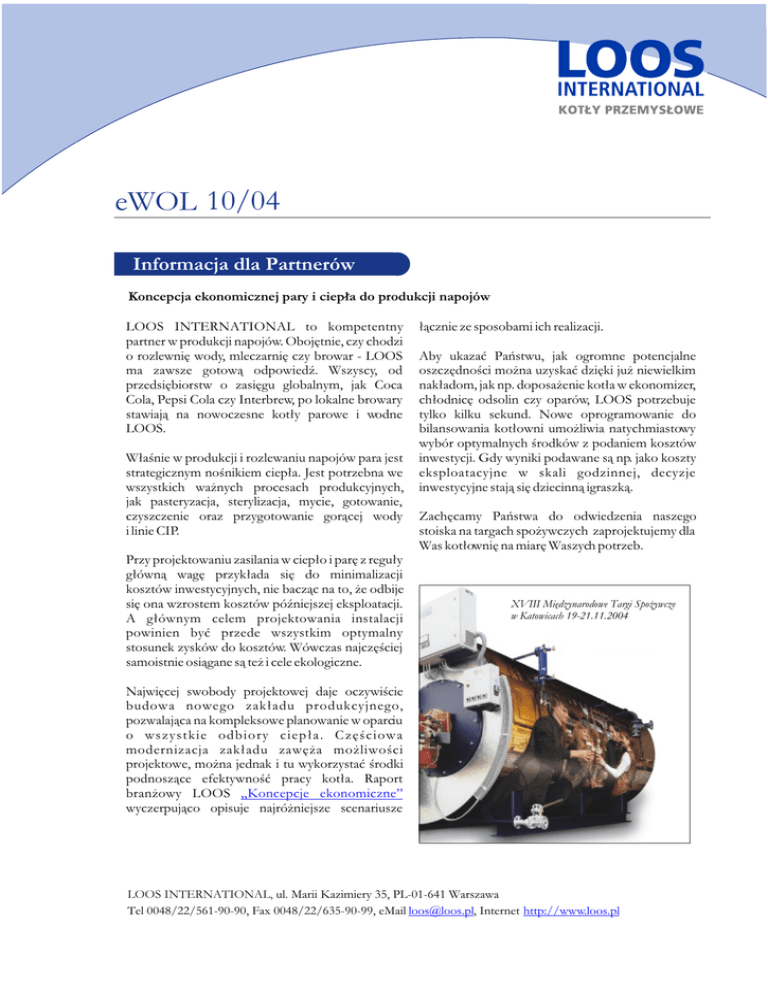 eWOL 10/04 Informacja dla Partnerów Koncepcja ekonomicznej pary i ciep³a do produkcji napojów LOOS INTERNATIONAL to kompetentny partner w produkcji napojów. Obojêtnie, czy chodzi o rozlewniê wody, mleczarniê czy browar - LOOS ma zawsze gotow¹ odpowiedŸ. Wszyscy, od przedsiêbiorstw o zasiêgu globalnym, jak Coca Cola, Pepsi Cola czy Interbrew, po lokalne browary stawiaj¹ na nowoczesne kot³y parowe i wodne LOOS. W³aœnie w produkcji i rozlewaniu napojów para jest strategicznym noœnikiem ciep³a. Jest potrzebna we wszystkich wa¿nych procesach produkcyjnych, jak pasteryzacja, sterylizacja, mycie, gotowanie, czyszczenie oraz przygotowanie gor¹cej wody i linie CIP. Przy projektowaniu zasilania w ciep³o i parê z regu³y g³ówn¹ wagê przyk³ada siê do minimalizacji kosztów inwestycyjnych, nie bacz¹c na to, ¿e odbije siê ona wzrostem kosztów póŸniejszej eksploatacji. A g³ównym celem projektowania instalacji powinien byæ przede wszystkim optymalny stosunek zysków do kosztów. Wówczas najczêœciej samoistnie osi¹gane s¹ te¿ i cele ekologiczne. ³¹cznie ze sposobami ich realizacji. Aby ukazaæ Pañstwu, jak ogromne potencjalne oszczêdnoœci mo¿na uzyskaæ dziêki ju¿ niewielkim nak³adom, jak np. doposa¿enie kot³a w ekonomizer, ch³odnicê odsolin czy oparów, LOOS potrzebuje tylko kilku sekund. Nowe oprogramowanie do bilansowania kot³owni umo¿liwia natychmiastowy wybór optymalnych œrodków z podaniem kosztów inwestycji. Gdy wyniki podawane s¹ np. jako koszty eksploatacyjne w skali godzinnej, decyzje inwestycyjne staj¹ siê dziecinn¹ igraszk¹. Zachêcamy Pañstwa do odwiedzenia naszego stoiska na targach spo¿ywczych zaprojektujemy dla Was kot³owniê na miarê Waszych potrzeb. XVIII Miêdzynarodowe Targi Spo¿ywcze w Katowicach 19-21.11.2004 Najwiêcej swobody projektowej daje oczywiœcie budowa nowego zak³adu produkcyjnego, pozwalaj¹ca na kompleksowe planowanie w oparciu o wszystkie odbiory ciep³a. Czêœciowa modernizacja zak³adu zawê¿a mo¿liwoœci projektowe, mo¿na jednak i tu wykorzystaæ œrodki podnosz¹ce efektywnoœæ pracy kot³a. Raport bran¿owy LOOS „Koncepcje ekonomiczne” wyczerpuj¹co opisuje najró¿niejsze scenariusze LOOS INTERNATIONAL, ul. Marii Kazimiery 35, PL-01-641 Warszawa Tel 0048/22/561-90-90, Fax 0048/22/635-90-99, eMail [email protected], Internet http://www.loos.pl