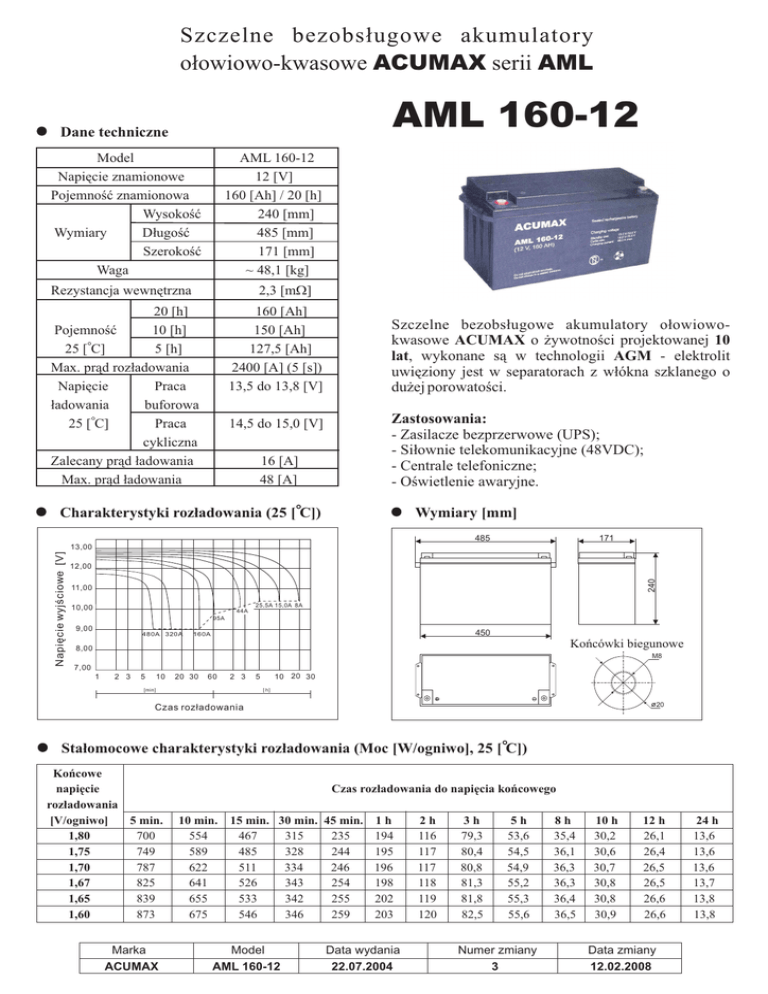 Szczelne bezobs³ugowe akumulatory o³owiowo-kwasowe ACUMAX serii AML AML 160-12 Dane techniczne Model Napiêcie znamionowe Pojemnoœæ znamionowa Wysokoœæ Wymiary D³ugoœæ Szerokoœæ Waga AML 160-12 12 [V] 160 [Ah] / 20 [h] 240 [mm] 485 [mm] 171 [mm] ~ 48,1 [kg] Rezystancja wewnêtrzna 2,3 [mW] 20 [h] Pojemnoœæ 10 [h] 25 [ C] 5 [h] Max. pr¹d roz³adowania Napiêcie Praca ³adowania buforowa 25 [ C] Praca cykliczna Zalecany pr¹d ³adowania Max. pr¹d ³adowania 160 [Ah] 150 [Ah] 127,5 [Ah] 2400 [A] (5 [s]) 13,5 do 13,8 [V] Szczelne bezobs³ugowe akumulatory o³owiowokwasowe ACUMAX o ¿ywotnoœci projektowanej 10 lat, wykonane s¹ w technologii AGM - elektrolit uwiêziony jest w separatorach z w³ókna szklanego o du¿ej porowatoœci. Zastosowania: - Zasilacze bezprzerwowe (UPS); - Si³ownie telekomunikacyjne (48VDC); - Centrale telefoniczne; - Oœwietlenie awaryjne. 14,5 do 15,0 [V] 16 [A] 48 [A] Charakterystyki roz³adowania (25 [ C]) Wymiary [mm] 171 485 12,00 240 Napiêcie wyjœciowe [V] 13,00 11,00 25,5A 15,0A 8A 10,00 44A 95A 9,00 480A 320A 450 160A Koñcówki biegunowe 8,00 M8 7,00 1 2 3 5 10 20 30 60 2 3 10 20 30 5 [ h] [min] 20 Czas roz³adowania Sta³omocowe charakterystyki roz³adowania (Moc [W/ogniwo], 25 [ C]) Koñcowe napiêcie roz³adowania [V/ogniwo] 5 min. 1,80 700 1,75 749 1,70 787 1,67 825 1,65 839 1,60 873 Marka ACUMAX Czas roz³adowania do napiêcia koñcowego 10 min. 554 589 622 641 655 675 15 min. 30 min. 45 min. 467 315 235 485 328 244 511 334 246 526 343 254 533 342 255 546 346 259 Model AML 160-12 1h 194 195 196 198 202 203 Data wydania 22.07.2004 2h 116 117 117 118 119 120 3h 79,3 80,4 80,8 81,3 81,8 82,5 5h 53,6 54,5 54,9 55,2 55,3 55,6 Numer zmiany 3 8h 35,4 36,1 36,3 36,3 36,4 36,5 10 h 30,2 30,6 30,7 30,8 30,8 30,9 12 h 26,1 26,4 26,5 26,5 26,6 26,6 Data zmiany 12.02.2008 24 h 13,6 13,6 13,6 13,7 13,8 13,8 Wp³yw temperatury na charakterystyki roz³adowania 20 10 Czas roz³adowania [h] 25 C 5 2 0C 1 50 -20 C [min] 20 10 5 2 5 10 20 50 100 200 Pr¹d roz³adowania [A] 500 1000